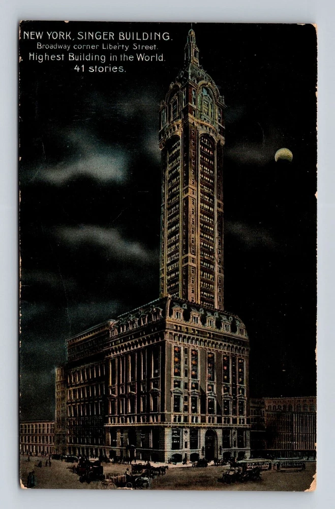 New York City, Night View Singer Building, Antique Souvenir Vintage Postcard