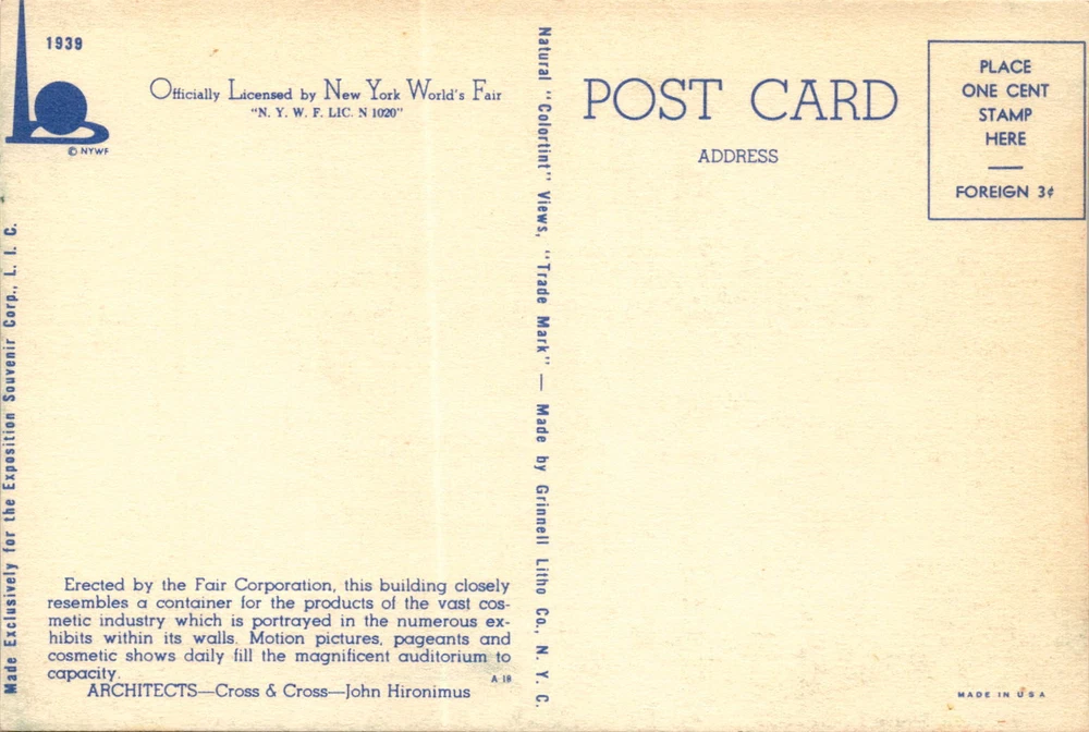 MAKE AN OFFER. THE MORE YOU BUY THE BETTER DEAL I WILL ACCEPT The postcard is from the New York World's Fair of 1939, specifically showcasing the Cosmetics Building. This building was erected by the Fair Corporation and was designed by architects Cross & Cross and John Hironimus. It was made exclusively for the Exposition Souvenir Corp. in Long Island City.