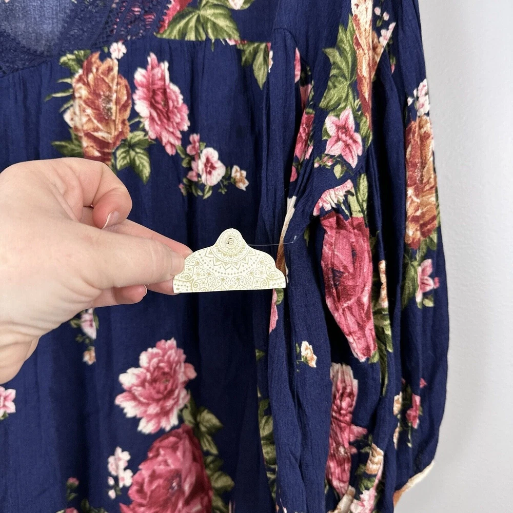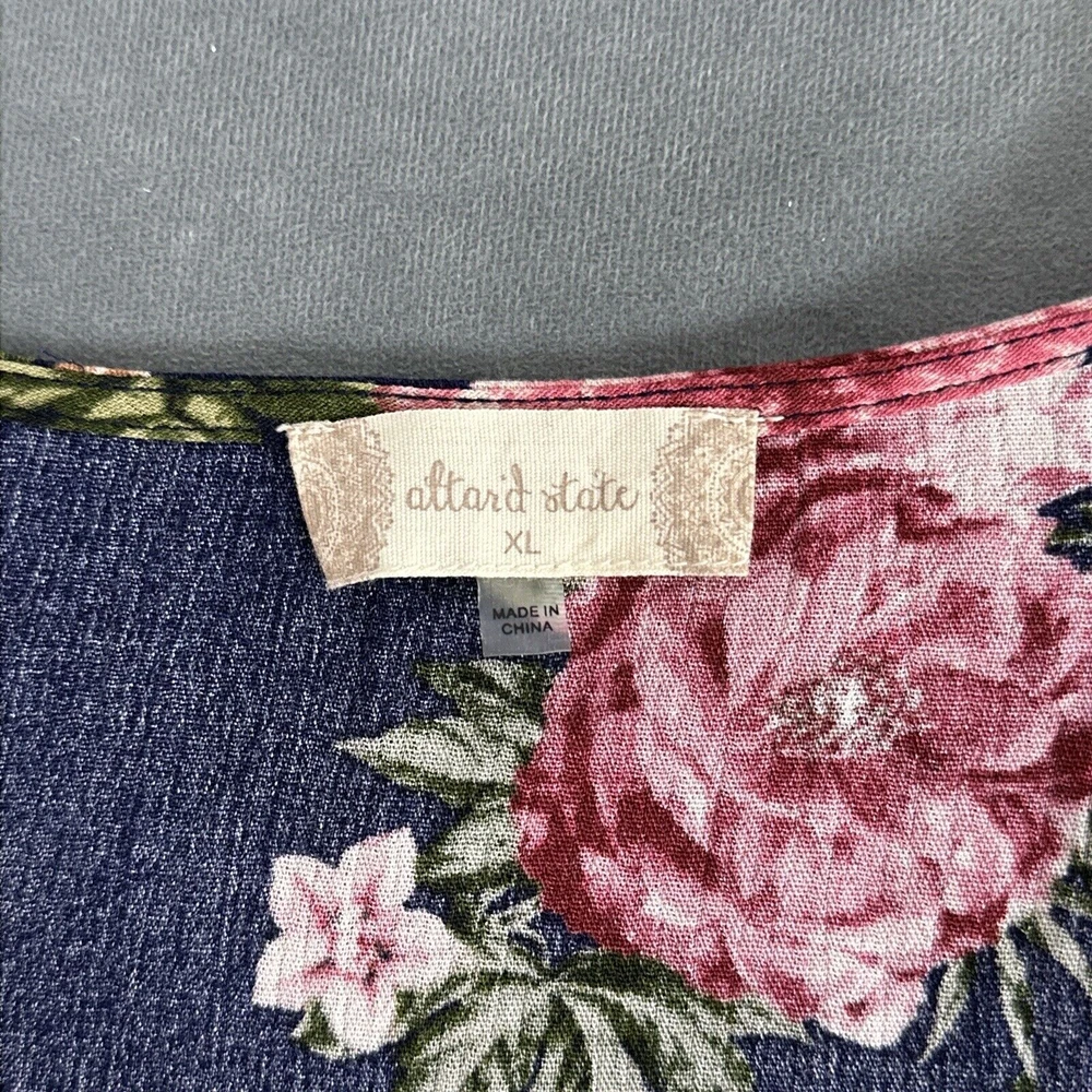 Listed is a altar'd state peasant style swing top, V-neck, babydoll style. Dark blue with floral print. 3/4 sleeve. Crochet style lace surrounding v-neck. Size: XL Fabric: 100% rayon Condition: New with tag Measurements: Lying flat, from underarm to underarm across chest: 28" across bust Lying flat, from shoulder to bottom of shirt: 24" (26" shoulder to bottom in back, slight hi-low style) Shipping cost is calculated to USPS costs based on weight of items. Thank you for looking, please message with any questions!