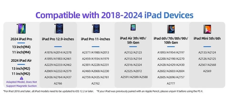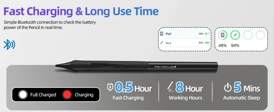 【PATENTED ERGONOMIC DESIGN】 The Penstudio PS-X iPad Pencil features a comfortable design with a 0.65°tapered shape that ensures a natural and fatigue-free drawing experience. Its soft rubber grip provides precise control and enhanced drawing accuracy, making it the perfect tool and gift. 【CUTTING-EDGE SIGNAL ADJUSTER FOR ALL TIPS】 Supported by advanced algorithms of the P2 chip, PS-X Stylus Pen for iPad delivers an exceptional 0.1mm pixel precision without any perceptible delay, guaranteeing accuracy and responsiveness across a wide range of tip options. You can swap between soft, basic and metal tips to customize your iPad drawing/writing experience while maintaining the precision and performance of the Penstudio PS-X iPad Pen. ❗❗ NOTE: Recommend tips that work with pencil 1st/2nd gen. They are compatible with Penstudio PS-X too. 【CUSTOMIZABLE SIDE BUTTON】 Penstudio PS-X iPad Stylus‘s programmable button can be customized using the intuitive Penstudio App. You can assign personalized functions to the side button with single/double/triple presses, such as changing tool from highlighter to lasso, activating an eraser, or starting recording when in your lecture or accessing frequently used tools. PS-X iPad Stylus streamlines your creative process and boosts productivity! ❗❗ NOTE: Only available in General, and 4 Apps: Goodnotes, Notability, Paint and Procreate. 【PALM REJECTION & FIND PENCIL FOR SEAMLESS USE】 With palm rejection technology, you can write and draw without worrying about accidental screen touches, enhancing your overall user experience. ❗❗ NOTE: Wireless Charging is NOT Supported. NO Magnet Attach for iPad Pro M4, iPad Air M2, iPad Air 3rd Gen, iPad 6th/7th/8th/9th/10th Gen, iPad mini 5th. 【2X FASTER CHARGE & INSTANT BATTERY INDICATOR】 Penstudio's leading fast charge tech, and longer battery life is not a blast. With just 30 minutes of charging, you get 8 hours of battery life. Charge 4 mins = work 100 mins. This triumphs over most ipad pen brands. With an instant battery % widget on your iPad, you can focus on your work or studies without worrying about running low on battery. 【COMPATIBILITY CHECK FOR 2018-2025 IPAD】 Please confirm your iPad's compatibility before purchase! Penstudio iPad Pencil PS-X specialized for NEW! 2024 iPad Air 11-inch & 13-inch (M4), iPad Pro 11-inch (M4), iPad Pro 13-inch (M4), Apple iPad (11th, 10th. 9th, 8th, 7th, 6th generation); iPad Air (7th, 6th, 5th, 3rd, 4th Gen); iPad Pro 12.9" (6th, 5th, 4th, 3rd Gen); iPad Pro 11" (5th, 4th, 3rd, 2nd & 1st Gen); iPad mini (6th and 5th Gen). Method: Settings > Tap General > Tap About > Model name [iPad XX (X generation)].