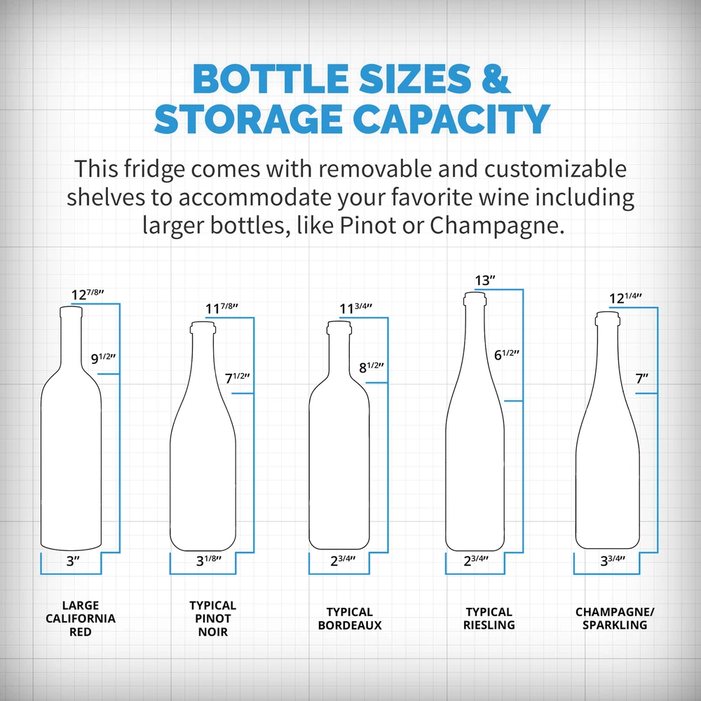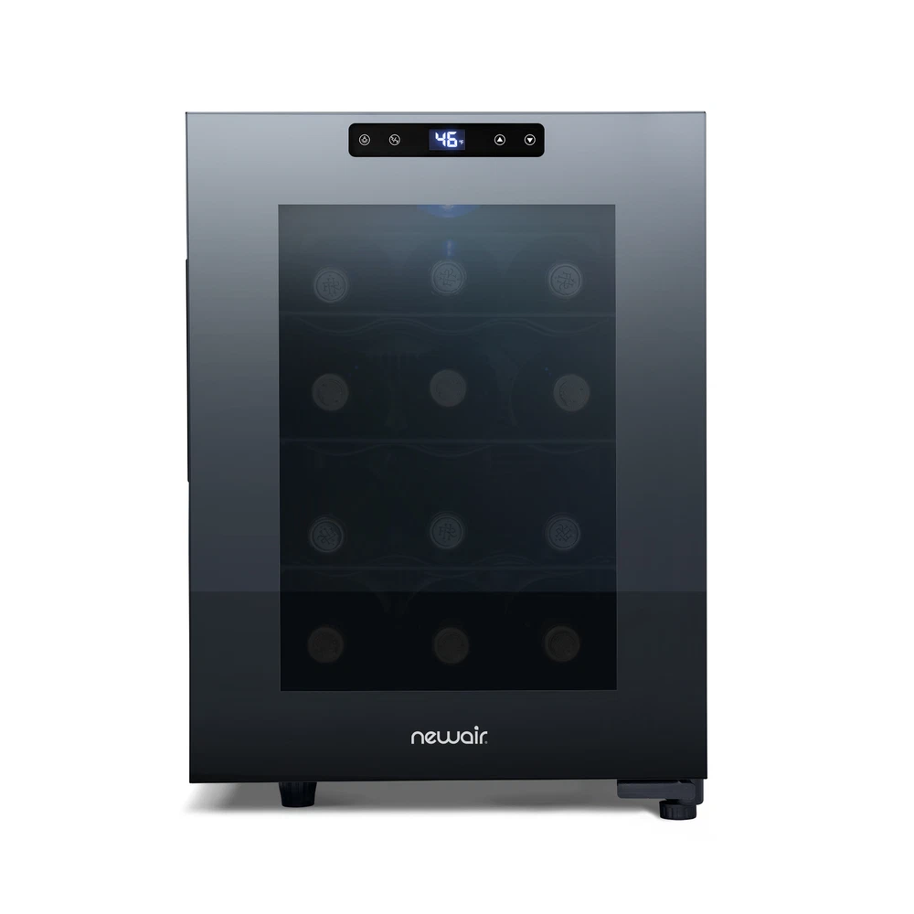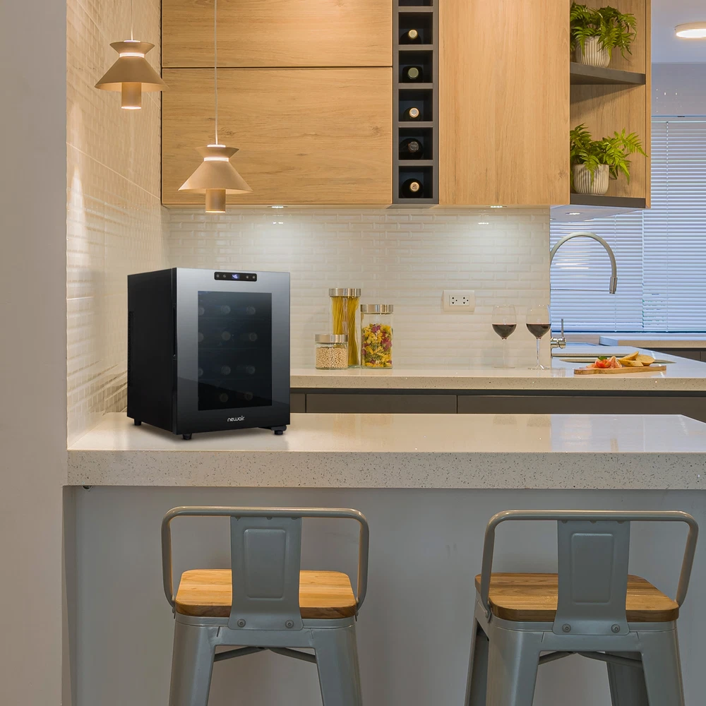 This countertop wine cellar is designed to be seen and not heard. The Newair Shadow-T Series 12 Bottle Thermoelectric Wine Fridge delivers the ultimate storage system for your collection, whether you’re new to wine or a lifelong connoisseur. Ultra-quiet thermoelectric cooling eliminates vibrations that can disturb sediment and destroy the delicate flavors of your wine. The sleek, compact design features a black mirrored glass door with a frameless design and hidden hinge. The triple-pane glass blocks harmful UV rays to protect your wine’s flavor and aroma while resisting smudges and fingerprints. This modern and durable wine mini fridge boasts a user-friendly control panel that is seamlessly built into the glass, making it effortless to select the perfect temperature for your reds, whites, and sparklers. Preserve Wine Perfectly With Vibration-Free Cooling Ultra-quiet thermoelectric cooling minimizes vibrations that can stir up sediment and ruin the flavor of your wine. It also uses less electricity than traditional compressor refrigerators, so you can spend less on energy bills and more on your wine collection. Frameless Mirrored Door With Triple-Pane Glass Triple-paned glass provides excellent insulation to keep harmful heat and UV light out of your fridge and away from your wine. The black mirrored glass resists fingerprints and smudges, so it always looks sharp. The control panel is built right into the glass for a streamlined look and added durability, and there’s an easy-to-read LCD touchscreen display. Compact, Freestanding Design At just 10 inches wide and under two feet high, this compact cooler is the perfect size for countertop wine storage. The integrated, hidden hinge and recessed handle save even more space for a sleek design that works in kitchens, home bars, media rooms, and more. Soft LED and Black Shelves Wine flavors are delicate, which is why the Newair Shadow-T Series wine fridge features a blue, soft LED light that illuminates your collection without emitting harmful heat like a standard lightbulb. Coated wire shelves grip and cradle wine bottles for easy organization.