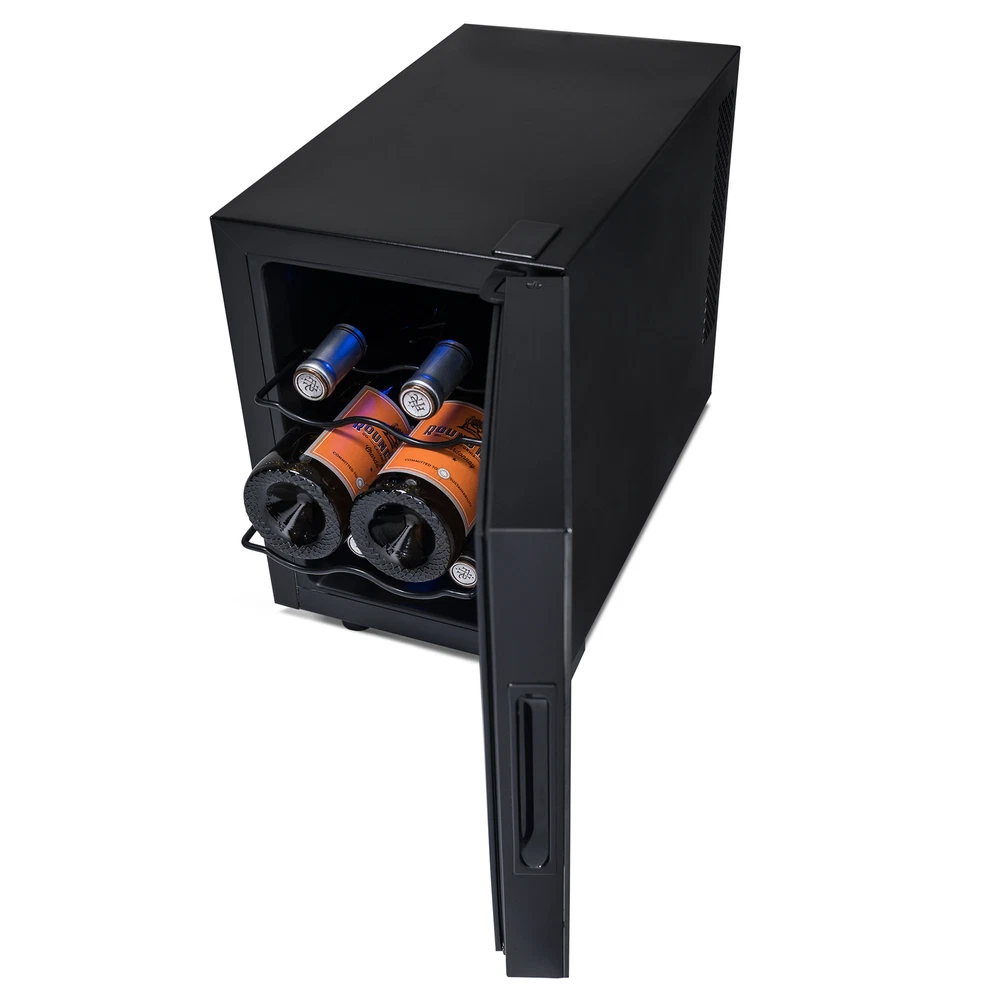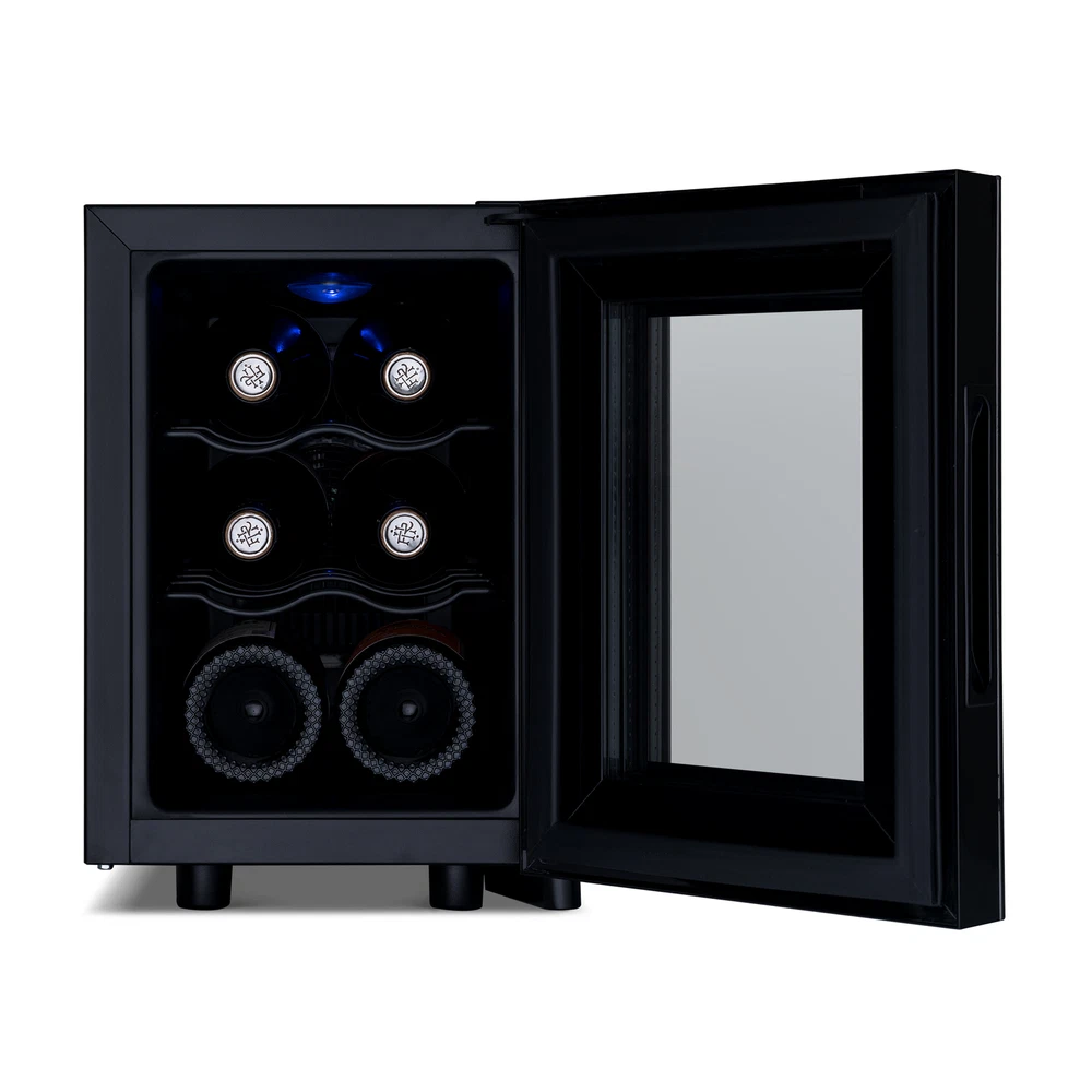 This countertop wine cellar is designed to be seen and not heard. The Newair Shadow-T Series 6 Bottle Thermoelectric Wine Fridge delivers the ultimate storage system for your collection, whether you’re new to wine or a lifelong connoisseur. Ultra-quiet thermoelectric cooling eliminates vibrations that can disturb sediment and destroy the delicate flavors of your wine. The sleek, compact design features a black mirrored glass door with a frameless design and hidden hinge. The triple-pane glass blocks harmful UV rays to protect your wine’s flavor and aroma while resisting smudges and fingerprints. This modern and durable wine mini fridge boasts a user-friendly control panel that is seamlessly built into the glass, making it effortless to select the perfect temperature for your reds, whites, and sparklers. Preserve Wine Perfectly With Vibration-Free Cooling Ultra-quiet thermoelectric cooling minimizes vibrations that can stir up sediment and ruin the flavor of your wine. It also uses less electricity than traditional compressor refrigerators, so you can spend less on energy bills and more on your wine collection. Frameless Mirrored Door With Triple-Pane Glass Triple-paned glass provides excellent insulation to keep harmful heat and UV light out of your fridge and away from your wine. The black mirrored glass resists fingerprints and smudges, so it always looks sharp. The control panel is built right into the glass for a streamlined look and added durability, and there’s an easy-to-read LCD touchscreen display. Compact, Freestanding Design At just 10 inches wide and under two feet high, this compact cooler is the perfect size for countertop wine storage. The integrated, hidden hinge and recessed handle save even more space for a sleek design that works in kitchens, home bars, media rooms, and more. Soft LED and Black Shelves Wine flavors are delicate, which is why the Newair Shadow-T Series wine fridge features a blue, soft LED light that illuminates your collection without emitting harmful heat like a standard lightbulb. Coated wire shelves grip and cradle wine bottles for easy organization.