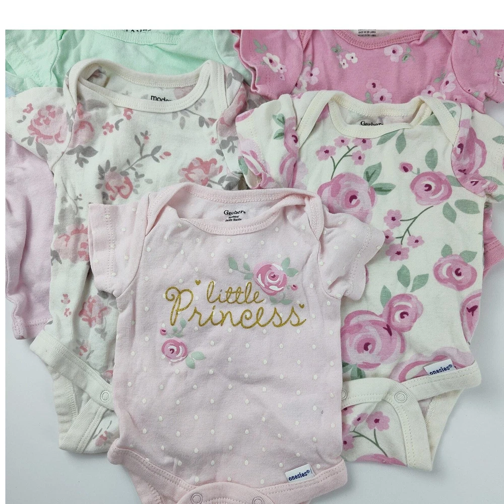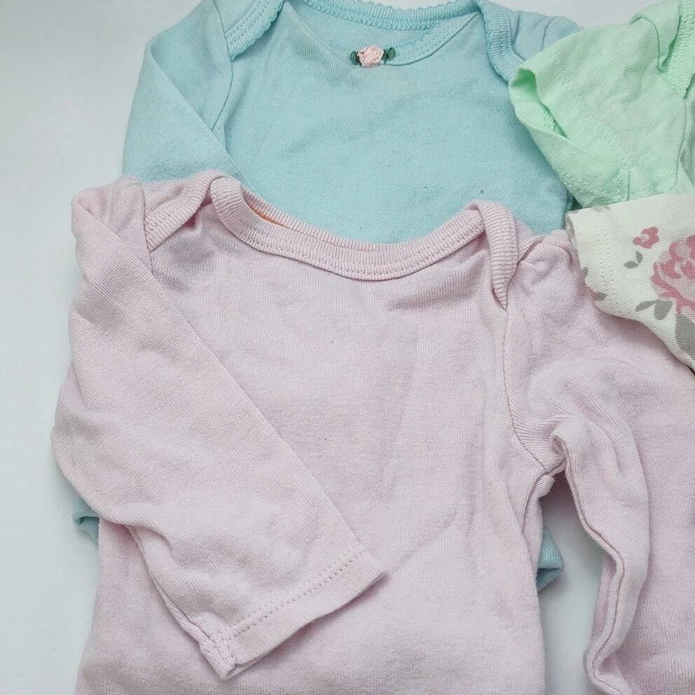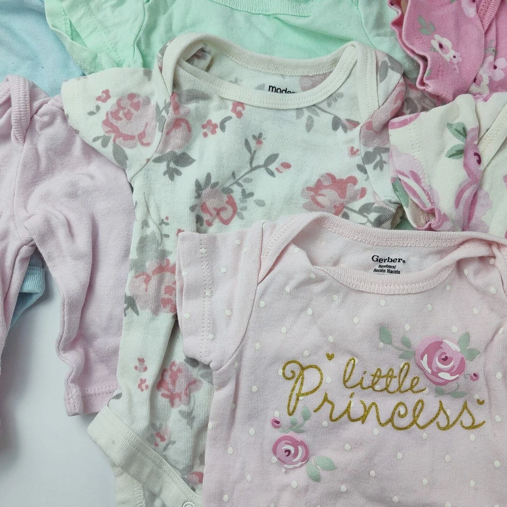 A sweet newborn baby bodysuit bundle featuring a variety of cozy and colorful pieces! Includes: a pink long-sleeve bodysuit from Cloud Island, a baby blue long-sleeve bodysuit with a cute pink flower, a pink floral short-sleeve bodysuit from Gerber, three white short-sleeve bodysuits, and a mint green short-sleeve bodysuit from Free Planet. Perfect for keeping your newborn comfortable and stylish, this bundle offers a mix of adorable prints and soft fabrics. Don’t miss out—add this essential set to your baby’s wardrobe today!