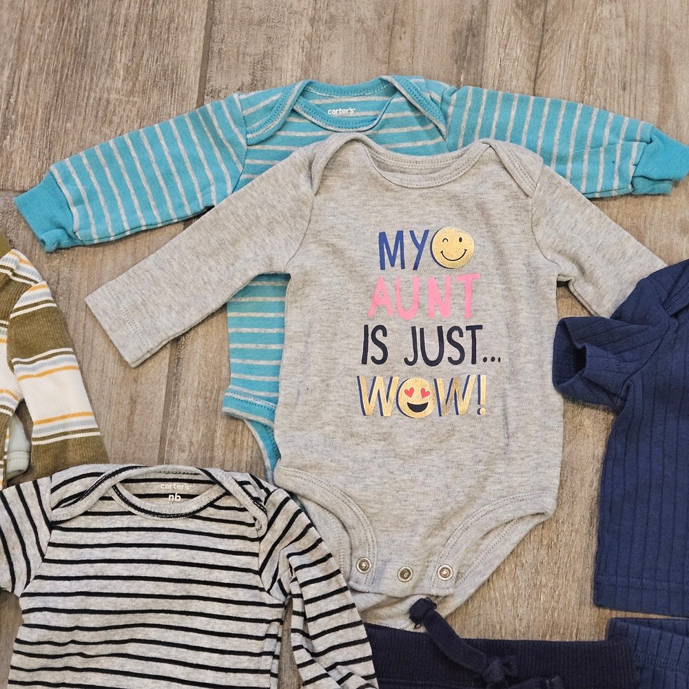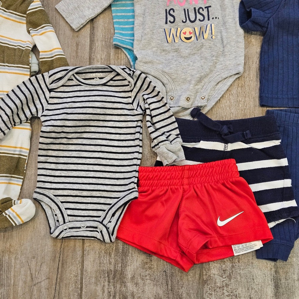 Newborn Baby Boy Clothes Lot Mixed Styles Pajamas Onesies Pants Jacket Bundle Zak & Zoey hats 0-12 months Cherokee Hoodie Newborn Carters, Nike, Koala kids Description: Newborn baby boy clothing lot with a mix of sleepers, onesies, pants, overalls, shorts, tops, and a cozy zip-up jacket. Most pieces are pre-owned in good condition with normal wash wear, and a few items are new with tags. Great starter bundle with a variety of everyday essentials. Keywords: Baby Essentials, Layette Bundle, Newborn Capsule Wardrobe, Minimalist Baby, Neutral Babywear, Soft Cotton, Everyday Basics, Cozy Layers, Baby Boy Outfit Set, Shower Gift, New Mom Must Haves