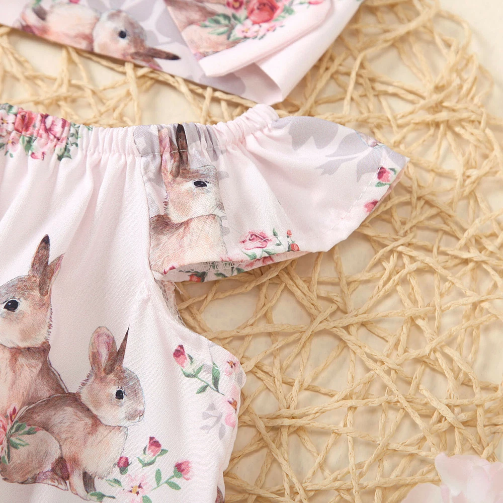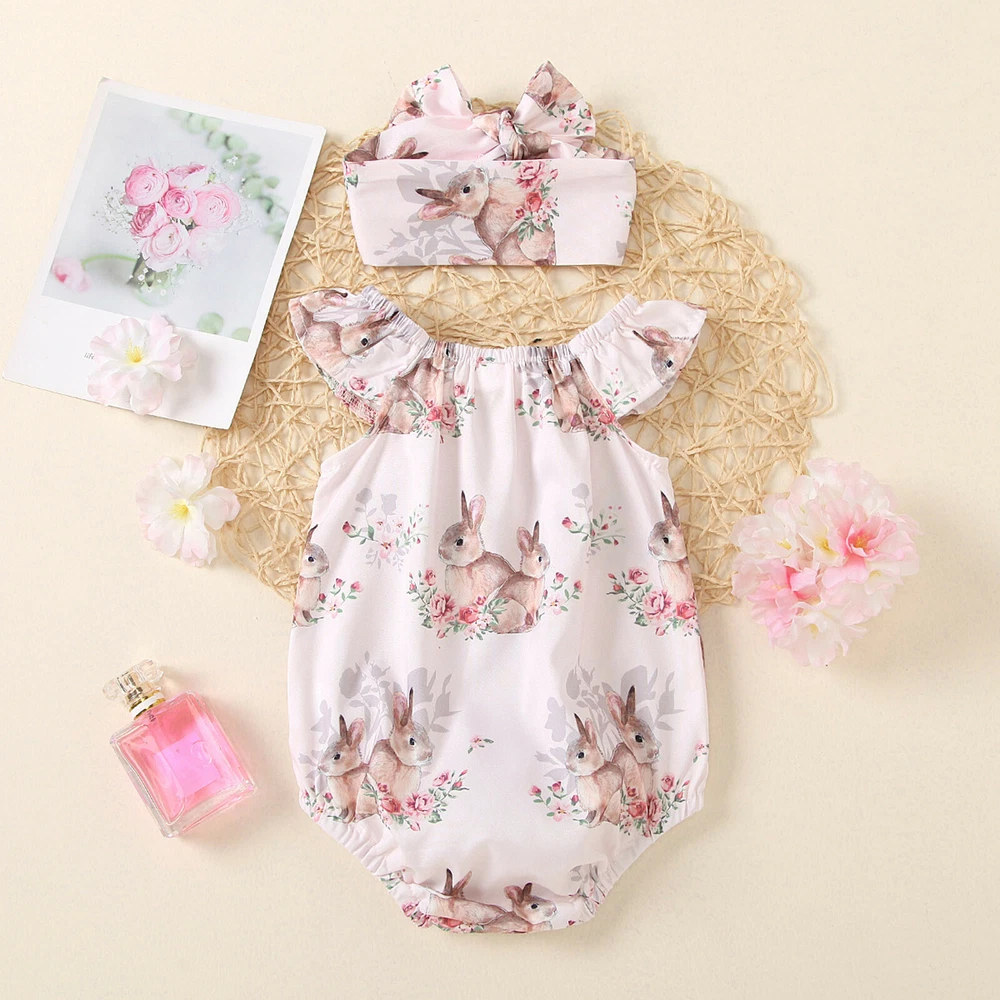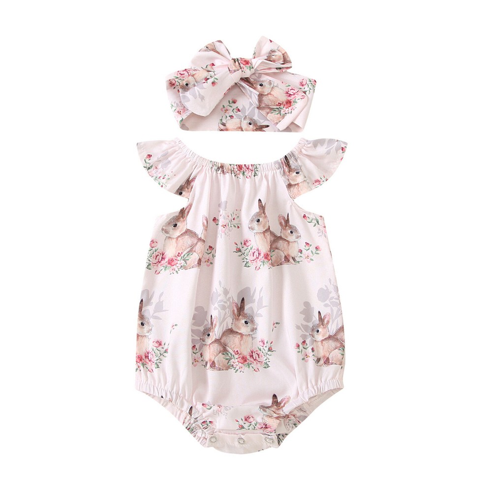 Newborn Baby Girl Easter Bunny Printed Outfit Bodysuit Romper Headband Set 0-24M