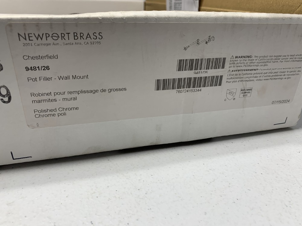 This is a NEW - unused Newport Brass 9481/26 Chesterfield Pot Filler Wall Mount Polished Chrome Buyers and Re-sellers, don't miss this opportunity to purchase quality surplus equipment at a great price! There are many more surplus parts on our store, check it out! Return Policy: Returns are accepted within 60 days of the delivery date. Rest assured we will cover all return shipping costs! All returns must be in "as shipped" original condition to qualify for a refund. Photos of packing and product is required for damaged items. Customer returns that satisfy all of the above requirements will be issued a refund including any applicable sales tax Newport Brass 9481 Features: Covered under Newport Brass's limited lifetime warranty and limited lifetime commercial warranty Faucet body constructed of brass Single hole mounting type Wall mounted faucet installs on the wall directly above sink Swivel spout allows for greater access to all areas of the sink 2 cross handles control the flow and temperature of water Includes cartridge Mounting hardware included Low lead compliant Newport Brass 9481 Specifications: Height: 7-15/16" Spout Reach: 21-3/16" (center of faucet body to center of spout outlet) Flow Rate: 4.5 gallons-per-minute Faucet Holes: 1 (holes needed to install faucet)