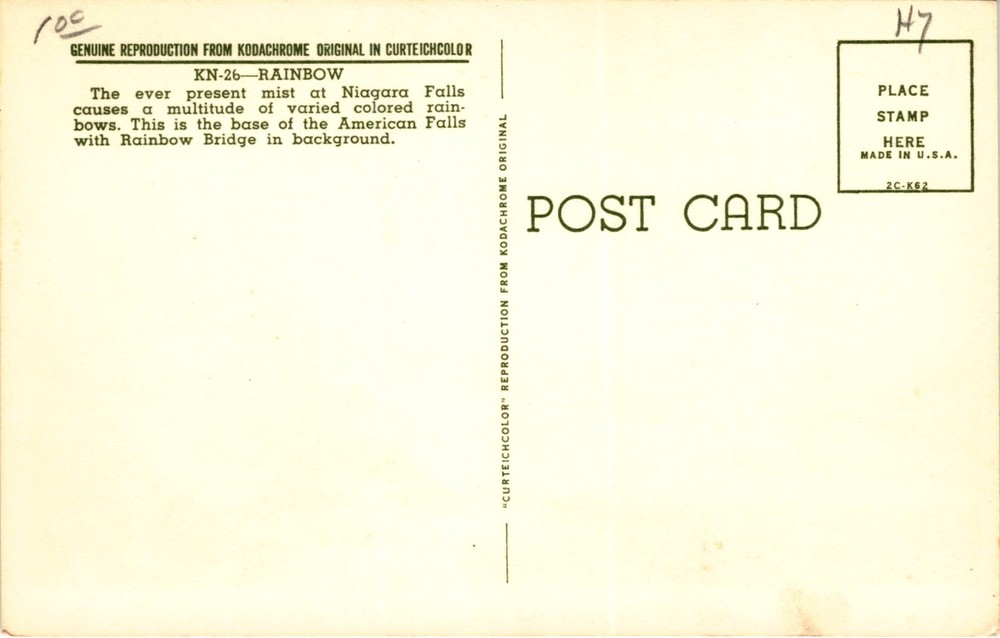This postcard features a view of a rainbow and a bridge seen through the mist at Niagara Falls. The mist at Niagara Falls creates a stunning display of colorful rainbows, with this particular image capturing the base of the American Falls with Rainbow Bridge in the background.Niagara Falls is a famous waterfall located on the border of the United States and Canada.