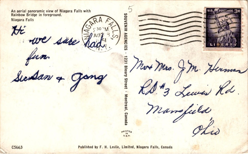 The front of the postcard features an aerial panoramic view of Niagara Falls with the Rainbow Bridge in the foreground. Niagara Falls is a famous set of waterfalls located on the border between the United States and Canada. The falls consist of three separate waterfalls: the American Falls, the Bridal Veil Falls, and the Horseshoe Falls.