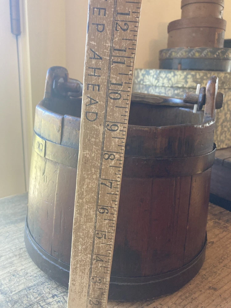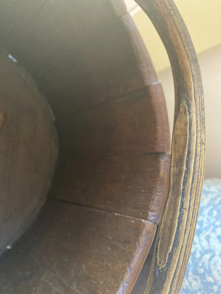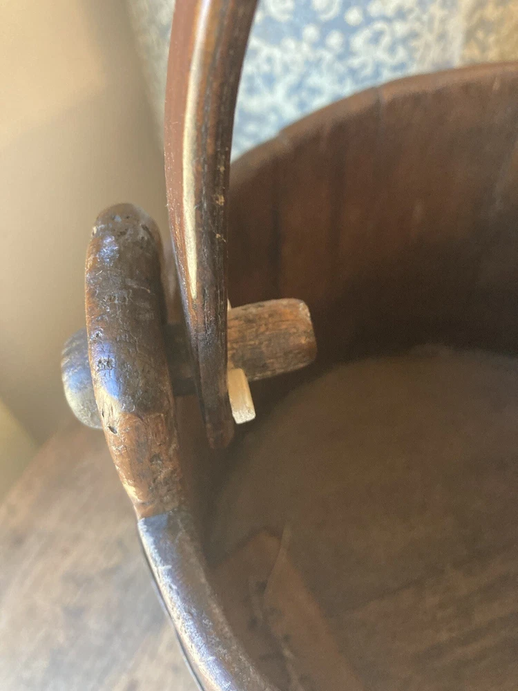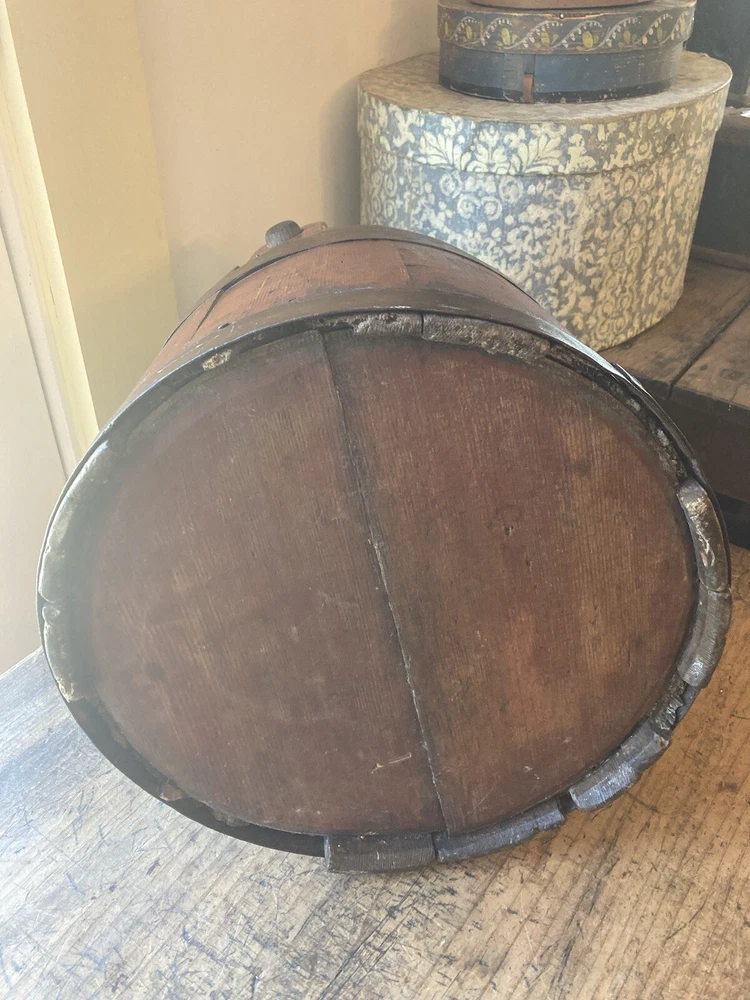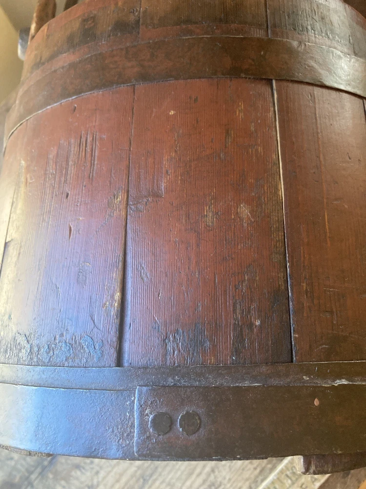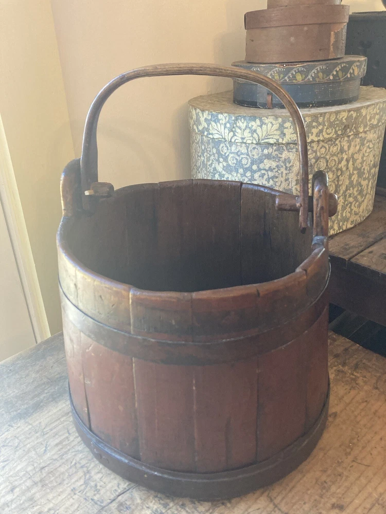For sale is an aesthetically pleasing antique primitive wooden staved bucket with original red paint and a swing handle in Excellent condition. Highly attractive ox blood paint! All staves are solid and the iron bands are all wrought iron and also solid and stable. There are two hoops overlapping for the lower one which is uncommon but both hoops are old and handmade. See pictures. One of the peg/pin for the swing handle is replaced. Some loss to the bottom rim but sits stably with no wobble. It's rare to find such solid bucket like this. It would look great as part of a primitive display. Such buckets with wooden lap were used in the 19th C and earlier. About 11" diameter by 9" tall to the rim Please feel free to check out my other antique and collectible listings. I gladly combine shipping whenever practical.