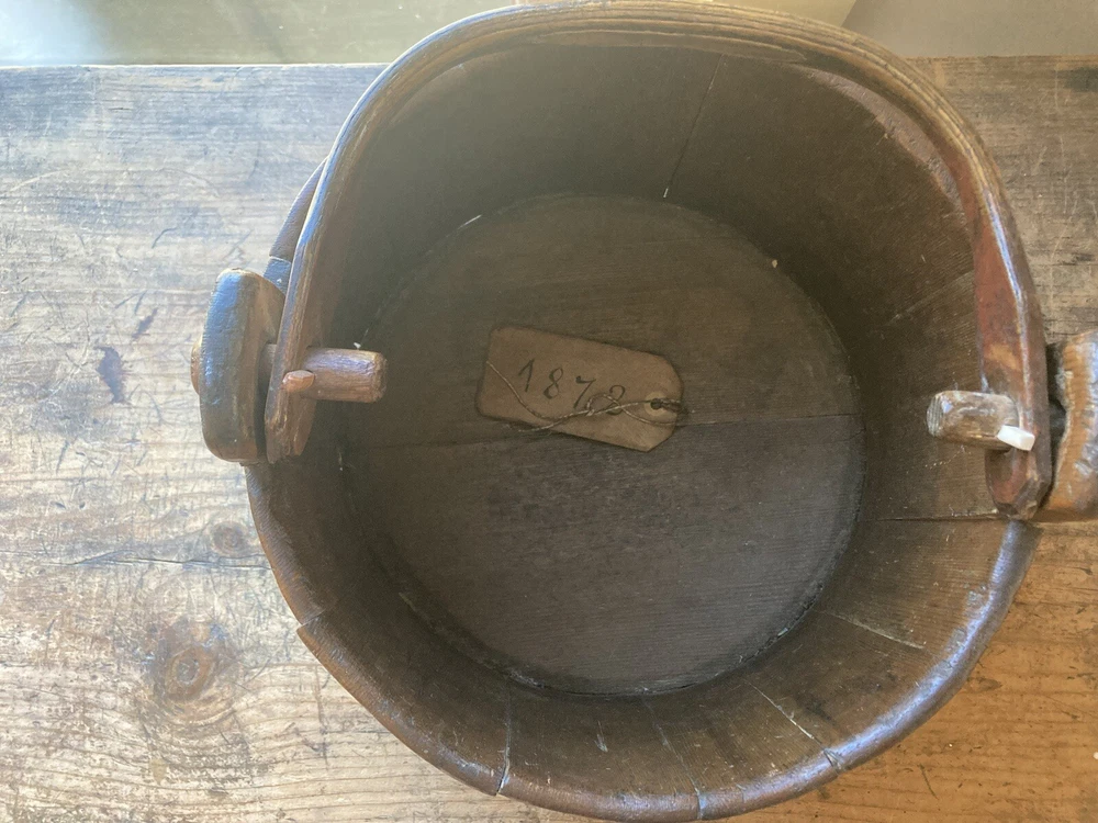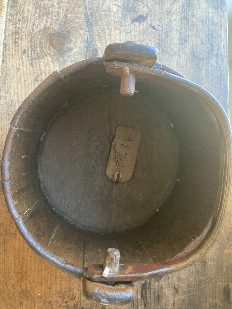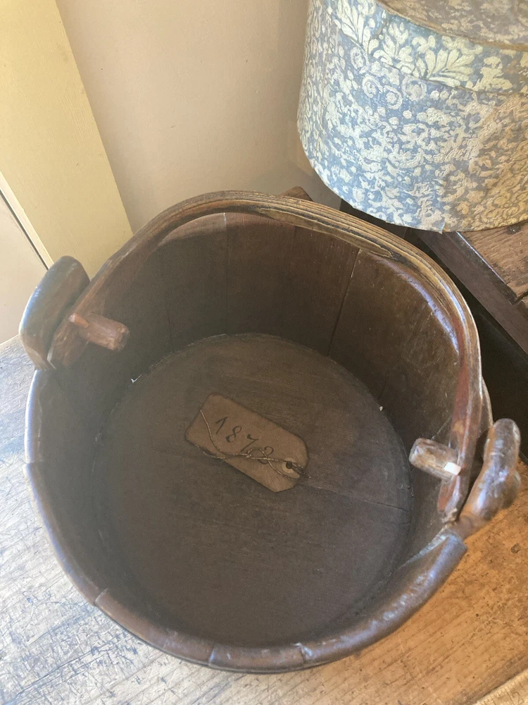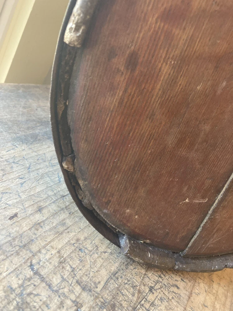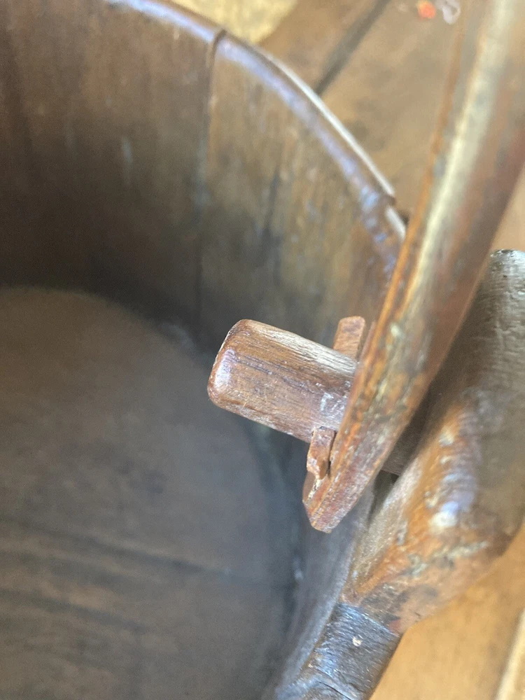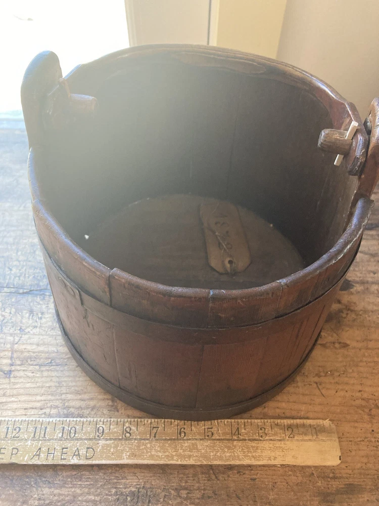 For sale is an aesthetically pleasing antique primitive wooden staved bucket with original red paint and a swing handle in Excellent condition. Highly attractive ox blood paint! All staves are solid and the iron bands are all wrought iron and also solid and stable. There are two hoops overlapping for the lower one which is uncommon but both hoops are old and handmade. See pictures. One of the peg/pin for the swing handle is replaced. Some loss to the bottom rim but sits stably with no wobble. It's rare to find such solid bucket like this. It would look great as part of a primitive display. Such buckets with wooden lap were used in the 19th C and earlier. About 11" diameter by 9" tall to the rim Please feel free to check out my other antique and collectible listings. I gladly combine shipping whenever practical.