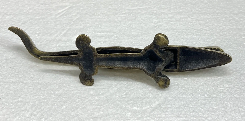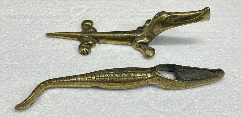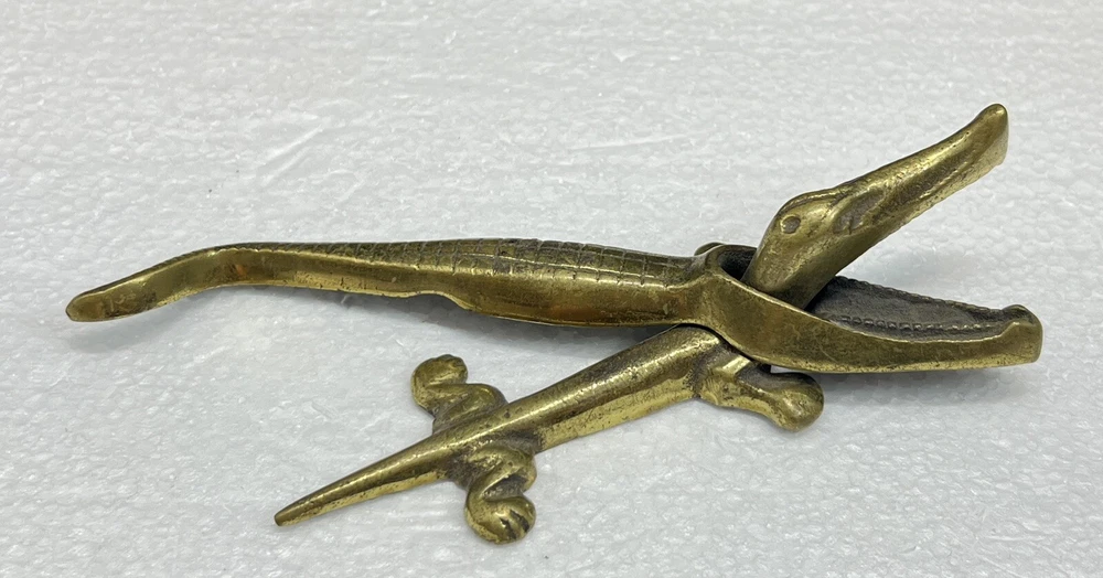 Nice Vintage Solid Brass Alligator Shaped Figural Nutcracker Measures approx. 6 1/2" long This one isn't made with a hinge, the top actually just slips over the bottom part of the body to interlock. Please see my pictures and ask any questions. WE WILL DEFINITELY COMBINE SHIPPING ON ANY OF OUR AUCTIONS IF SAFELY POSSIBLE! PICK YOUR ITEMS OUT AND I WILL SEND A COMBINED INVOICE.