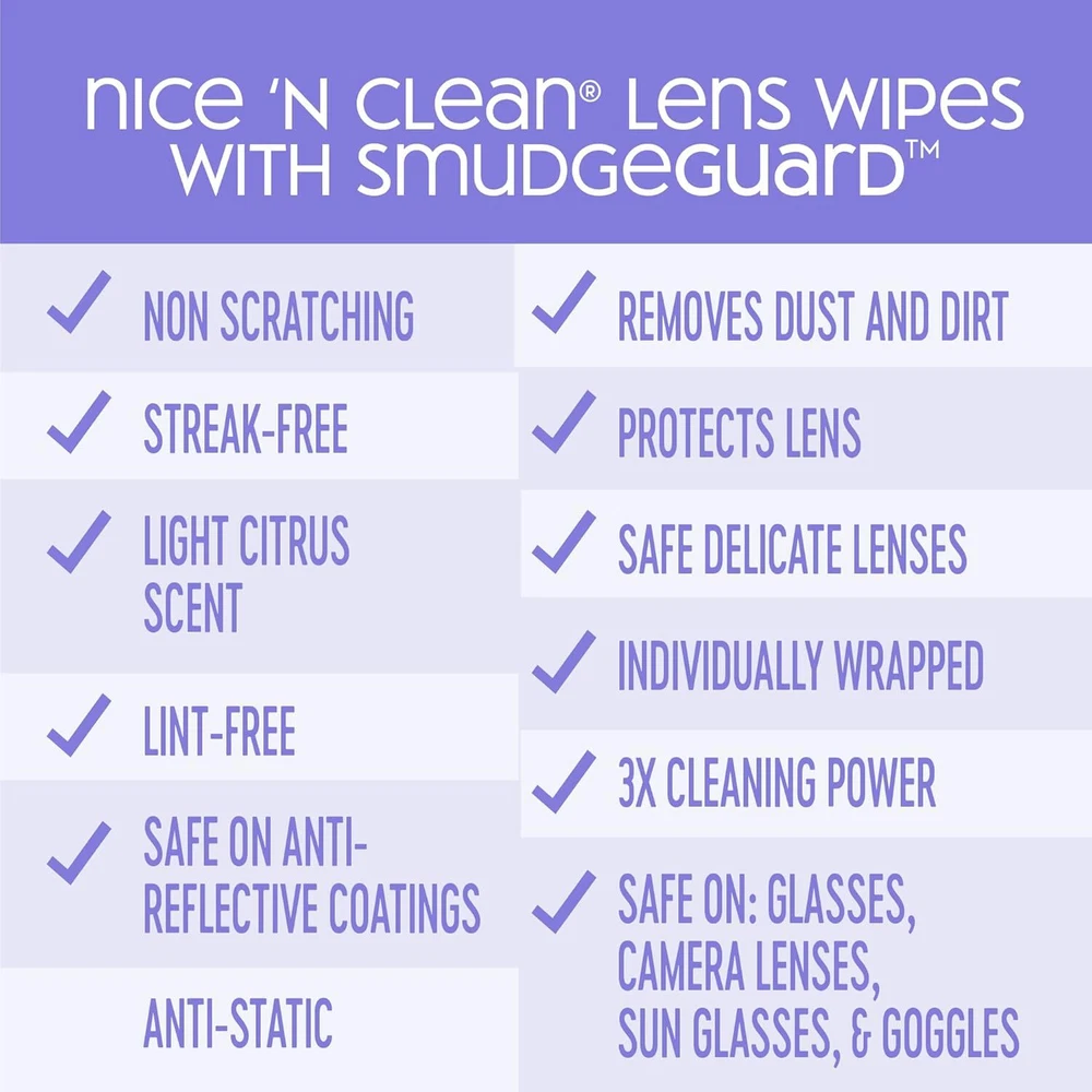 Nice 'n Clean SmudgeGuard Lens Cleaning Wipes (100 100 Count (Pack of 1) Product Details Product Dimensions : 3.07 x 4.53 x 3.94 inches; 9.91 ounces Item model number : X0001B100CH Manufacturer : Nice 'N Clean Scent: Citrus Brand: Nice 'N Clean Sheet Count: 100 Package Information: Box Item Form: Wipes EFFECTIVELY REMOVES DUST AND DIRT: Nice N' CLEAN SmudgeGuard Lens Cleaning Wipes gently remove dirt and dust from a variety of coated lenses. SmudgeGuard technology allows for 3X the cleaning power compared to our standard lens wipes! PROTECT YOUR LENS: Our pre-moistened lens wipes provide streak-free and scratch-free removal of dust, smudges, and fingerprints on eyeglasses, camera lenses, sunglasses, goggles, and safety eyewear. SAFE ON ALL DELICATE LENSES: With an ammonia-free formula, our wipes are effective and safe on glass lens, plastic lens, and anti-reflective coatings. They are suitable for device lenses too, including iPhone, computer, and laptop video camera lenses. INDIVIDUALLY-WRAPPED: Each wipe is pre-moistened (unlike microfiber cloths) and individually-wrapped for convenience and moisture retention. They can be used on-the-go and kept in purses, backpacks and more for use at home, school or office environments. MADE FROM PLANT-BASED FIBERS: Our wipes are made from sustainable, plant-based fibers! These wipes are free of dyes, parabens, chemical binders, alcohol, chlorine, phthalates, etc. Life moves fast, and you want to be there to take in every moment. Nice 'N CLEAN Lens Wipes gently remove dust and dirt from a variety of lenses without leaving streaks or scratches, giving you the clarity you need to truly enjoy life. SmudgeGuard technology allows for 3x the cleaning power while providing streak-free and scratch-free removal of dust, smudges, and fingerprints. Our pre-moistened and individually-wrapped wipes are designed for on-the-go convenience for travel and storage purposes. These lens wipes are perfect for glasses, eyeglasses, sunglasses, goggles, camera lenses, and binoculars.