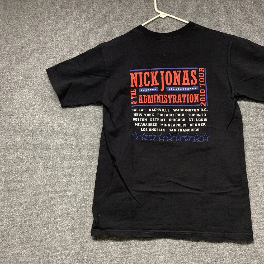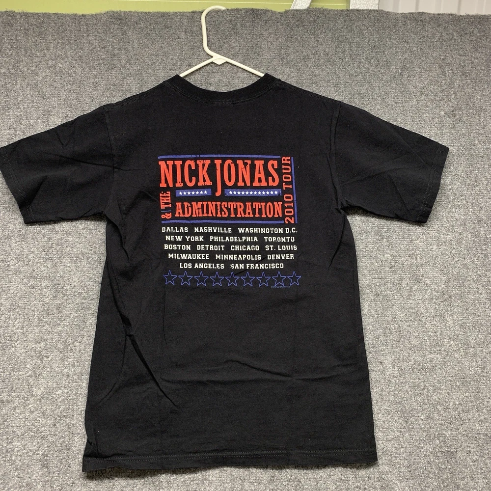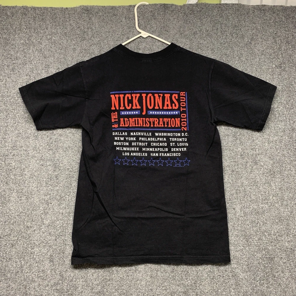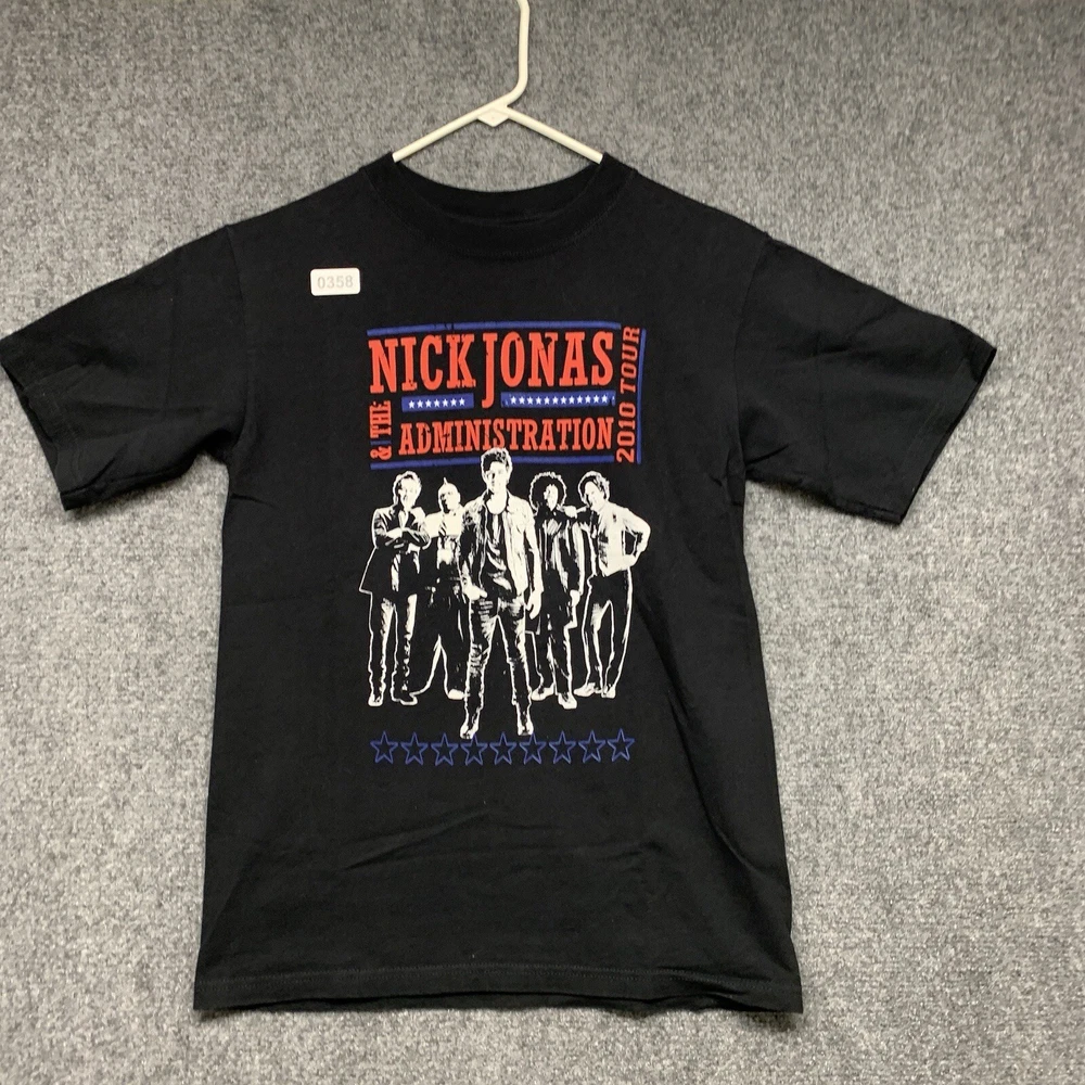 This Nick Jonas T-shirt from the 2010 tour is a must-have for any collector of music memorabilia. The shirt features a solid black color and short sleeves, made from soft and breathable cotton knit fabric. It has a regular fit and is available in adult size small, perfect for any Nick Jonas fan. The vintage T-shirt includes the Anvil brand logo and is suitable for all seasons. The shirt is lightweight and comfortable, making it great for concerts, festivals, or casual wear. It comes with a range of features, including heavyweight material and a classic 90s hip hop band theme.