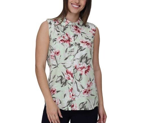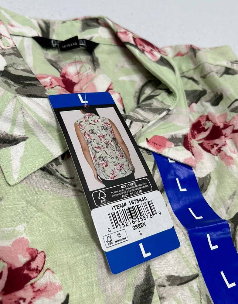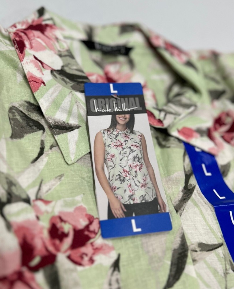 Nicole Miller Women's Linen Blend Sleeveless Top Size: Large Color: Green Content: 57% Linen 41% Viscose 2% Spandex Care Instructions: Machine wash cold with like colors Delicate cycle. Wash inside out. Do not bleach. Dry flat. Iron at low setting. Do not dry clean.