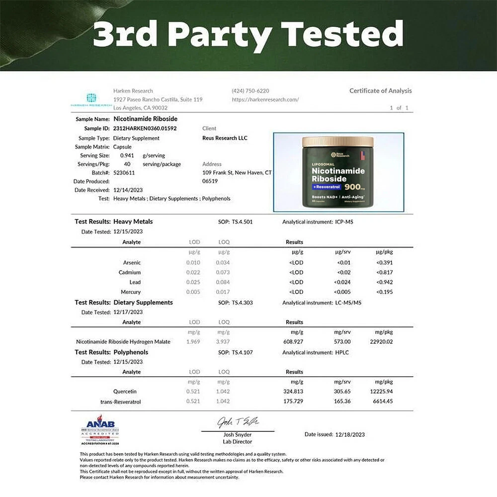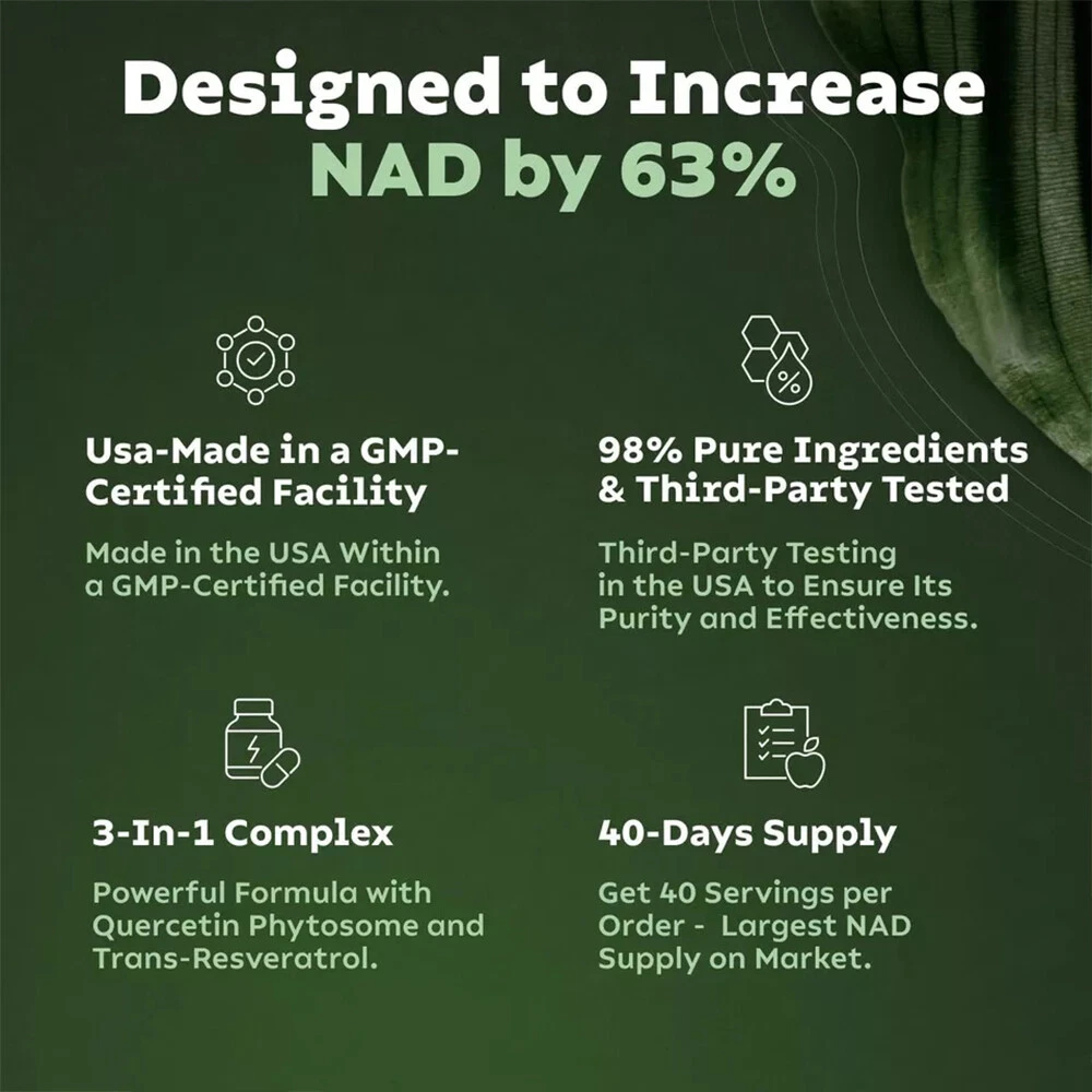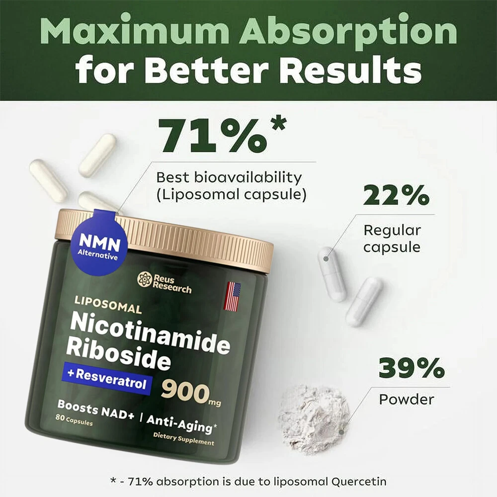 Important Information: Disclaimer: This product is intended to support health and wellness and should not be used as a substitute for medication. Measurement Tolerance: Please note that manual measurements may have a tolerance of 2-5g. We appreciate your understanding. Color Variation: Due to variations in monitor displays, the actual color of the product may differ slightly from the images provided. Packaging Notice: Suppliers may occasionally update the outer packaging. You may receive either the old or new packaging version, depending on availability. If you are particular about packaging, please consider this before purchasing. Key Benefits: Boost NAD Levels by 63%: Combat the effects of aging with our blend of Liposomal Nicotinamide Riboside, Resveratrol, and Quercetin. This potent combination enhances your body’s ability to absorb and utilize NAD precursors for noticeable results. Increase Absorption by 71%: Our advanced Liposomal encapsulation technology improves bioavailability, making this supplement 50% more effective than traditional delivery methods. Why Choose Our Supplement? Feel Revitalized: Daily use supports healthy aging, boosts energy production, enhances focus, and promotes longevity. Premium Ingredients: Made with a specially formulated blend of Liposomal Nicotinamide Riboside, Resveratrol, and Quercetin for maximum health benefits. Superior Bioavailability: Cutting-edge encapsulation technology ensures you receive the full benefits of each capsule. Rejuvenate your body and mind with our Liposomal Nicotinamide Riboside, Resveratrol, and Quercetin supplement. Embrace the benefits of healthy aging and renewed energy—order now!