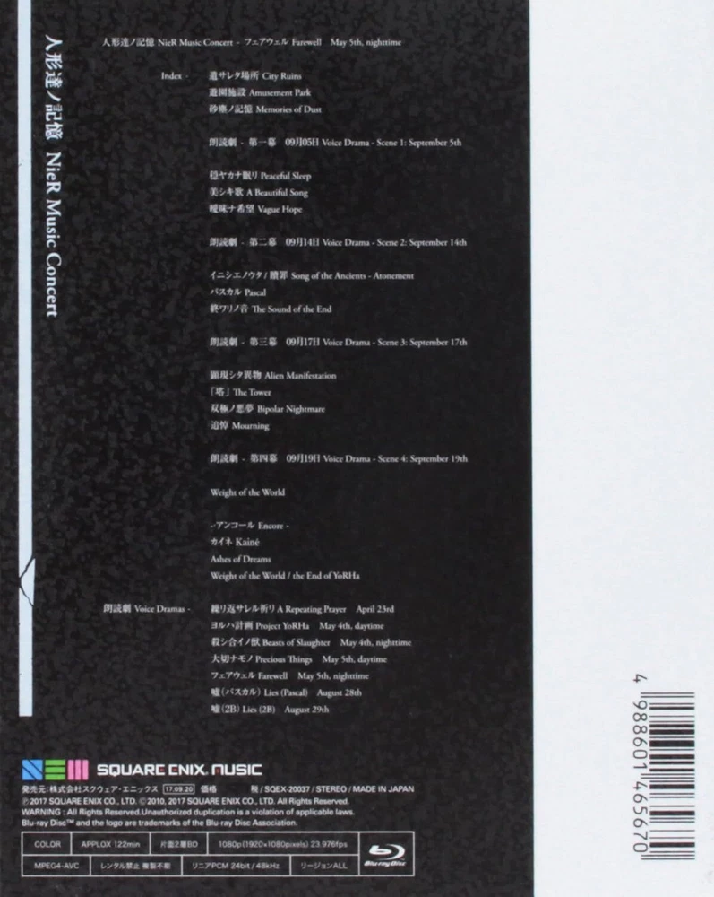 NieR Automata Music Concert Blu-ray - The Memories of Puppets - NEW Description Condition New Our products are 100% authentic, the item will be shipped from Japan. Shipping We always send the item with a tracking number. So please place an order without any concern on delivery. You can always track the delivery status. We use SpeedPAK Economy for shipping. Shipping is only available to the address registered in eBay. If you want us to send another address, please change your address on eBay and then place an order. Shipping is available from Monday to Friday. Weekends are not available because freight (shipping) companies are closed. We do not mark merchandise values below value or mark items as “gifts” – Japan, US and International government regulations prohibit such behavior. About Importer's Obligation Import duties, taxes, and charges are not included in the item price or shipping cost. These charges are the buyer's responsibility. Please check with your country's customs office to determine what these additional costs will be prior to bidding or buying. Thank you for your understanding.