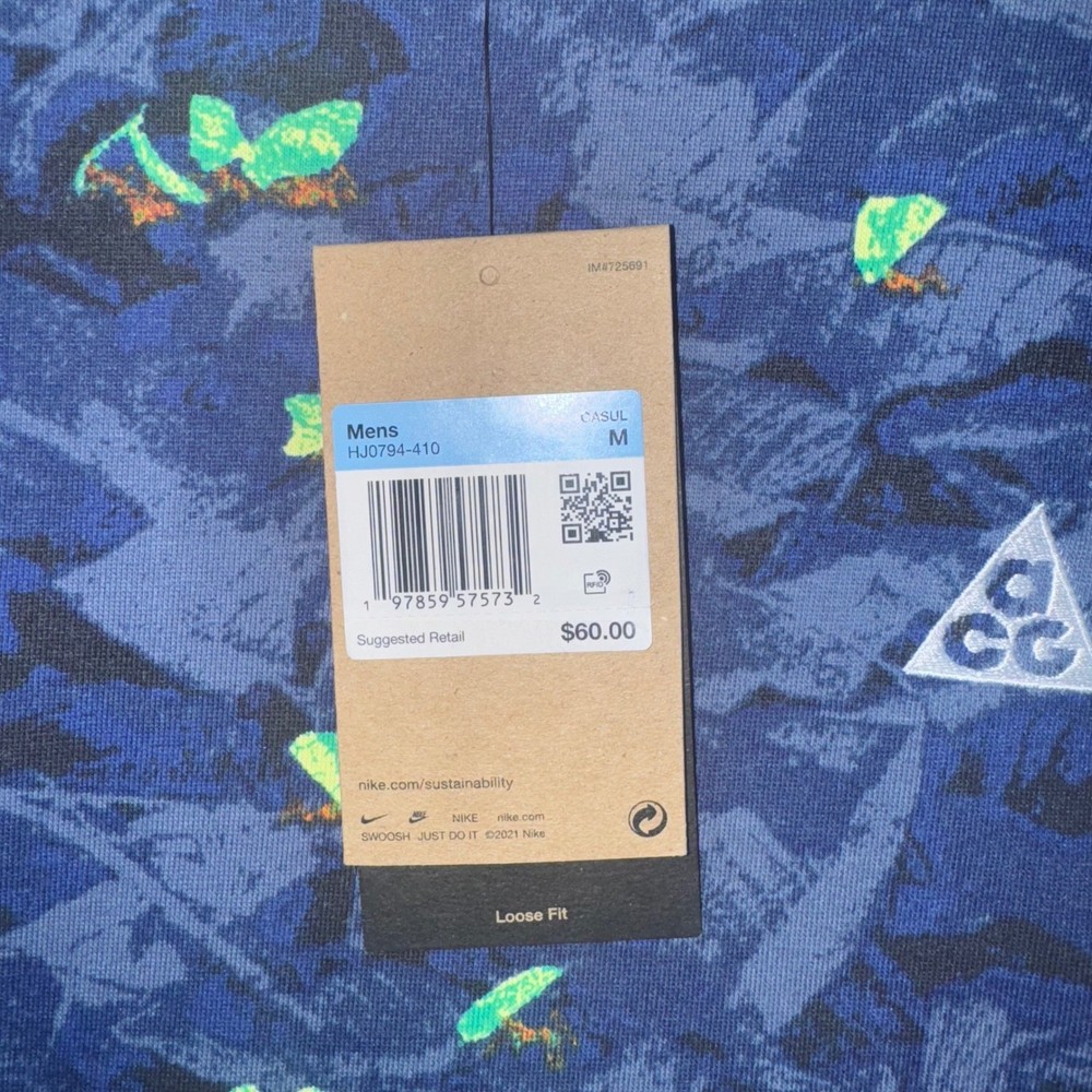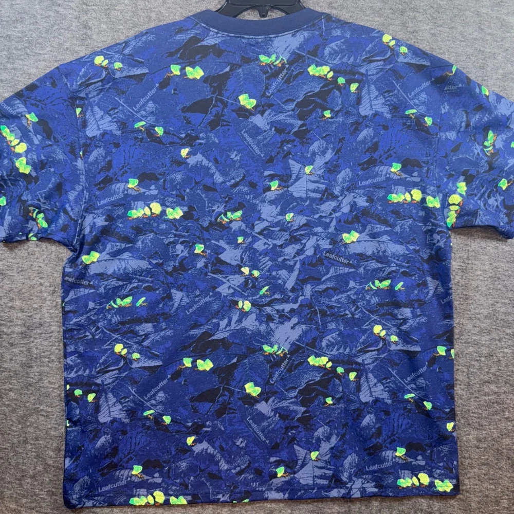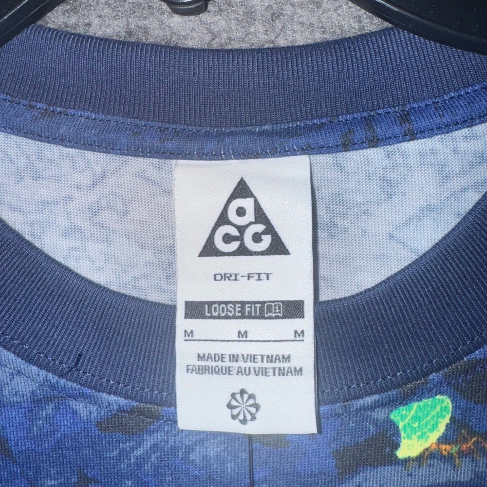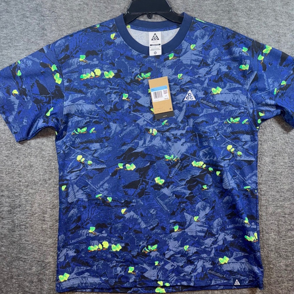 Experience nature-inspired comfort with this Nike ACG Dri-FIT t-shirt. The vibrant all-over print, featuring stylized leaves and subtle "Leafcutter" text, evokes a sense of outdoor adventure. Designed with a loose fit and crafted for breathability, this tee ensures you stay cool and comfortable whether you're hiking trails or exploring urban landscapes. Perfect for casual outings, outdoor activities, or travel. Measurements: • Chest: 22.5 in • Length: 28.5 in Material: Polyester Country of Origin: Vietnam Unit Type: Unit Keywords: Nike ACG, Dri Fit, graphic tee, outdoor, adventure, nature print, loose fit, breathable, casual wear, travel, athletic, sportswear, streetwear