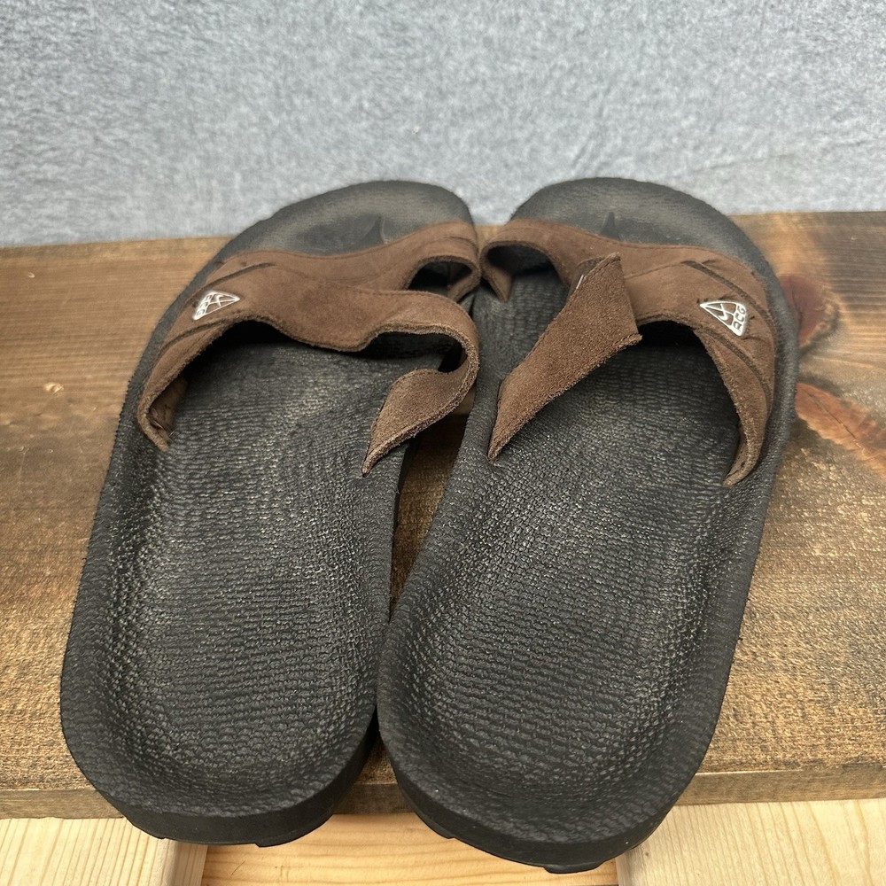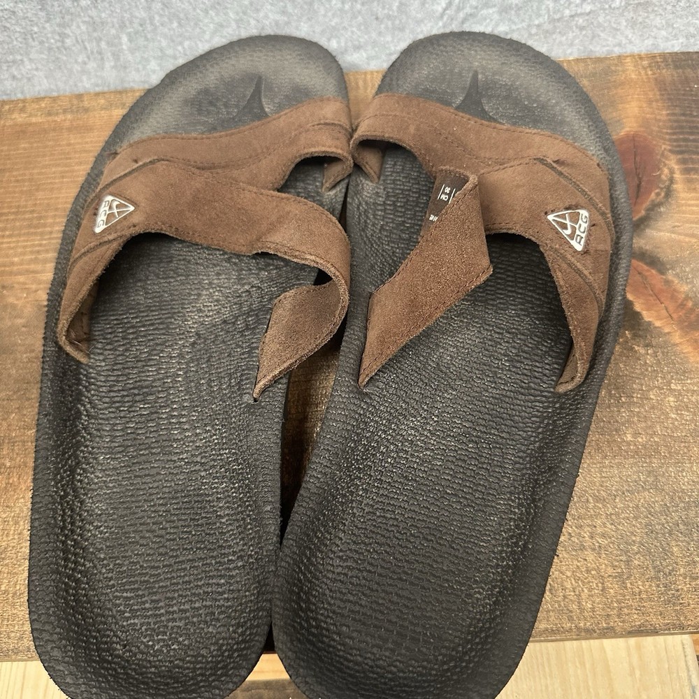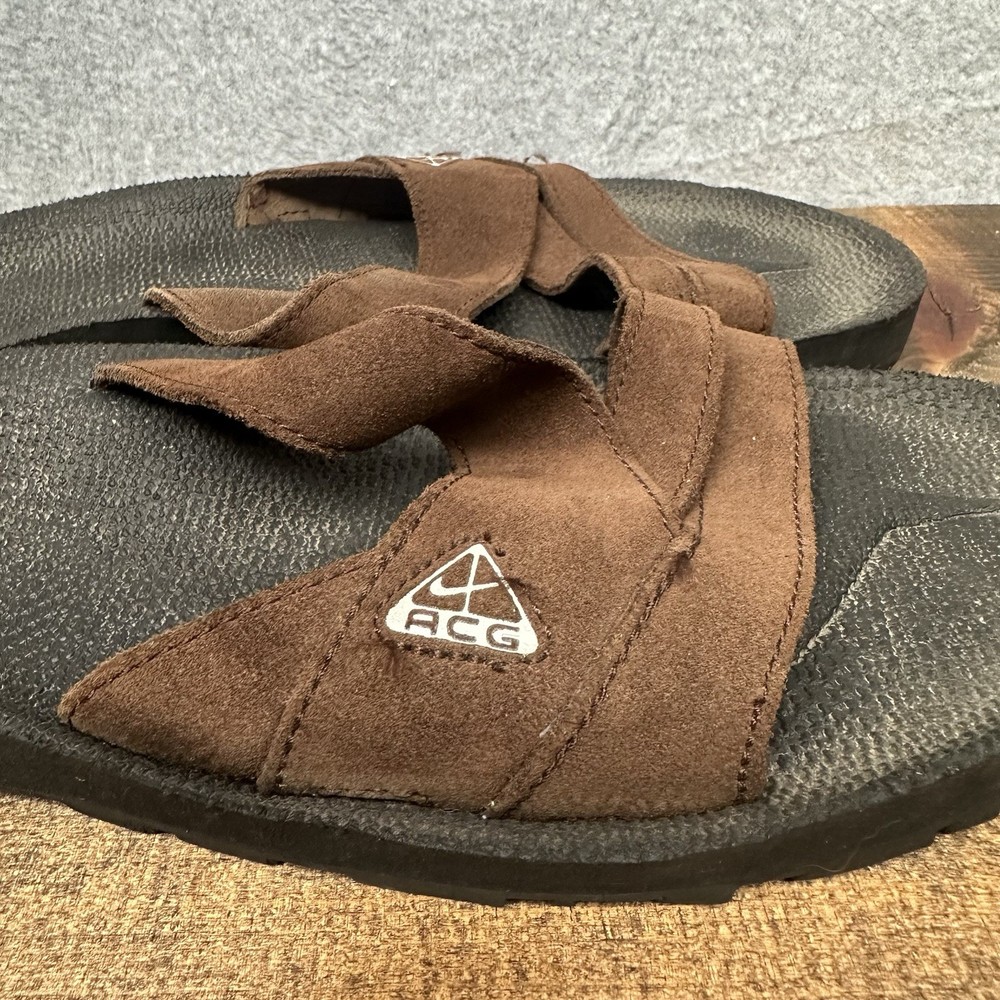 Slip into comfort with the Nike ACG Grind Slide, a perfect blend of style and ease for the active man. These size 12 sport sandals feature a solid brown color with black accents, complemented by the iconic Nike ACG design. Crafted with a durable leather upper and a comfortable synthetic insole, these sandals are tailored for everyday wear and outdoor adventures alike. The Nike ACG Grind Slide boasts a convenient slip-on closure, allowing for quick and effortless on-and-off. Ideal for sports enthusiasts and those who love colorful thematic designs, these sandals are a versatile addition to any wardrobe. The synthetic outsole provides long-lasting wear, making them a reliable choice for any activity that comes your way. In used condition with typical signs of wear. Any serious flaws or issues will be shown in the photos.