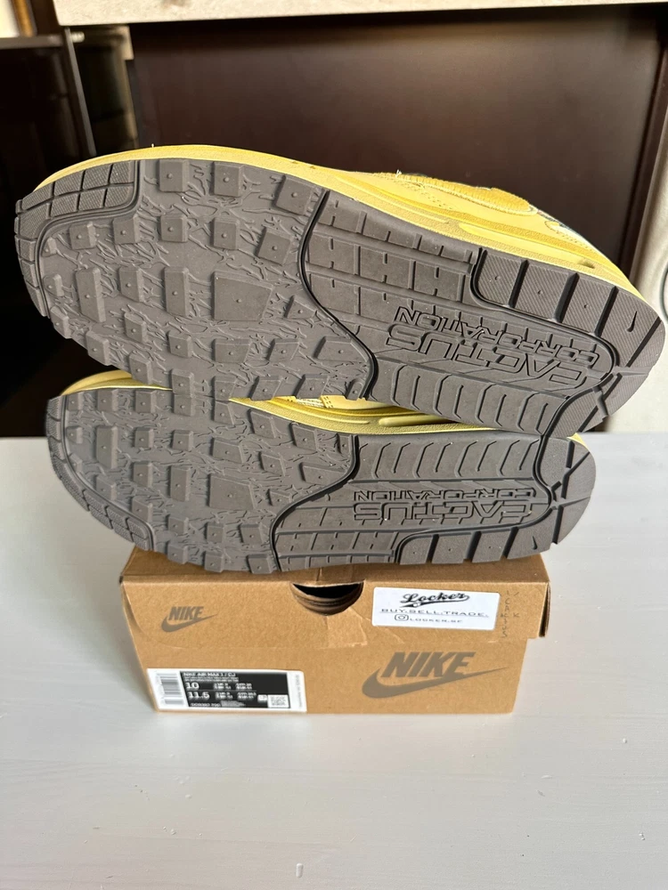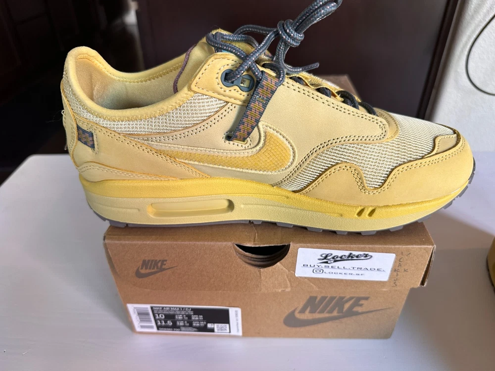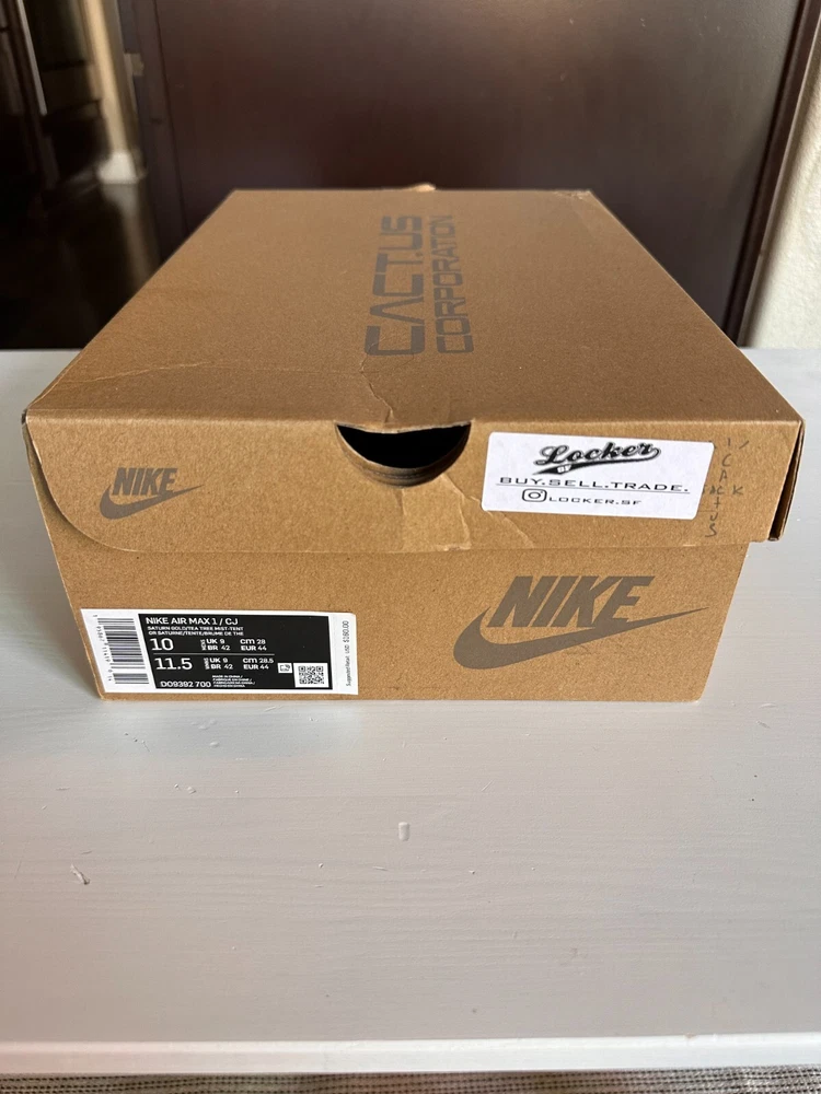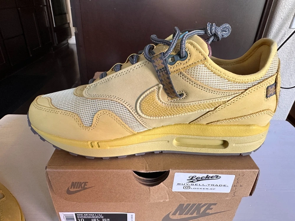 100% authentic size 10 Air Max 1 Cactus Jack in Saturn Gold. These were worn once, no visible signs of creases anywhere as shown in the pictures. Missing additional laces. Box in good, not great condition (some dents, creases). Will be shipped double boxed.