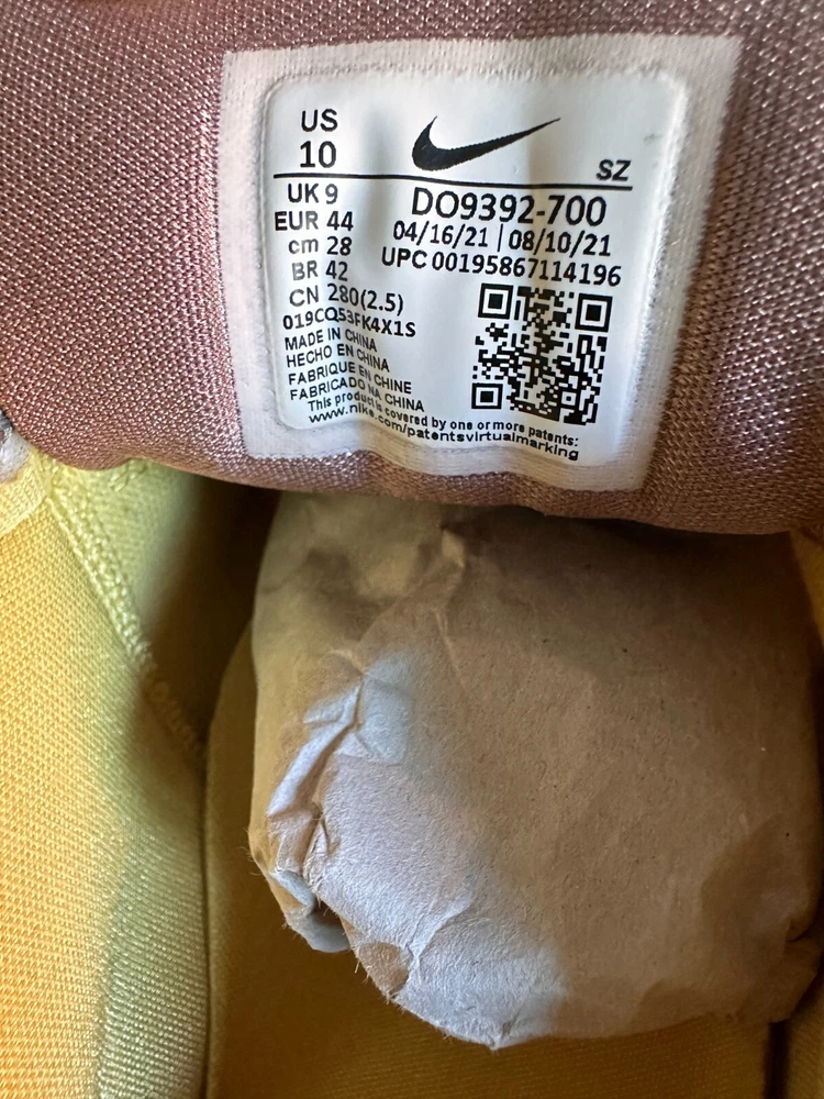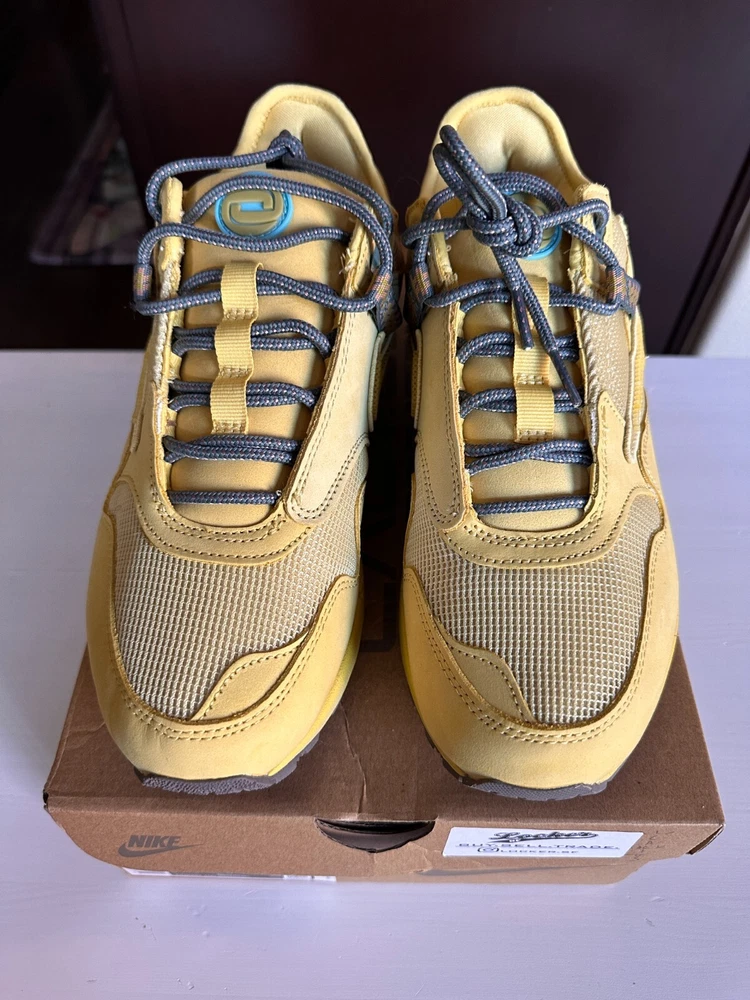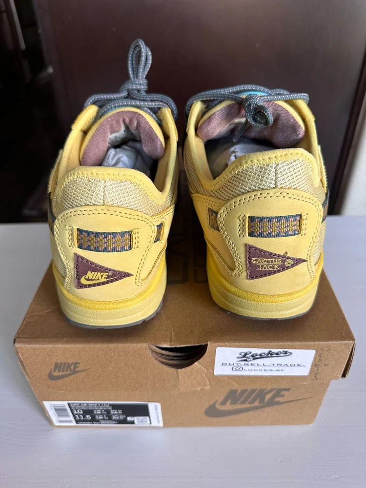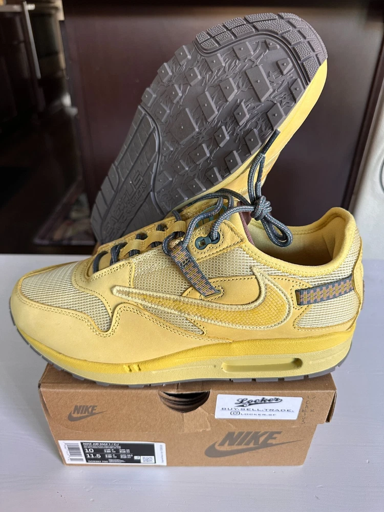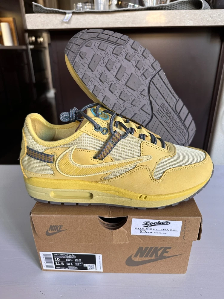 100% authentic size 10 Air Max 1 Cactus Jack in Saturn Gold. These were worn once, no visible signs of creases anywhere as shown in the pictures. Missing additional laces. Box in good, not great condition (some dents, creases). Will be shipped double boxed.