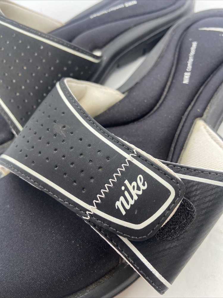 These Nike Comfort Footbed Slides are slip-on sandals in black, designed for women in size 8W. They feature a low heel, cushioned footbed, adjustable strap, and a rubber outsole for comfort and support. Perfect for travel, activewear, or casual wear during summer, fall, and spring seasons. The sandals have a standard shoe width and a flat heel style.