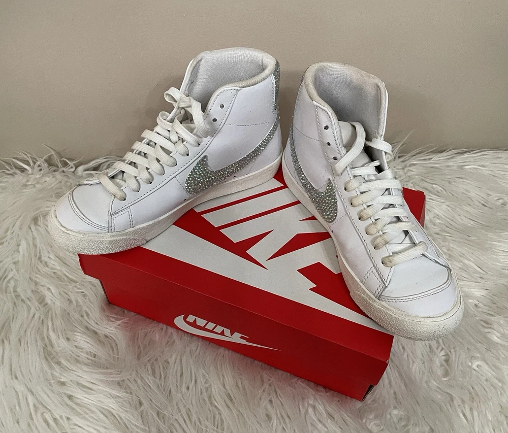 Nike Blazer Mids 7.0 Custom Tennis Shoes! Must See.. Great Condition. My daughter absolutely loves shoes! We had these custom made for a dance and they were quite pricey. These are the equivalent to Cinderella’s slippers but they don’t hurt your feet. 😃 These are a one of a kind in great preowned condition with normal wear. All Sales are Final. So PLEASE see all photos and Feel free to ask any questions. I’m always happy to help. No international Shipping.. Thanks so much for looking..☺️