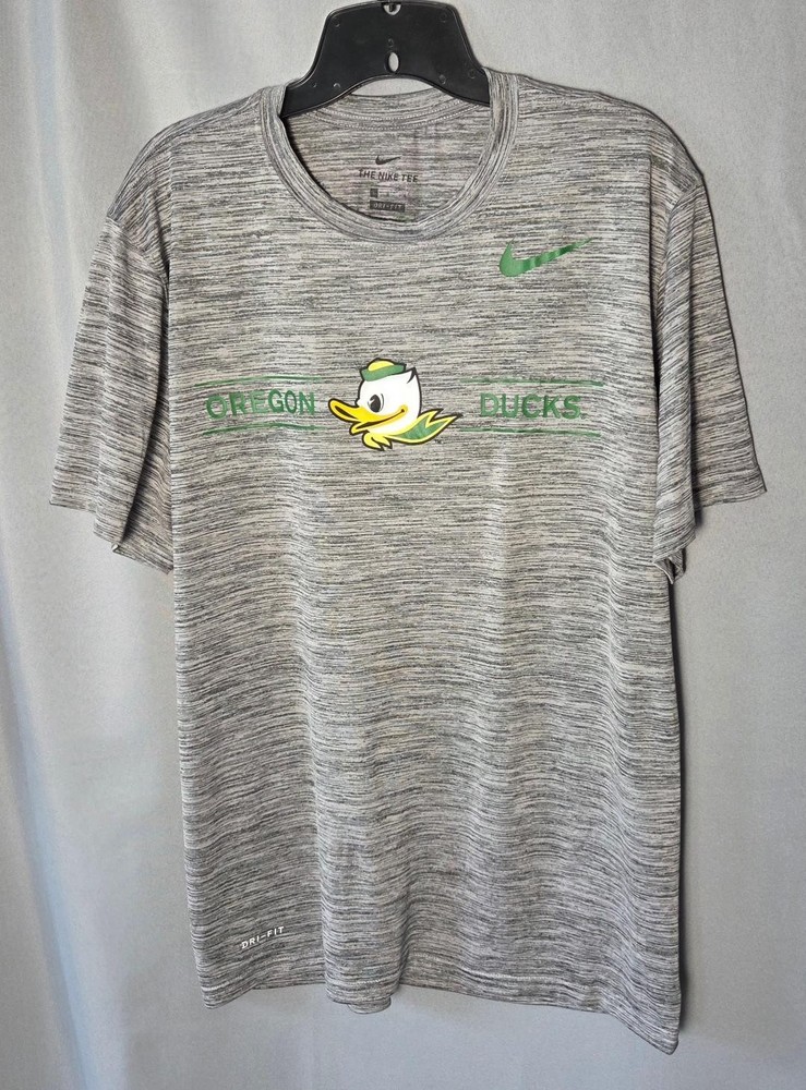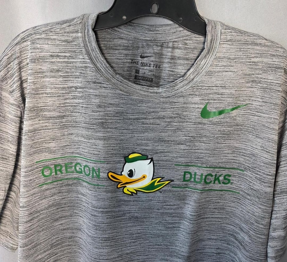 Show your team pride with this Nike Dri-FIT Oregon Ducks performance t-shirt in men’s size Large. This lightweight athletic tee features a heather gray design with the iconic Oregon Ducks logo across the chest and Nike swoosh detail. Made with Nike’s moisture-wicking Dri-FIT fabric, this shirt is perfect for workouts, game days, or casual everyday wear. Item ships by USPS economy delivery 2-9 days. We strive to ship your item as quickly as possible and to be delivered undamaged. Our handling time is no more than 3 days from completed purchase.