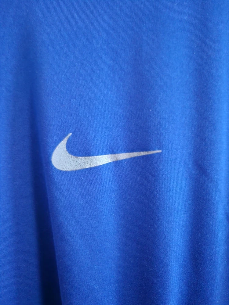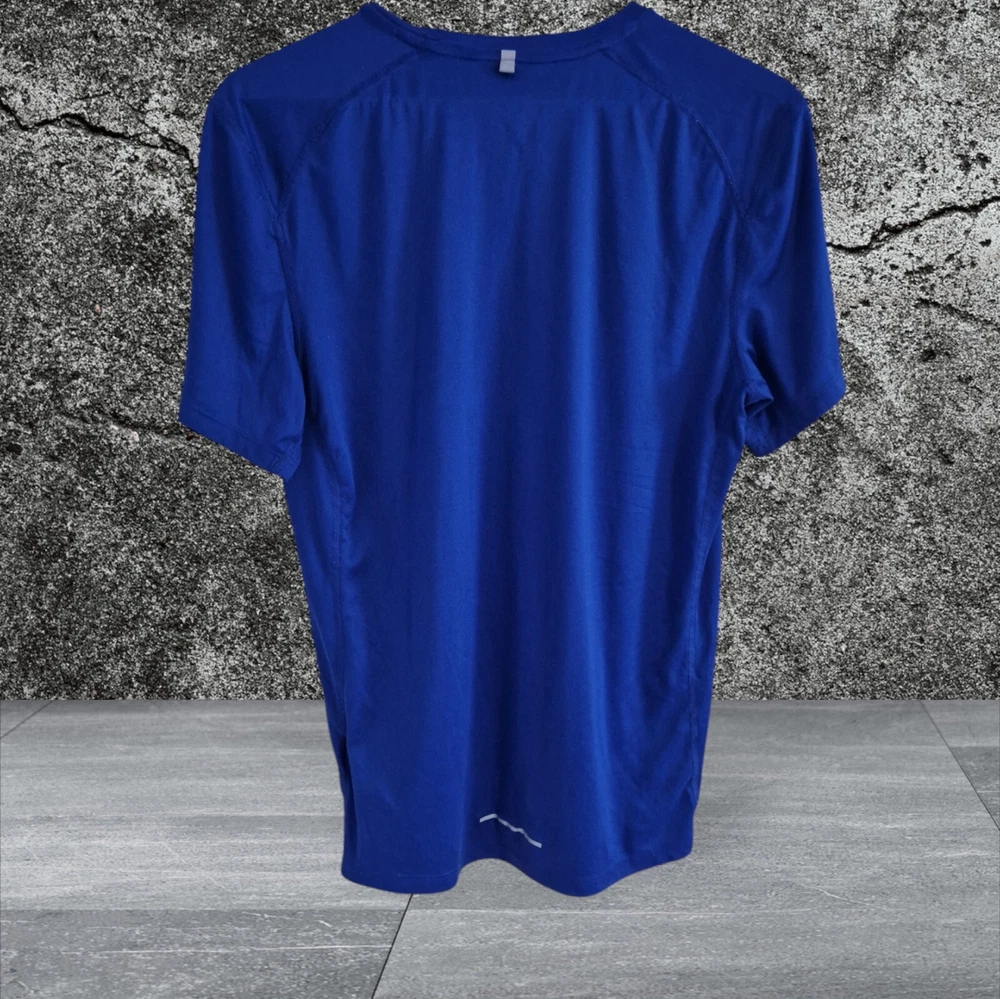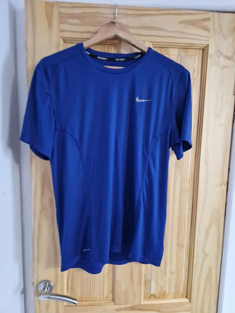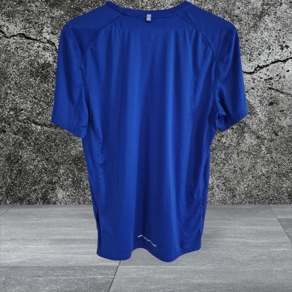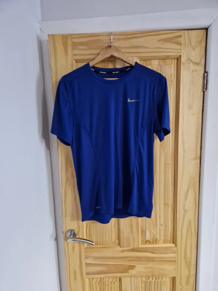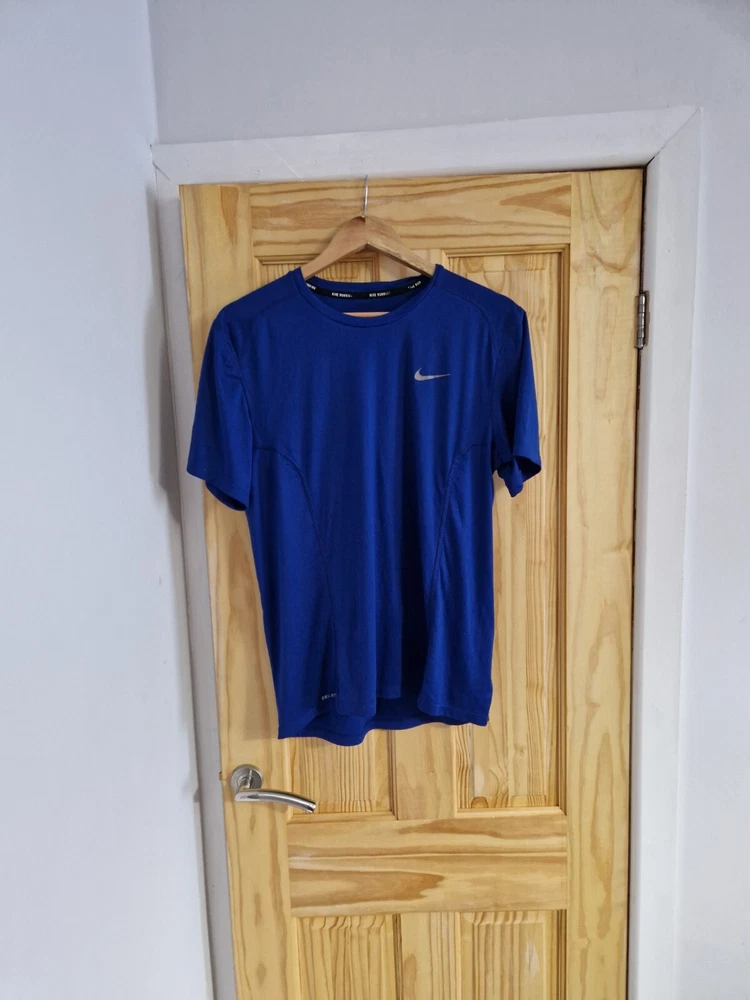 Pit to pit - 20 inches Length - 22 inches Crafted for comfort and performance, the Nike Dri-Fit Running Activewear Top is a must-have for any athlete's wardrobe. This men's large top in a striking blue hue features a round neck and short sleeves, tailored for a regular fit that allows for freedom of movement. The polyester blend fabric is designed to be breathable and lightweight, ensuring you stay cool and dry during intense workouts. The top boasts a solid pattern with a subtle embroidered Nike logo that adds a touch of style to your activewear collection. With its mild compression level, it supports your muscles during various activities, including running, jogging, and cross-training. The Dri-Fit technology is functional across all seasons, making it a versatile choice for year-round gym training and sports activities.