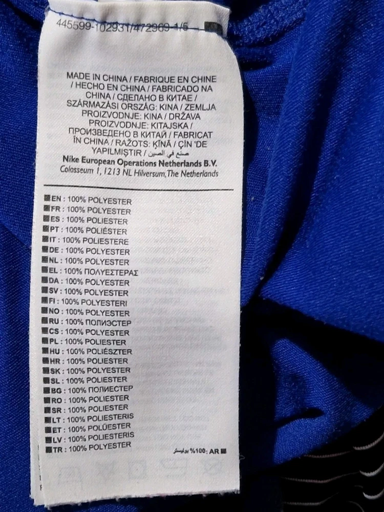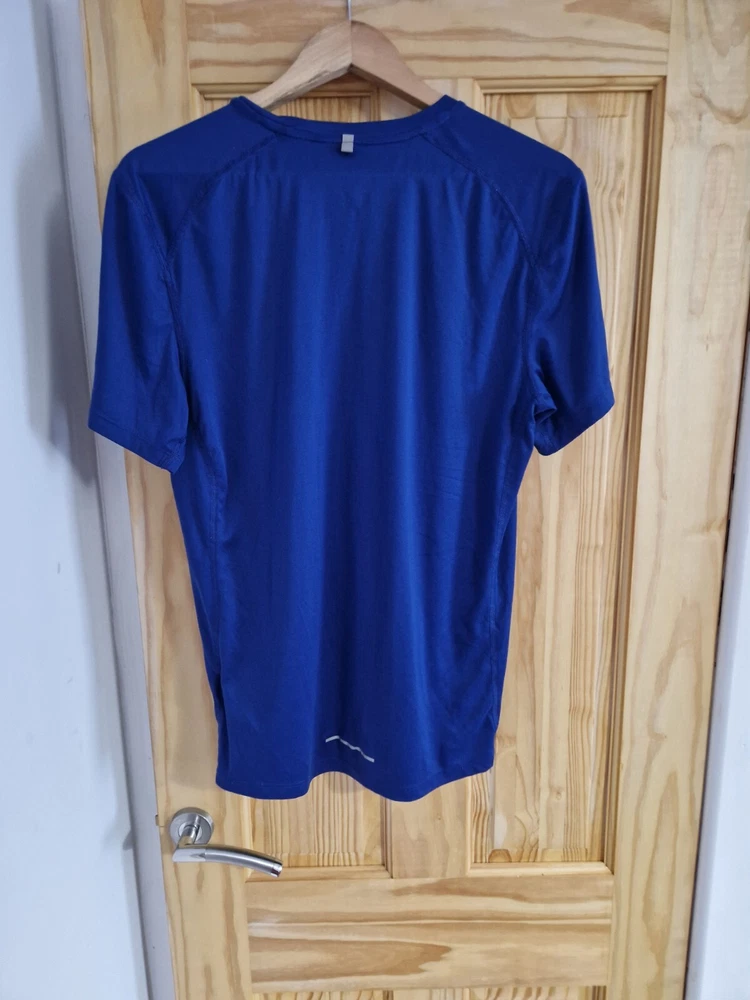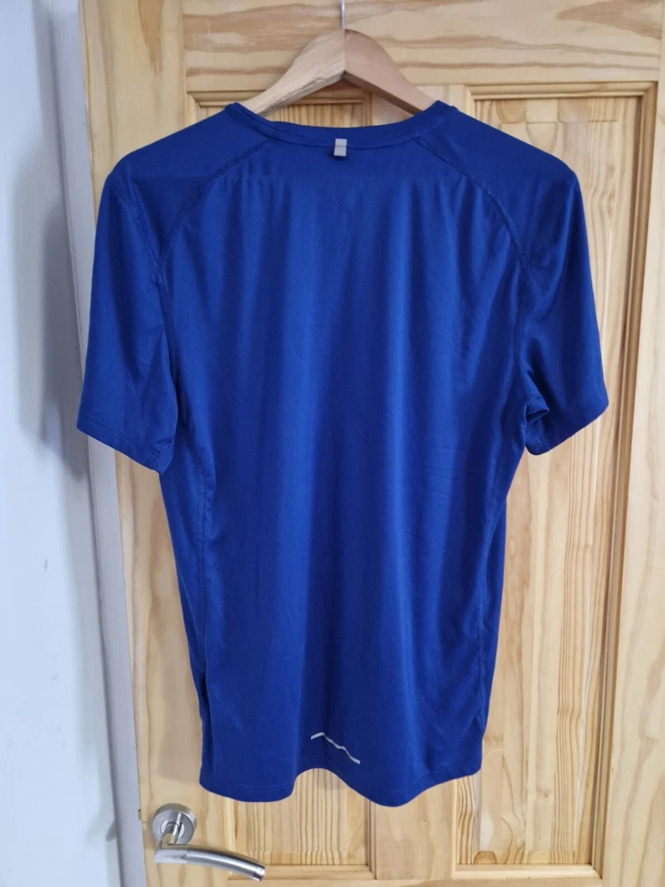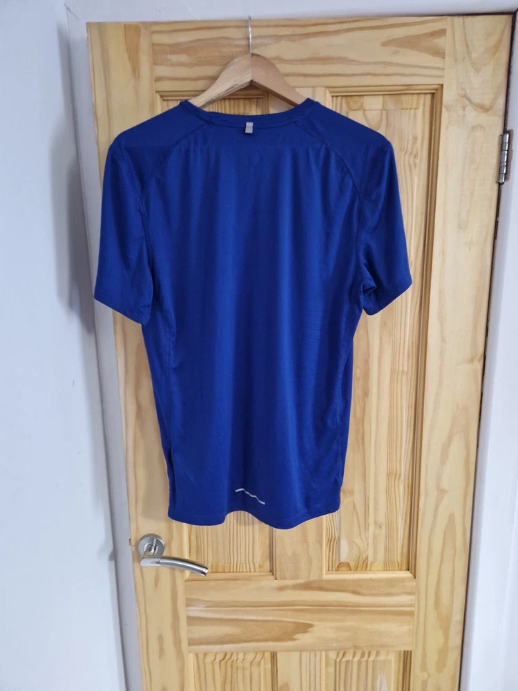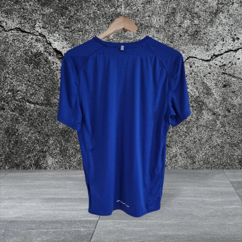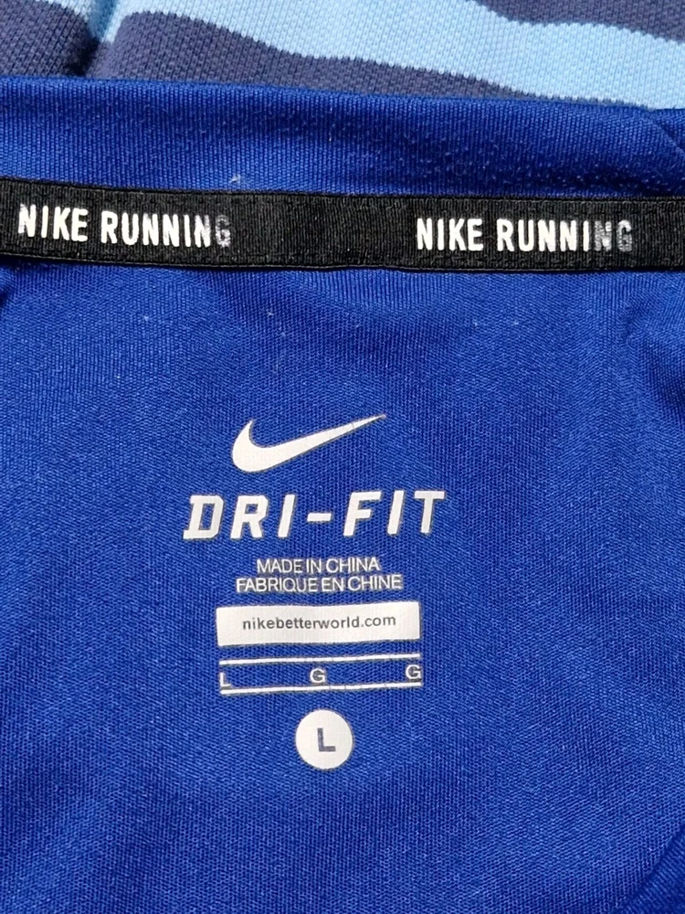 Pit to pit - 20 inches Length - 22 inches Crafted for comfort and performance, the Nike Dri-Fit Running Activewear Top is a must-have for any athlete's wardrobe. This men's large top in a striking blue hue features a round neck and short sleeves, tailored for a regular fit that allows for freedom of movement. The polyester blend fabric is designed to be breathable and lightweight, ensuring you stay cool and dry during intense workouts. The top boasts a solid pattern with a subtle embroidered Nike logo that adds a touch of style to your activewear collection. With its mild compression level, it supports your muscles during various activities, including running, jogging, and cross-training. The Dri-Fit technology is functional across all seasons, making it a versatile choice for year-round gym training and sports activities.
