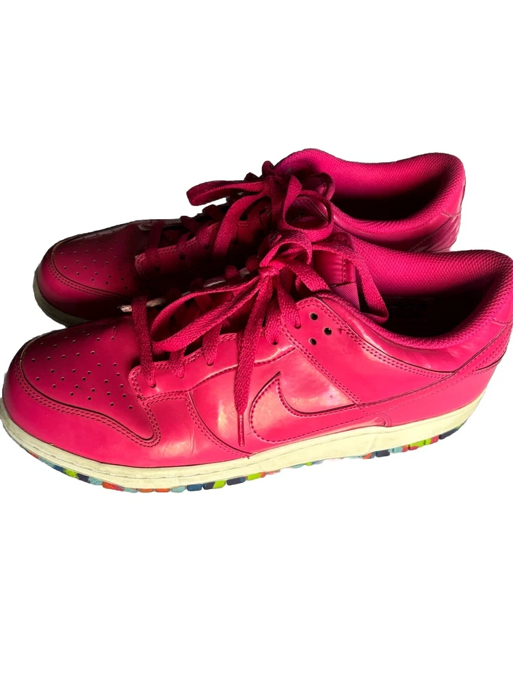 RARE AND HARD TO FIND! Nike Dunk Low in vivid pink and limited edition "Fruity Pebbles" edition! Awesome and fun multi-colored bright soles and hot pink patent leather. Women's 11.5, or men's 10. Great to add to your collection!!