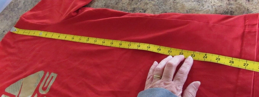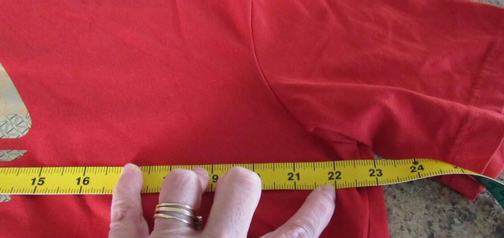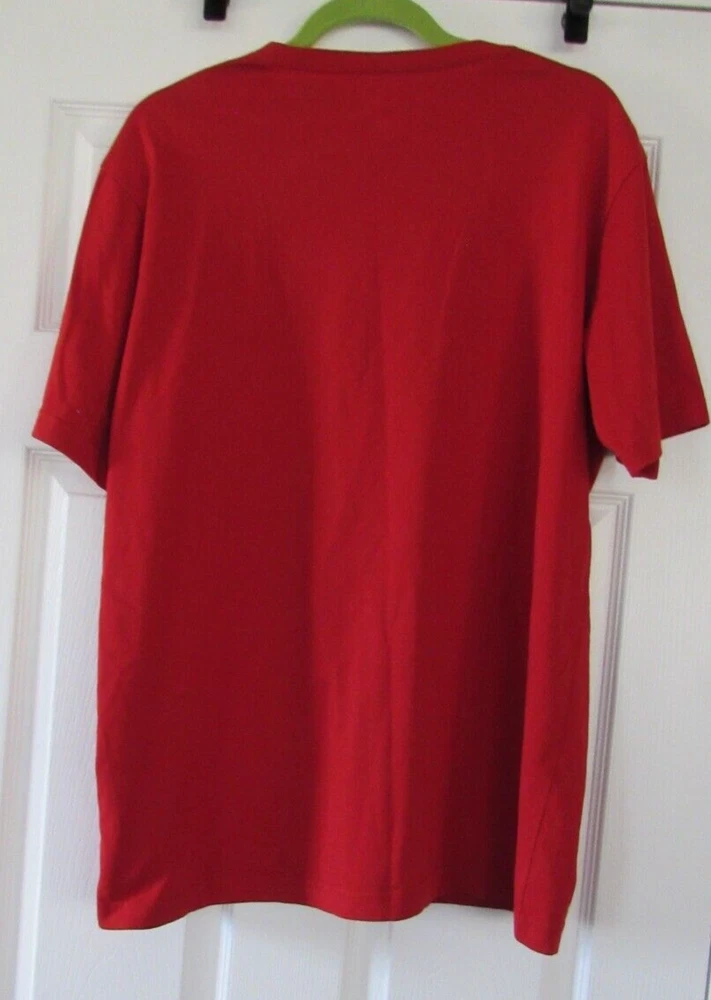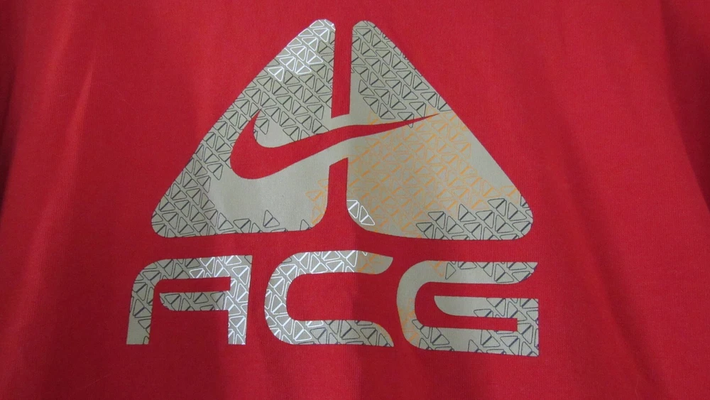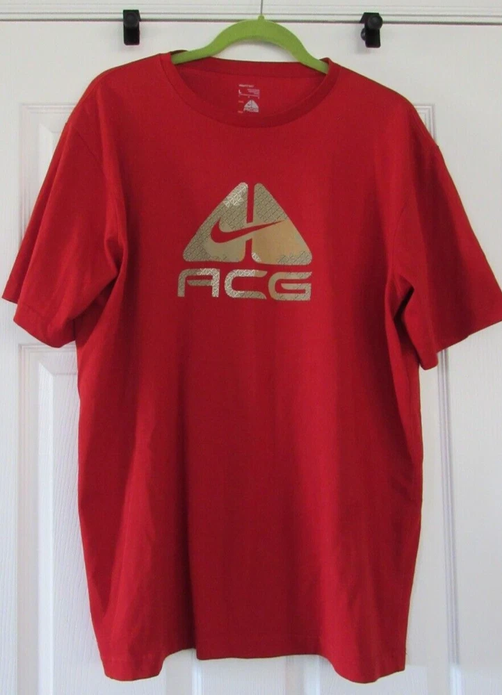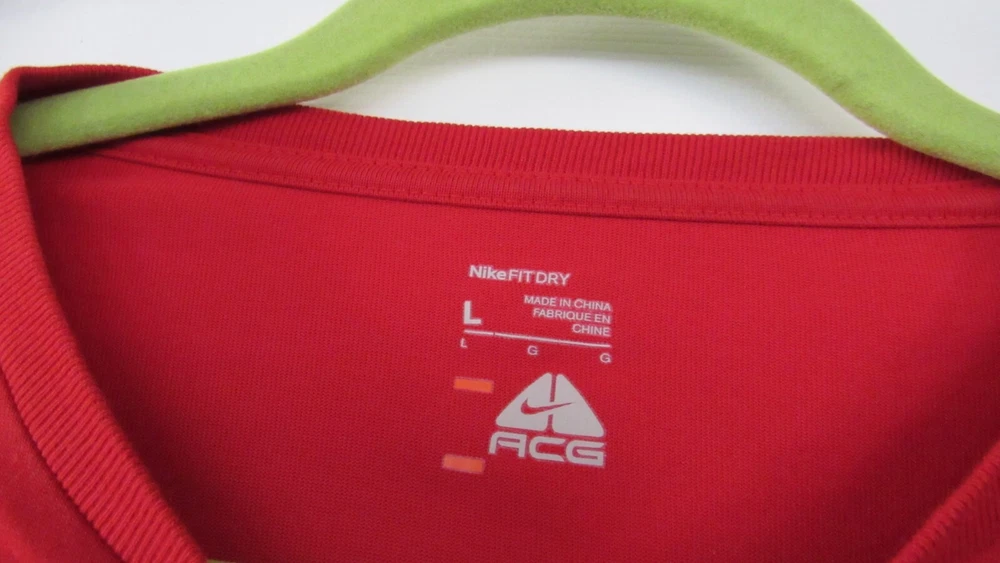 Elevate your athletic wardrobe with this Nike Fit Dry Men's ACG Shirt in size L and vibrant red color. The shirt features short sleeves, a crew neckline, and a regular fit suitable for any season. The solid pattern and graphic print of the Nike ACG model make it a stylish addition to your collection. Machine washable for easy care, this T-shirt is made of high-quality materials to ensure durability. Whether you're hitting the gym or going for a run, this shirt will keep you comfortable and looking great. Don't miss out on this opportunity to upgrade your workout gear with the Nike Dri-FIT product line. Measurements are approximate. Please also compare measurement to a similar clothing item you own to determine proper fit. Armpit to armpit: 23" Sleeve: 9 1/2" Shoulder to hem: 27 1/2"