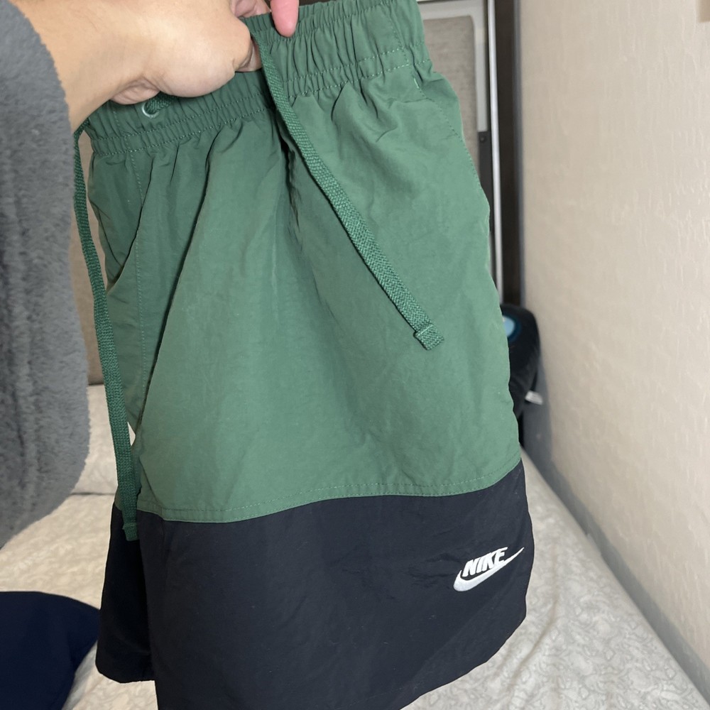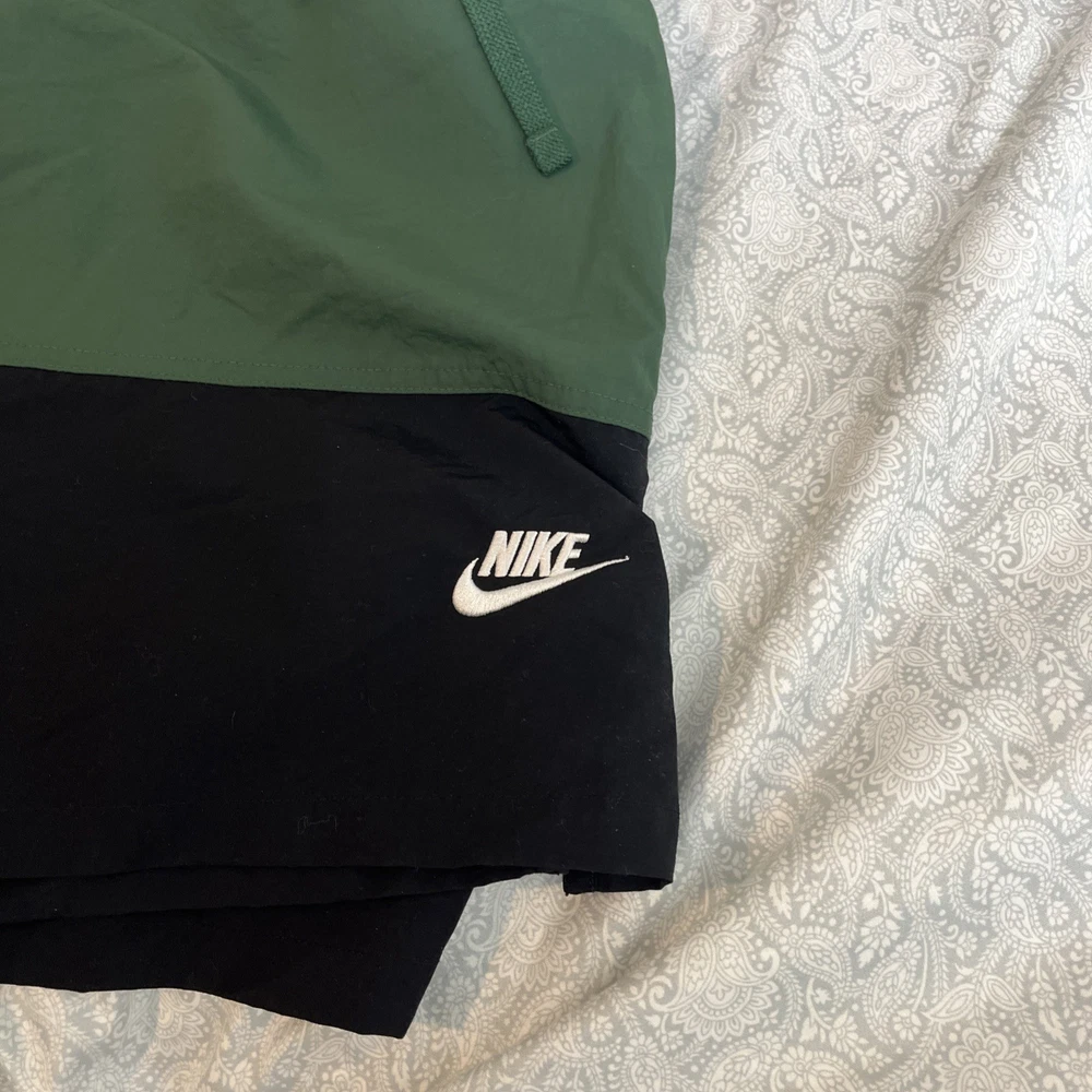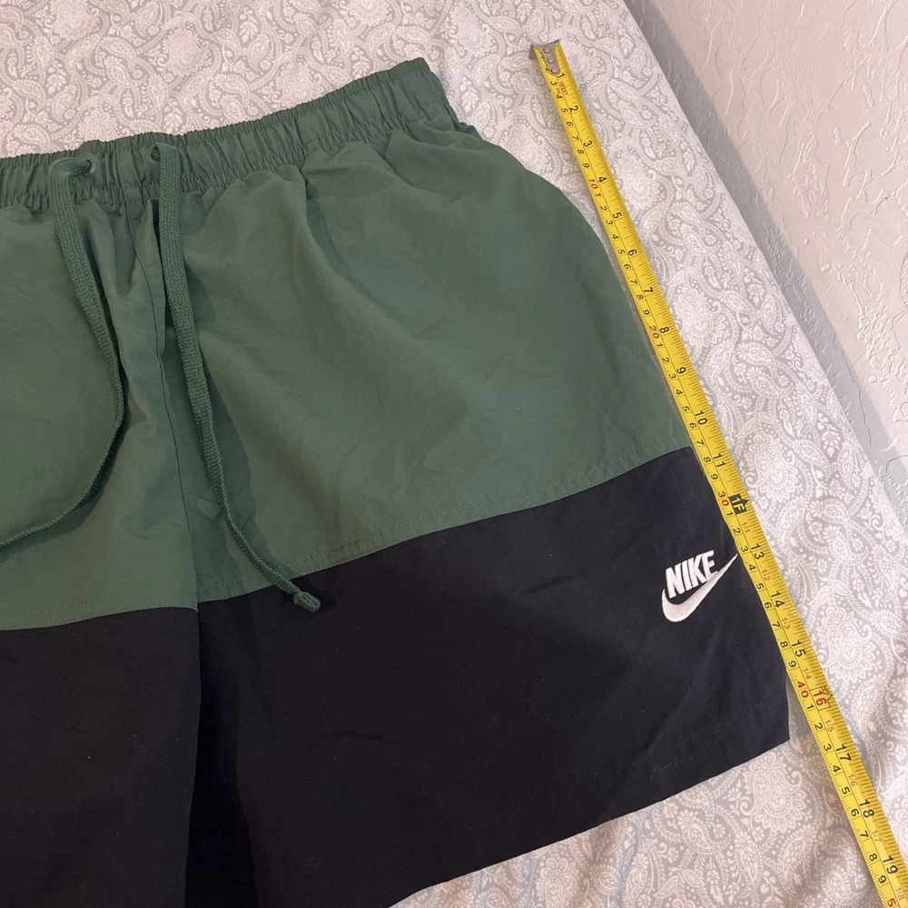 Nike men’s swim trunks featuring a green and black colorblock design with embroidered Nike swoosh. Lightweight and quick-dry with elastic waistband and adjustable drawstring for comfort. Includes side pockets and a back pocket with drainage grommet. Perfect for swimming, beach, pool, or casual summer wear. Details: • Brand: Nike • Size: XXL • Color: Green / Black • Style: Swim Trunks • Waist: Elastic w/ drawstring • Pockets: Side pockets + rear pocket • Made in Vietnam Please see photos for exact condition and measurements.