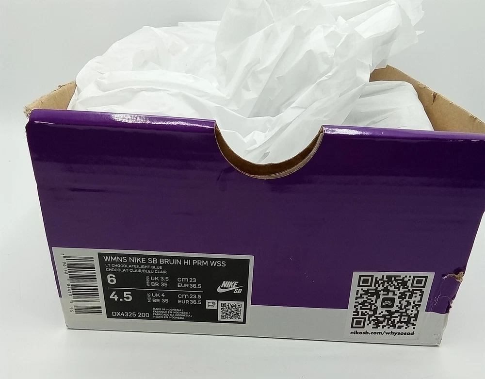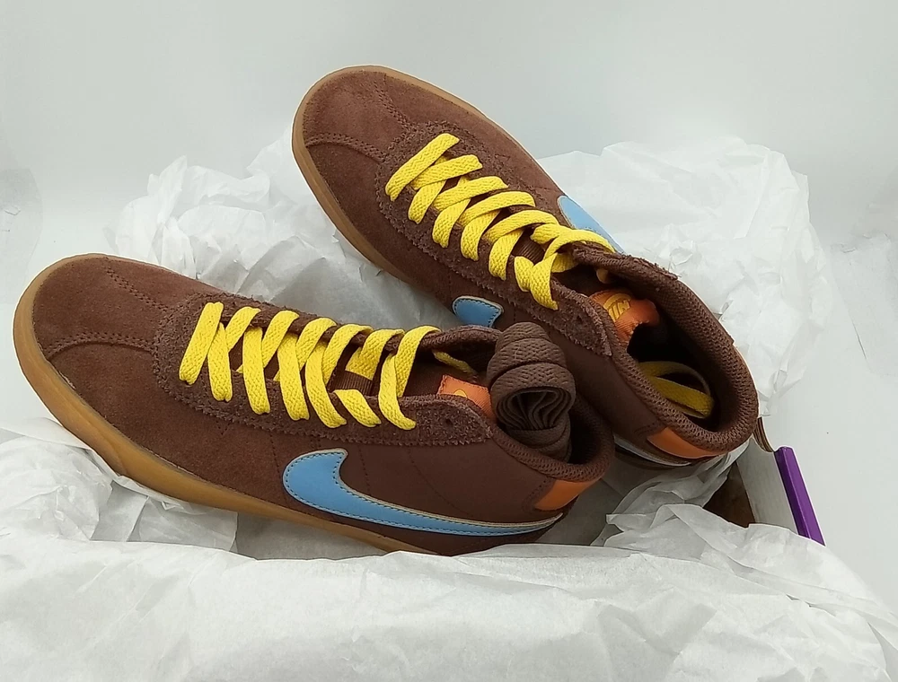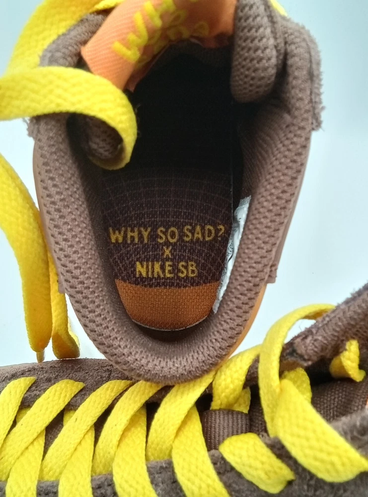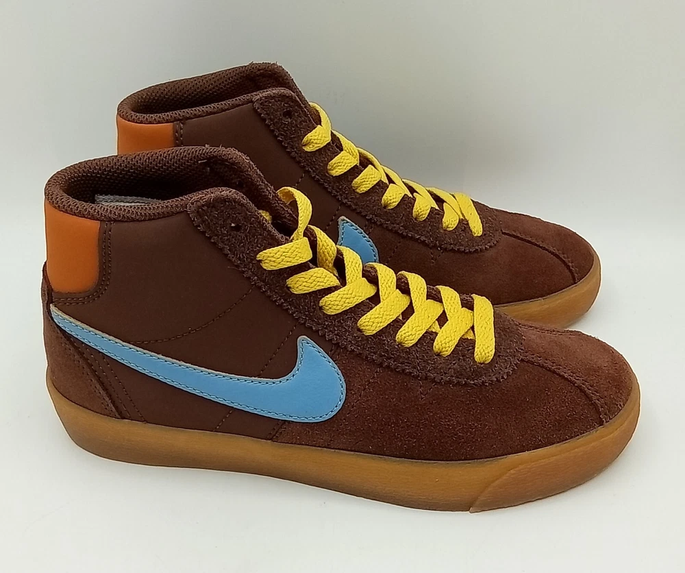 NEW with Box (Box missing top). Elevate your skateboarding game with the Nike SB Bruin High "Why So Sad?" sneakers in a women's size 6. These high-top shoes feature a lace-up closure and suede upper material in a stylish brown color. The shoe shaft style is perfect for casual occasions and school activities, while the standard shoe width provides comfort for all-day wear. The Nike SB Bruin High sneakers are part of the Nike SB product line and boast a 2022 release year. The style code is DX4325 200, and the shoes were manufactured in Indonesia. With their unique design and excellent performance, these sneakers are perfect for women who love athletic activities like skateboarding.