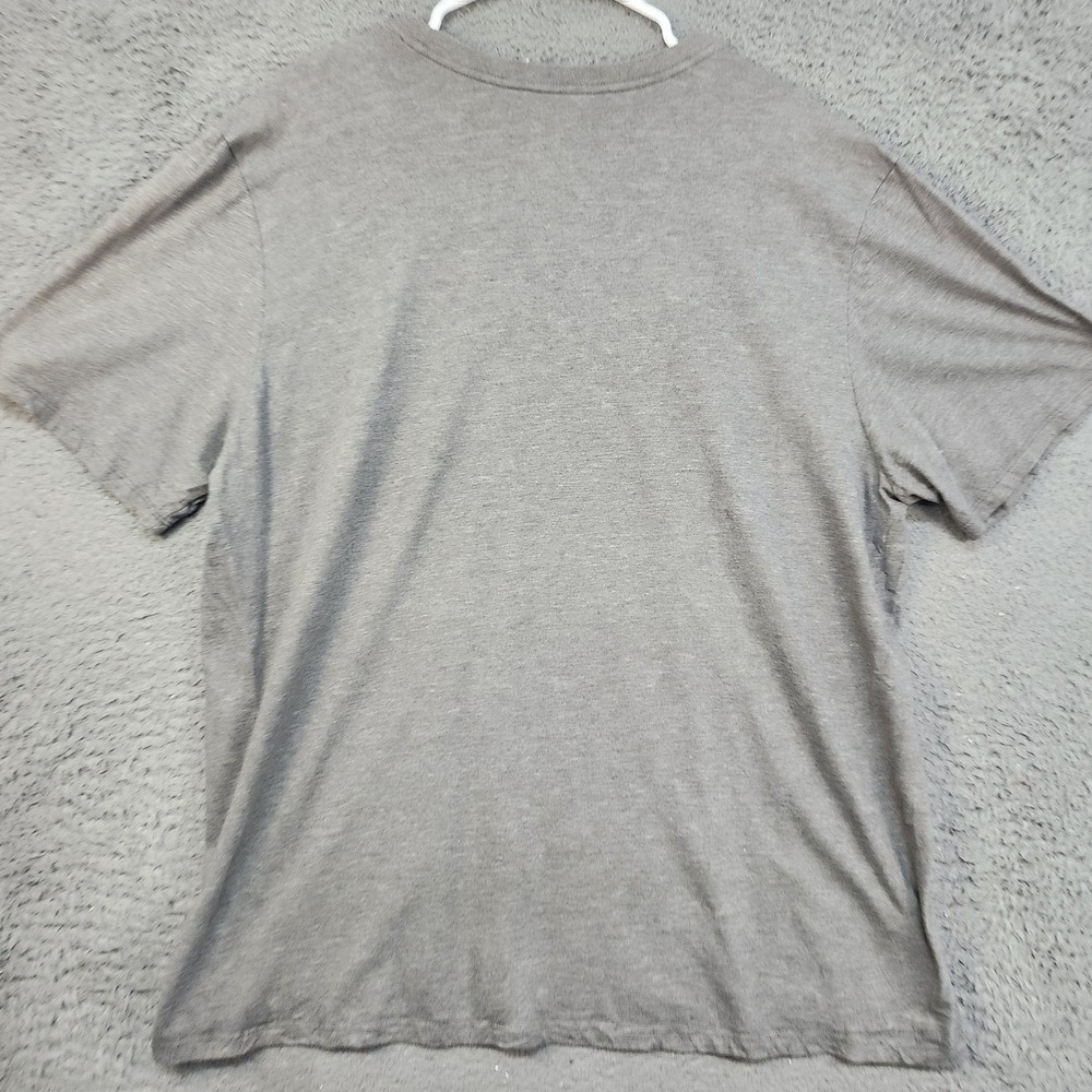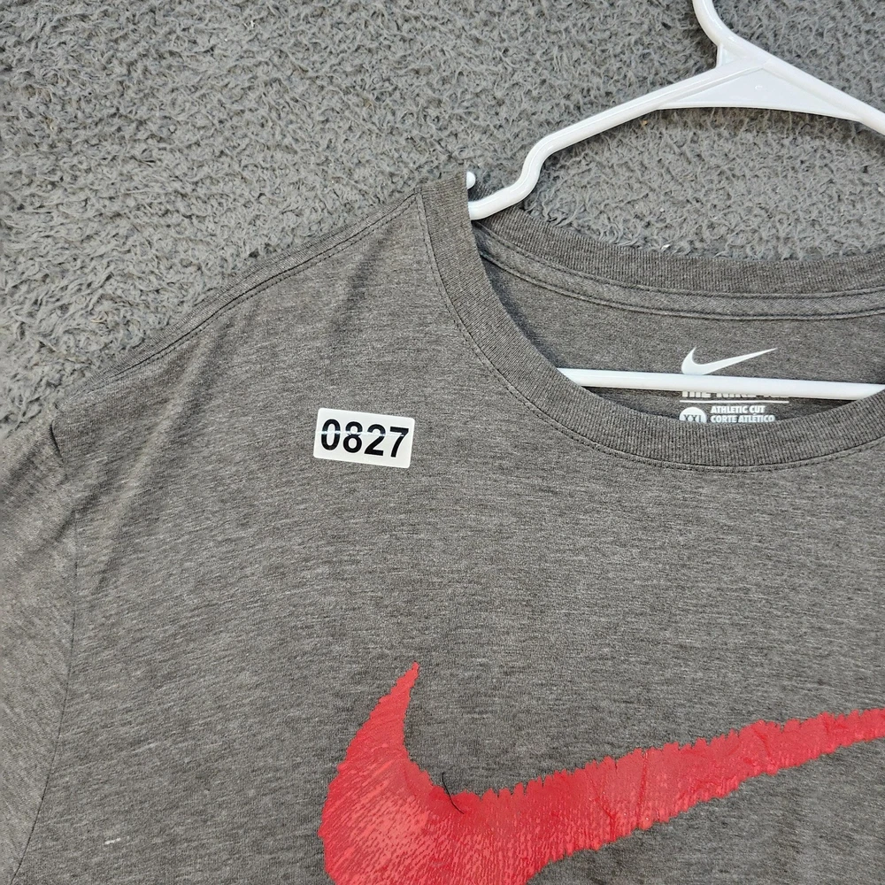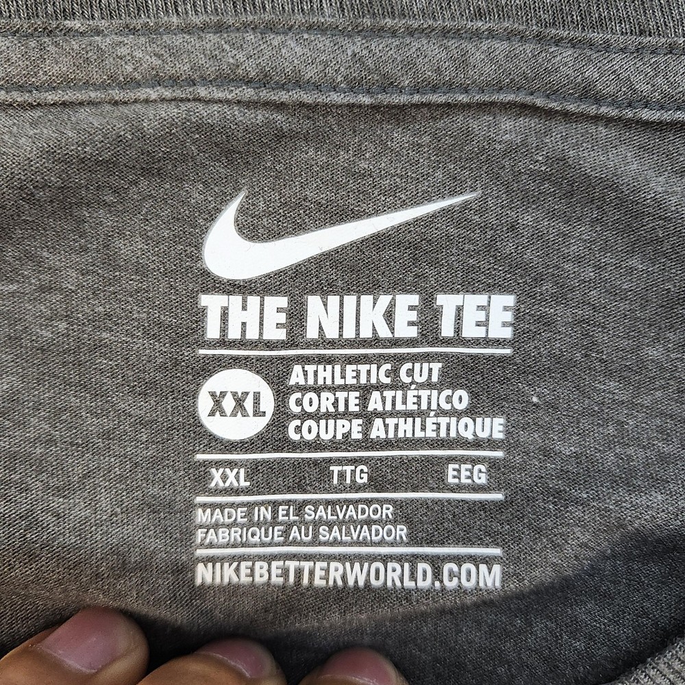 Brand: Nike Style: The Nike Tee short sleeve crewneck shirt with large front swoosh graphic. Color: Heather gray shirt with red Nike swoosh logo on the chest. Gender: Mens Size on tag: XXL (2XL) Fit: Athletic cut as noted on the printed neck label. Made in El Salvador; neck print also notes . Details: Soft lightweight knit fabric, ribbed crew neckline, straight hem, simple solid back.