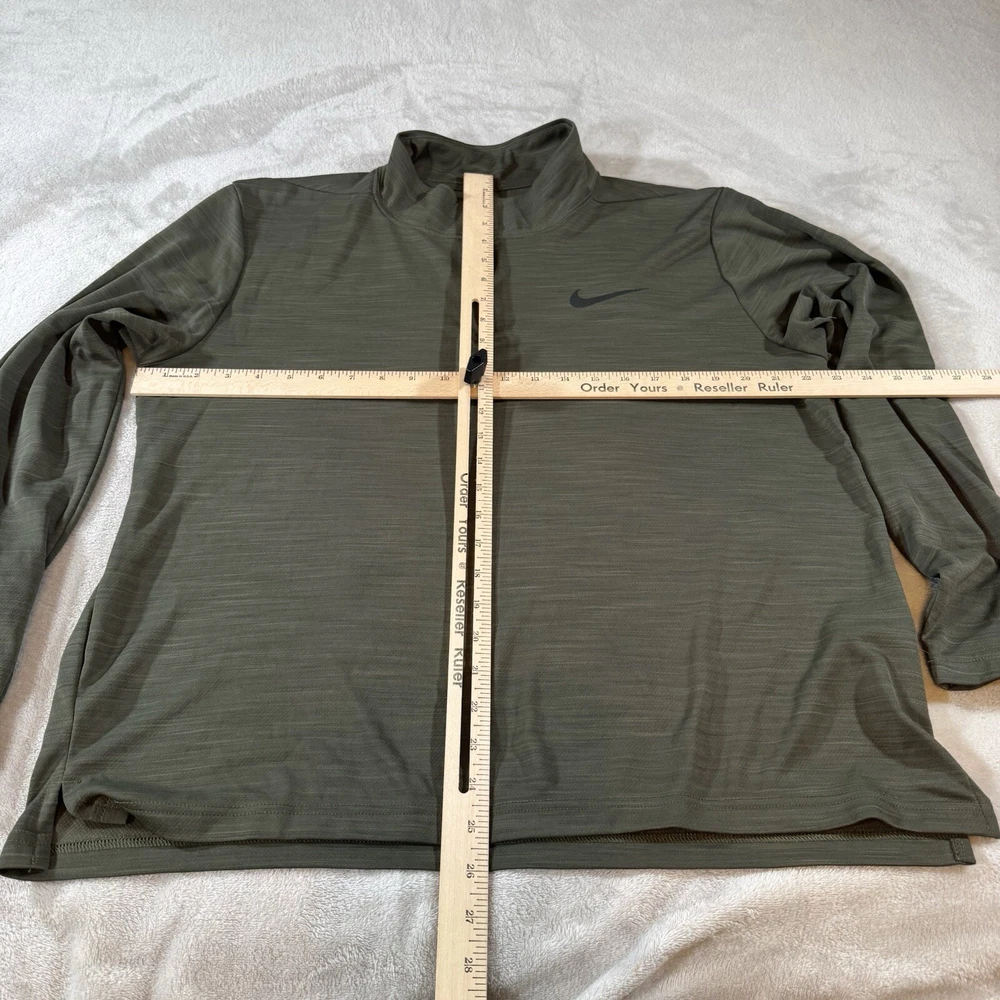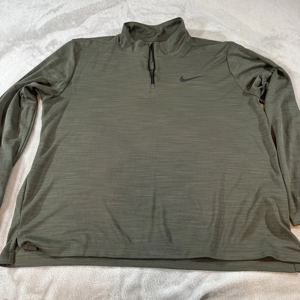 Crafted for the active man, the Nike Shirt in a striking green hue is a versatile addition to any wardrobe. The men's large pullover features a comfortable mock neck with a convenient 1/4 zipper, ideal for easy temperature regulation and a customizable look. Its long sleeves and moisture-wicking fabric make it perfect for running, jogging, or any workout, ensuring you stay dry and comfortable. The shirt boasts a solid pattern and a sleek Nike Swoosh logo accent, combining style with functionality. Designed with 100% polyester, this piece is machine washable for easy care and is suitable for all seasons. Whether you're hitting the gym or enjoying a casual day out, this Nike Dri-FIT top is tailored for both performance and everyday wear.