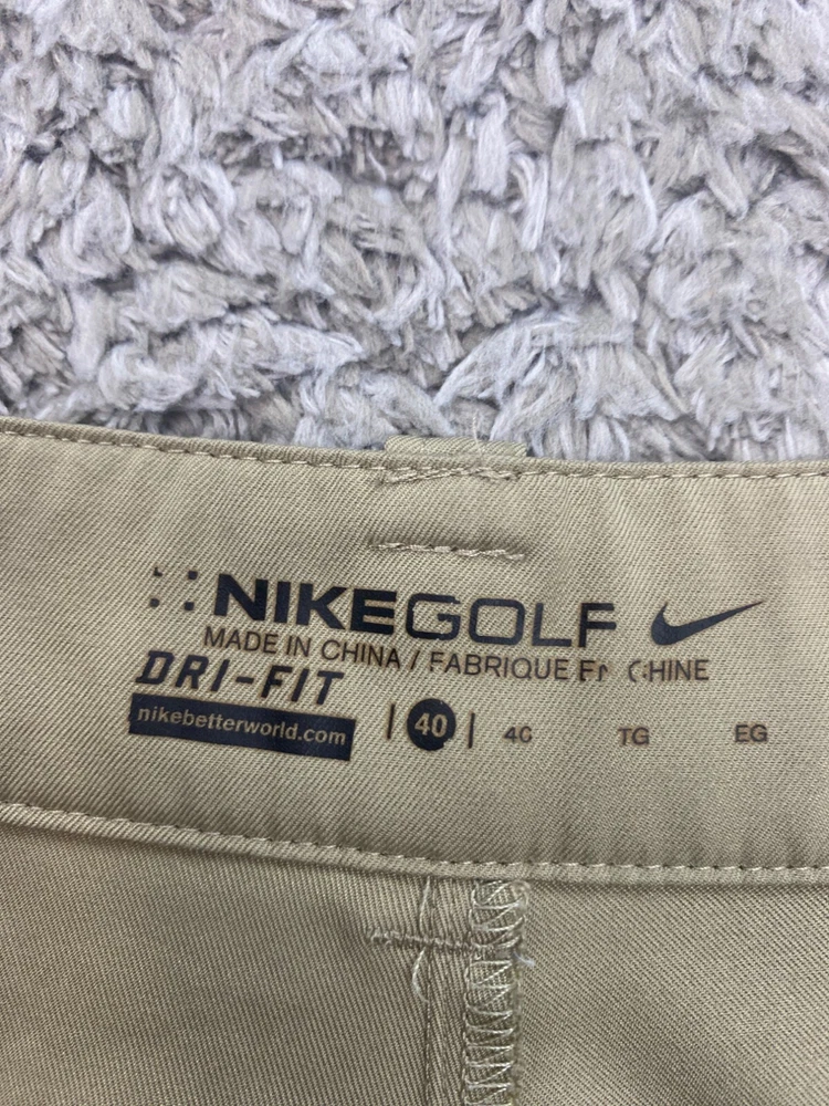 Material: Polyester Occasion: Casual, Travel, Workwear Pattern: Solid Rise: Mid (10-12 in) Color: Beige Closure: Button Fabric Type: Microfiber Features: Stretch Theme: Preppy Front Type: Flat Front Size: 40 Department: Men Brand: Nike Pocket Type: Slash Pocket Waist Size: 40 in Accents: Button, Embroidered, Logo, Zipper Size Type: Regular Fit: Regular Fabric Wash: Medium Inseam: 12 in Style: Chino