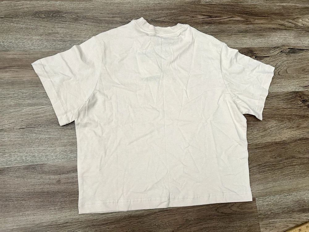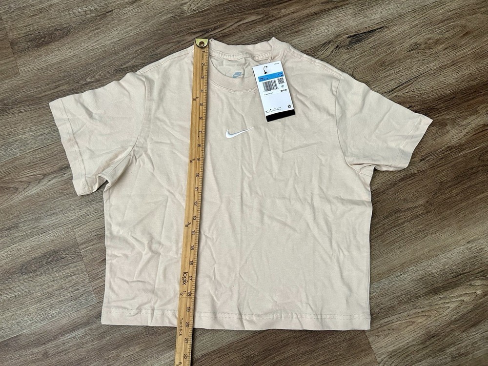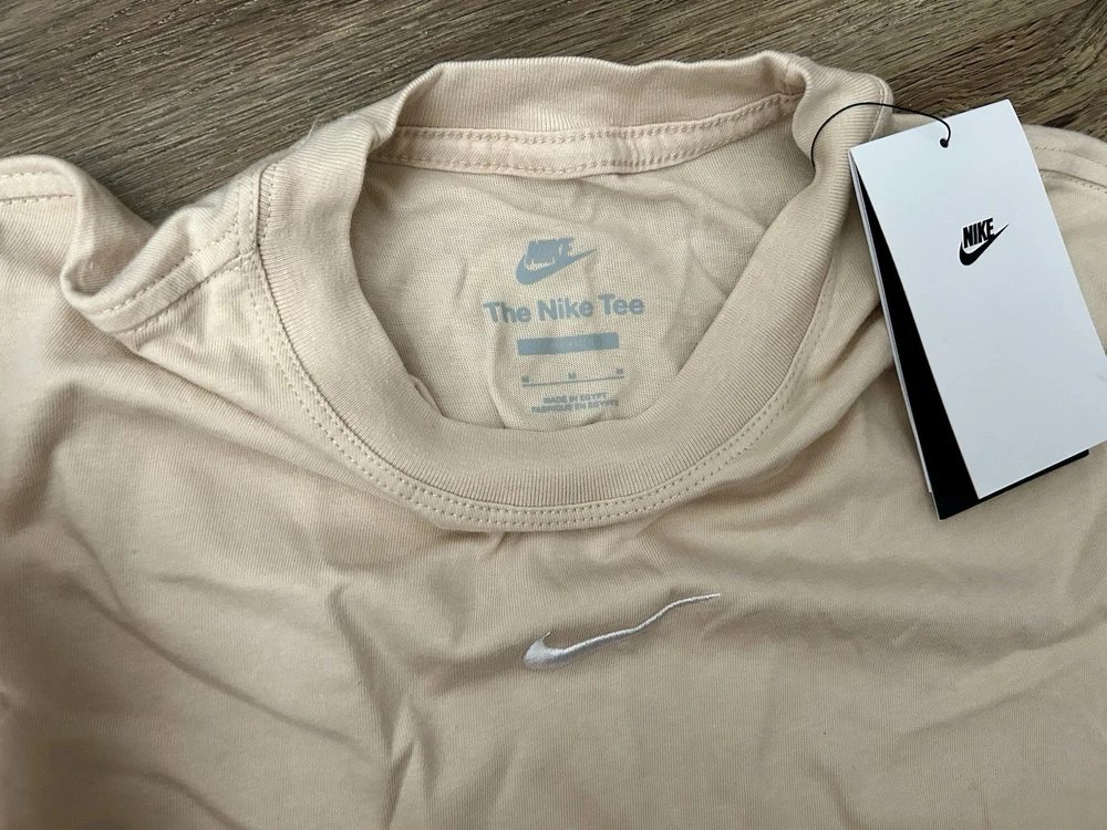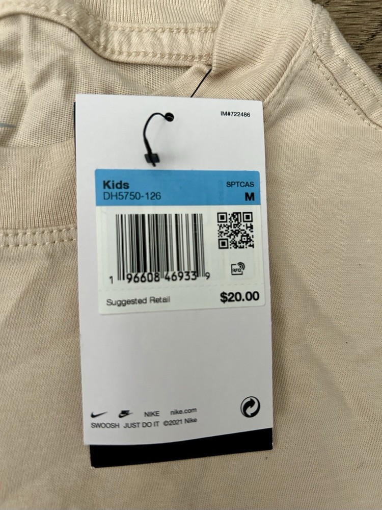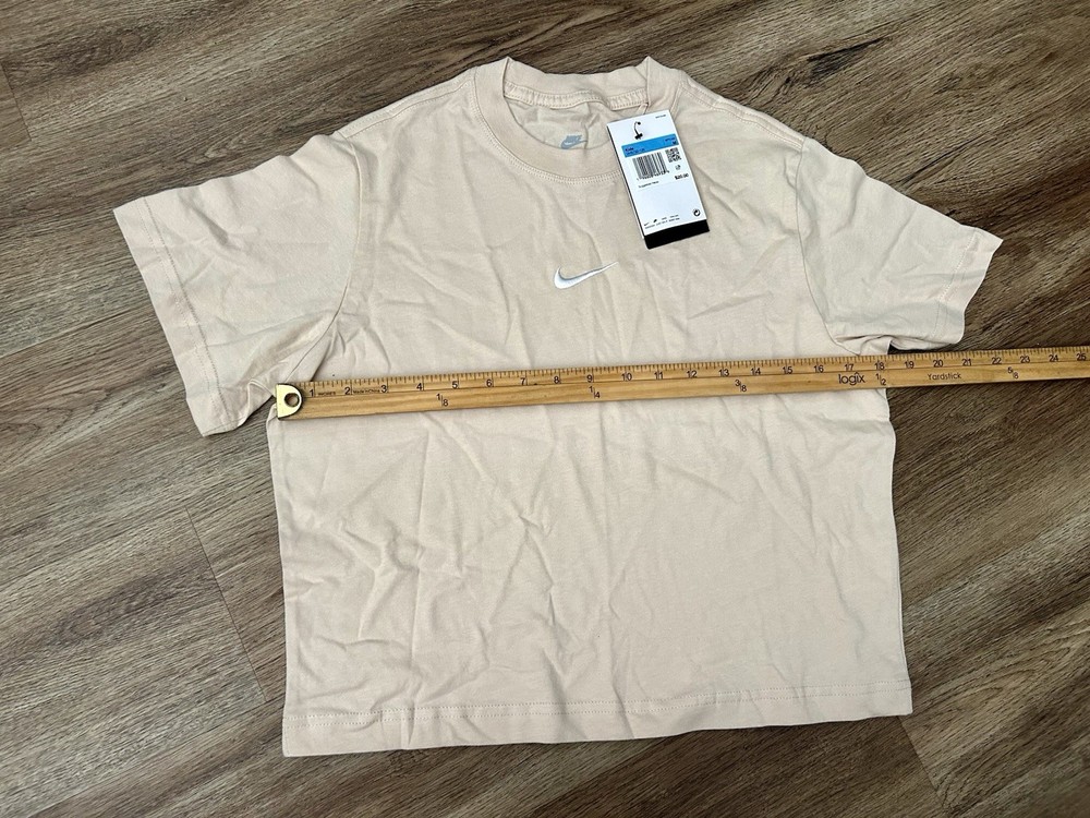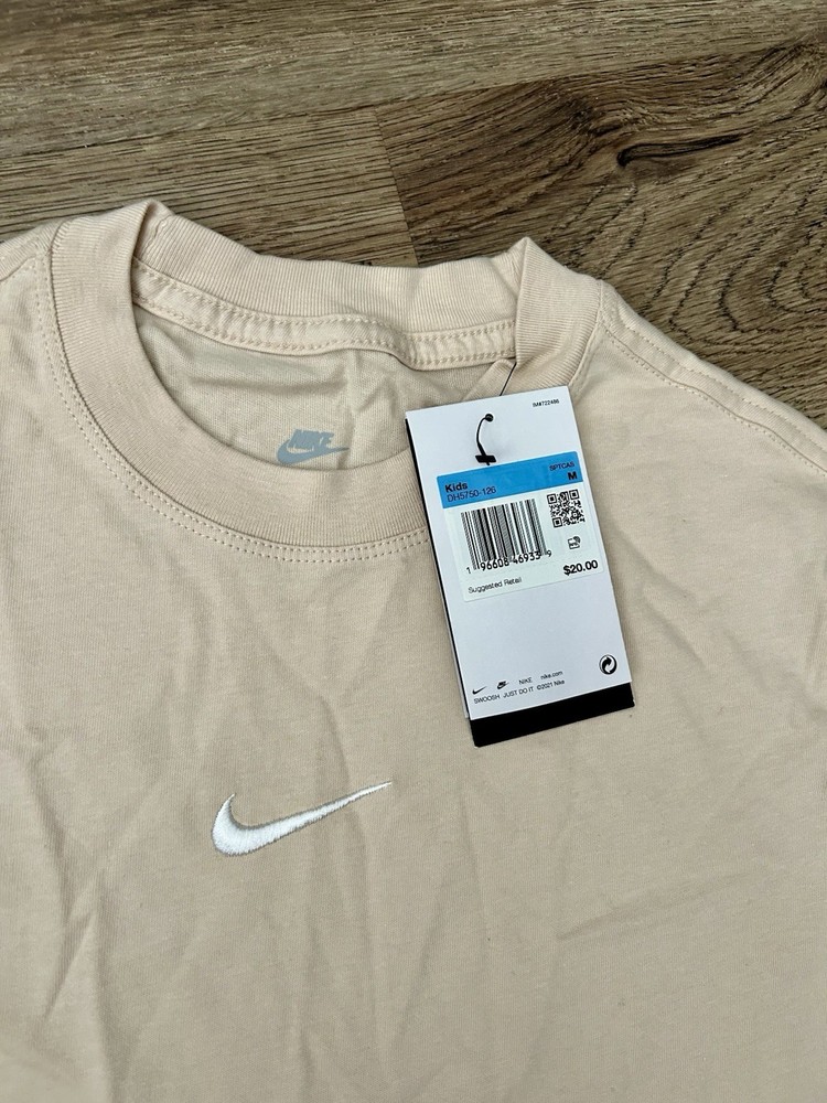 The Nike Sportswear Essential Big Kids' (Girls') T-Shirt in sanddrift color is a comfortable and stylish addition to any casual wardrobe. Made from 100% cotton with a medium fabric wash, this short sleeve tee features a solid beige color with a crew neck and pullover closure. The shirt is accented with the Nike logo and is suitable for activities like walking, making it perfect for summer, fall, and spring seasons. Machine washable for easy care, this basic style t-shirt is a must-have for young girls. New with tags!