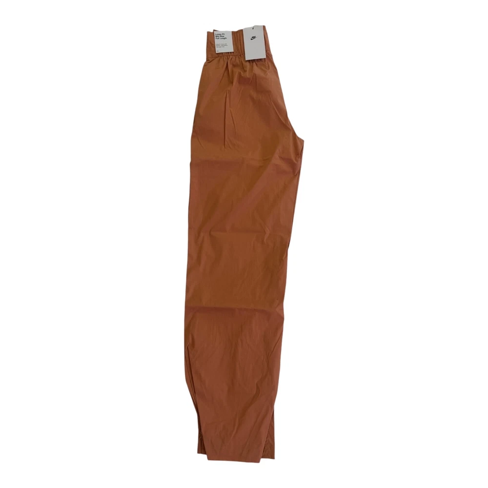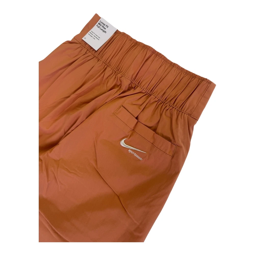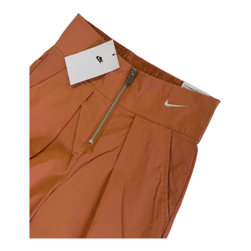 Elevate your activewear collection with these Nike Sportswear Snap Leg Pants in a beautiful peach color. The pants feature a zip front closure, wide-leg style, and a loose fit for maximum comfort during any outdoor or sports activity. The elastic waistband allows for a customized fit, while the pockets provide ample storage for your essentials. These pants are made with a blend of nylon, spandex, and cotton, making them machine washable and easy to maintain. The orange color adds a pop of modern and classic style, while the Nike logo on the front provides a touch of sporty sophistication. Perfect for travel, casual wear, or walking, these pants are a must-have for any women's wardrobe.