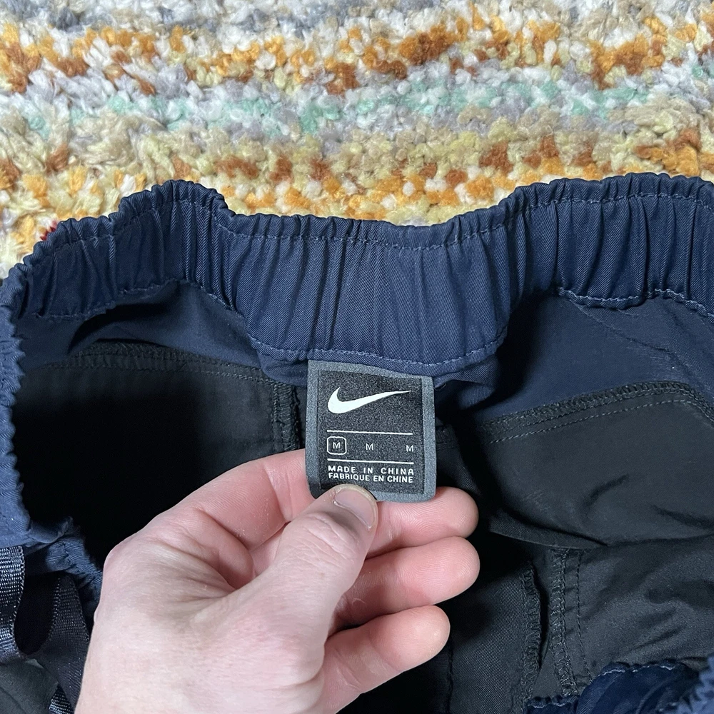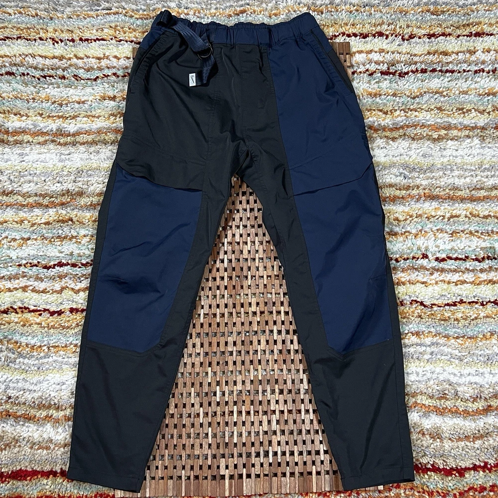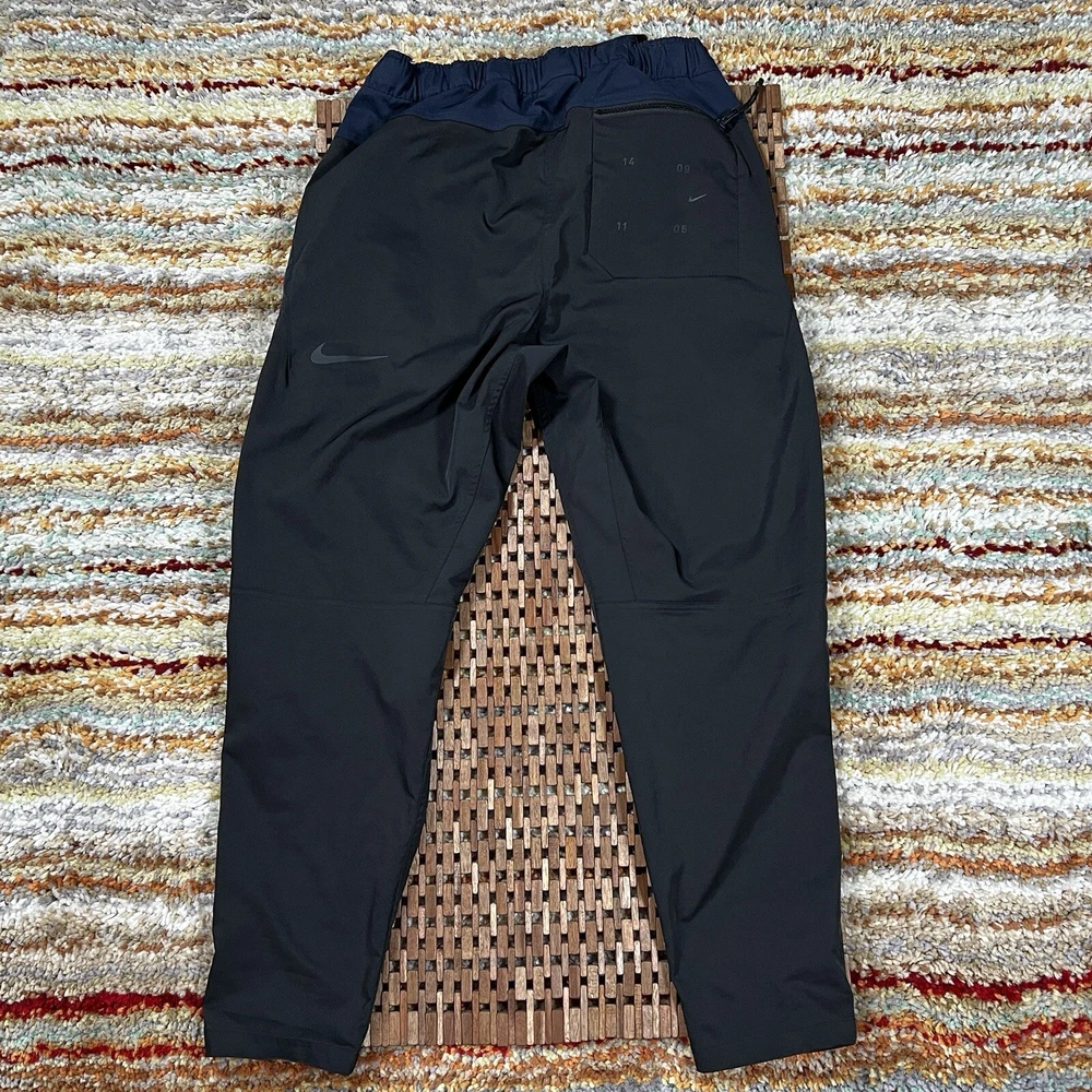 Nike Tech Pack Pants Joggers in black, size M, for men. These regular fit jogger pants feature a woven belted design with a tapered cargo style. The pants are part of the Nike Therma product line, combining functionality and style for a modern gorpcore look. Perfect for casual and active wear.