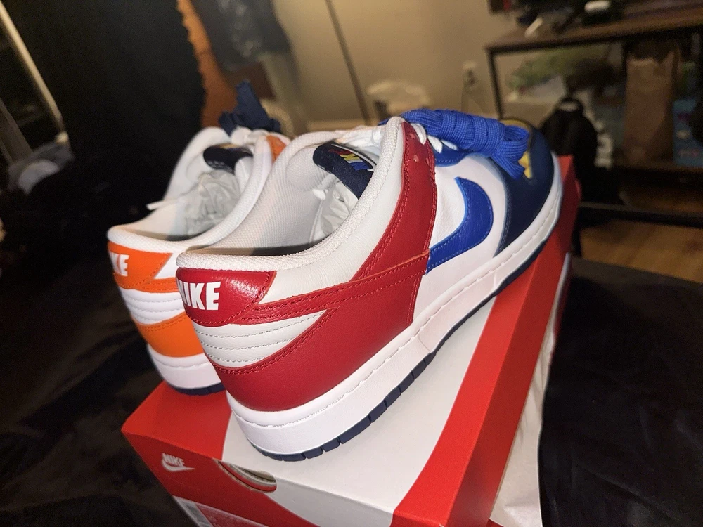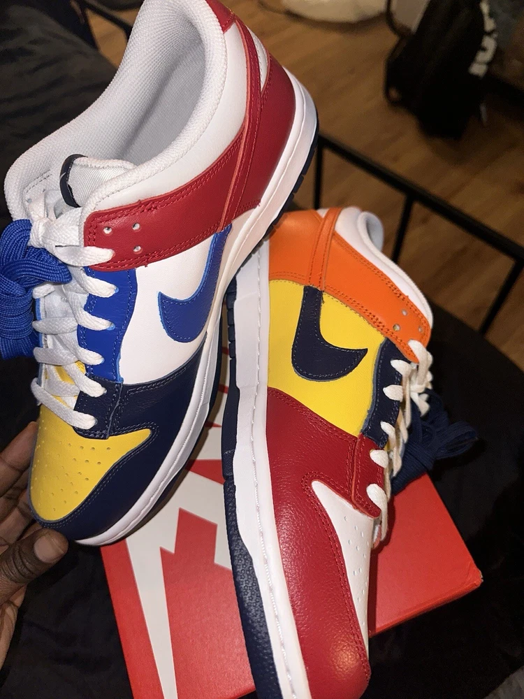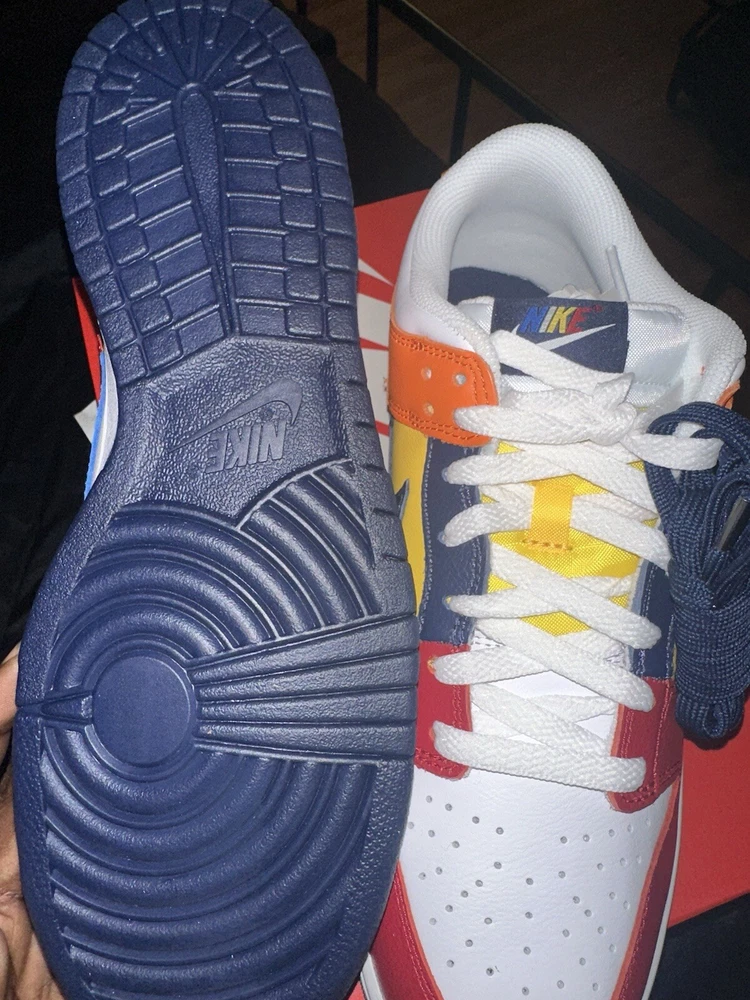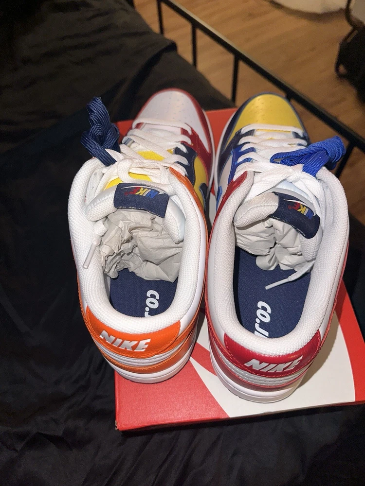 Elevate your casual shoe game with these Nike What The Dunk CO.JP Low sneakers. The colorblock pattern and multicolor design give a retro vibe, while the round toe shape and standard shoe width provide comfort for everyday wear. The leather upper material and foam insole material are cushioned for added support, making them perfect for any casual occasion. The rubber outsole material ensures durability and traction, completing the classic Nike Dunk Low product line. Available in US shoe size 10, these sneakers are a must-have for any sneakerhead's collection.