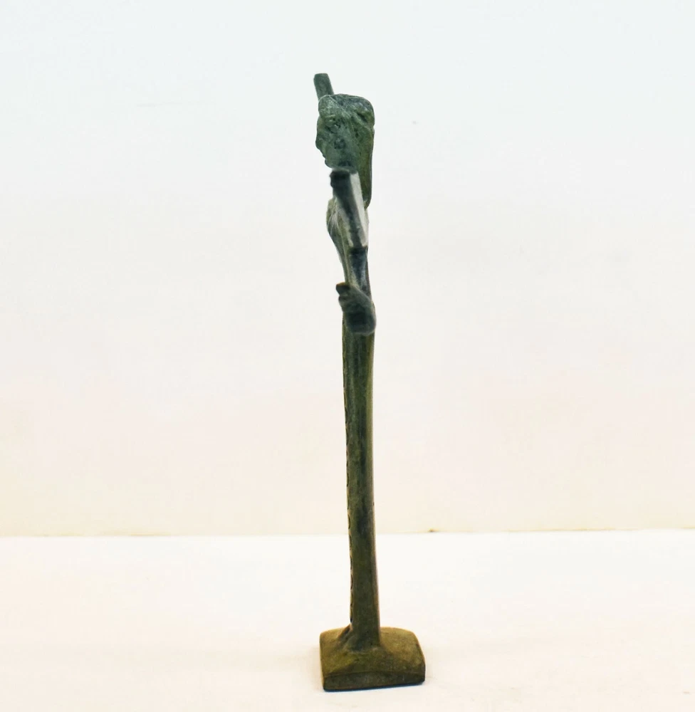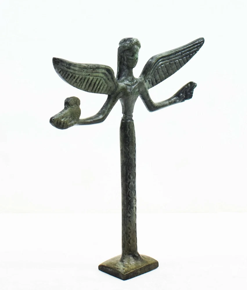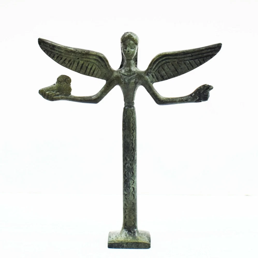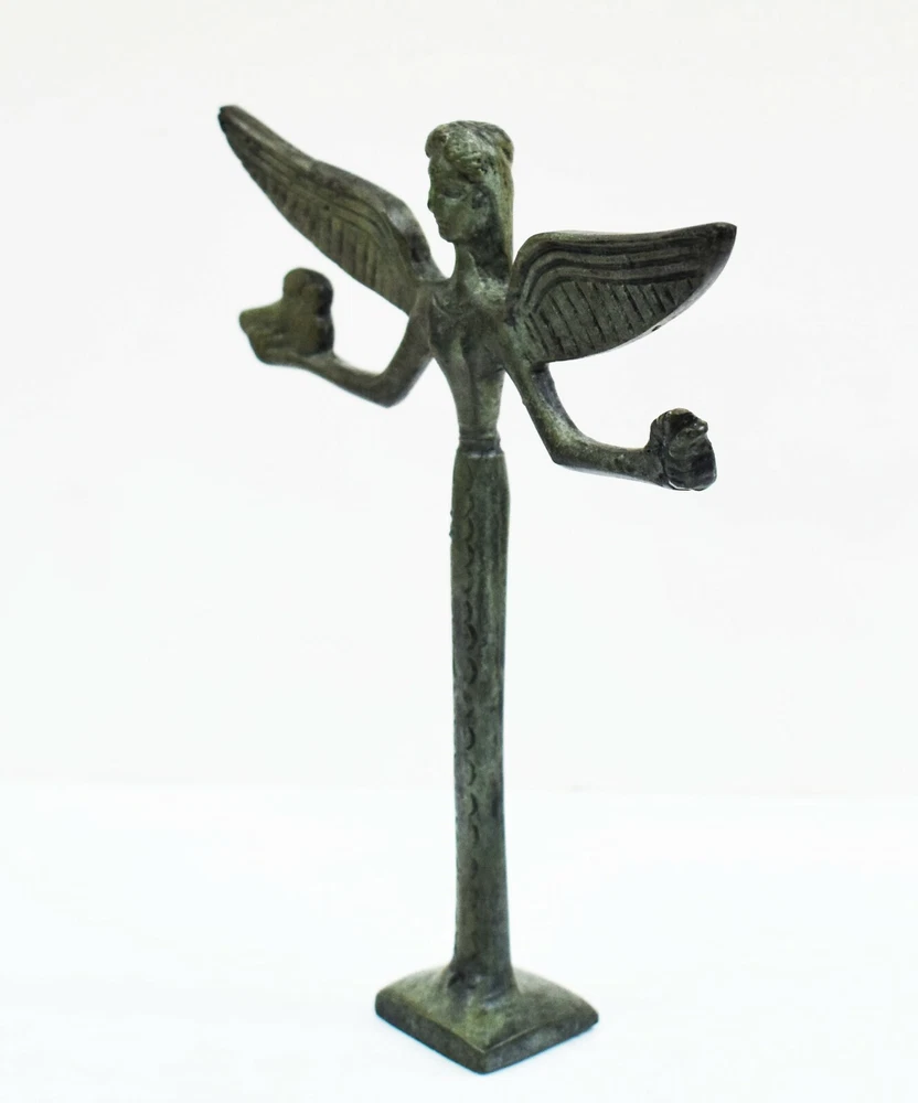 GODDESS NIKE BRONZE FIGURINE In Greek Mythology, Nike was the Goddess of speed, strength and victory. Also known as Winged Goddess, Nike is most often pictured as having wings. She was the child of Pallas (Titan) and Styx In most beliefs, Styx is the name of the river that separates Planet Earth from the Gates of Hell (Hades). Nike’s name means Victory, and the Roman equivalent of Nike was Victoria. As the Greek goddess of Victory, Nike was closely associated with athletics and other contests, as well as warfare. All our bronze items, are cast in Greece, using the traditional 'lost wax' method. As nothing is mass-produced, there will inevitably be slight variations in patination and colouring. Each piece is, therefore, unique.(25-549-A) Details: Condition: New, Handmade in Greece Material: Pure Bronze Height: 15 cm(5.9 inches) Width : 12 cm(4.7 inches) Weight : 200 g