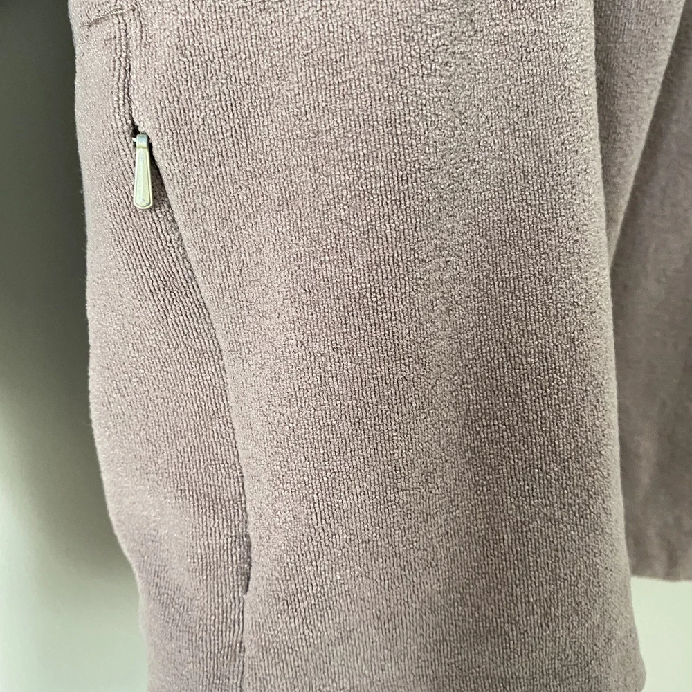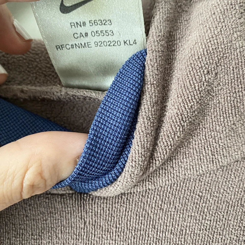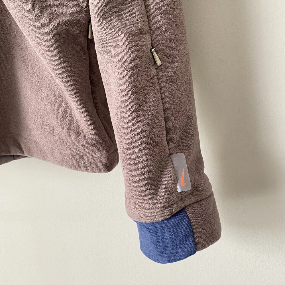 Nike Woman’s Brown French Terry Cloth Navy Accent Active Hoodie Sweatshirt Small Pullover style Drawstring cord waist Navy blue sleeve collar and hood accents Brim on hoodie Zip pockets No stains Small pull on collar Small rip on wrist logo Comes from a smoke free pet free house Size small measures 19.5” pit to pit and 22” in length laying flat