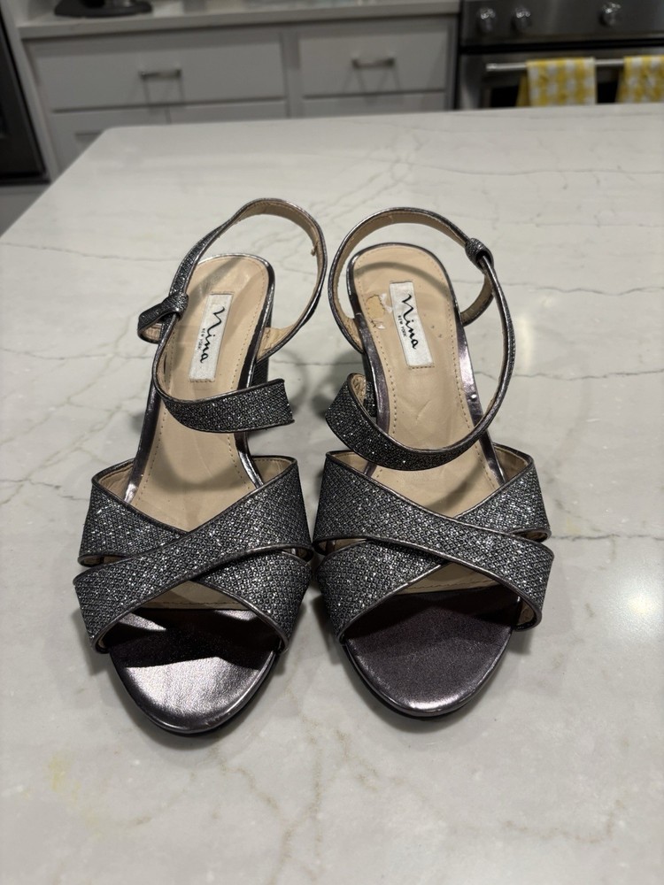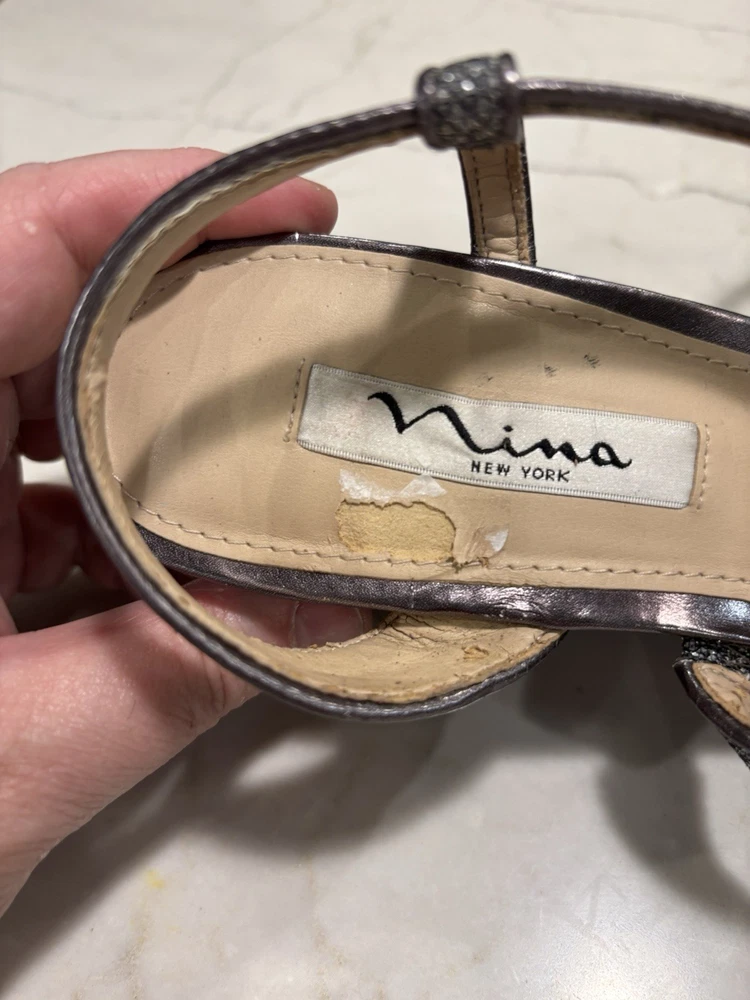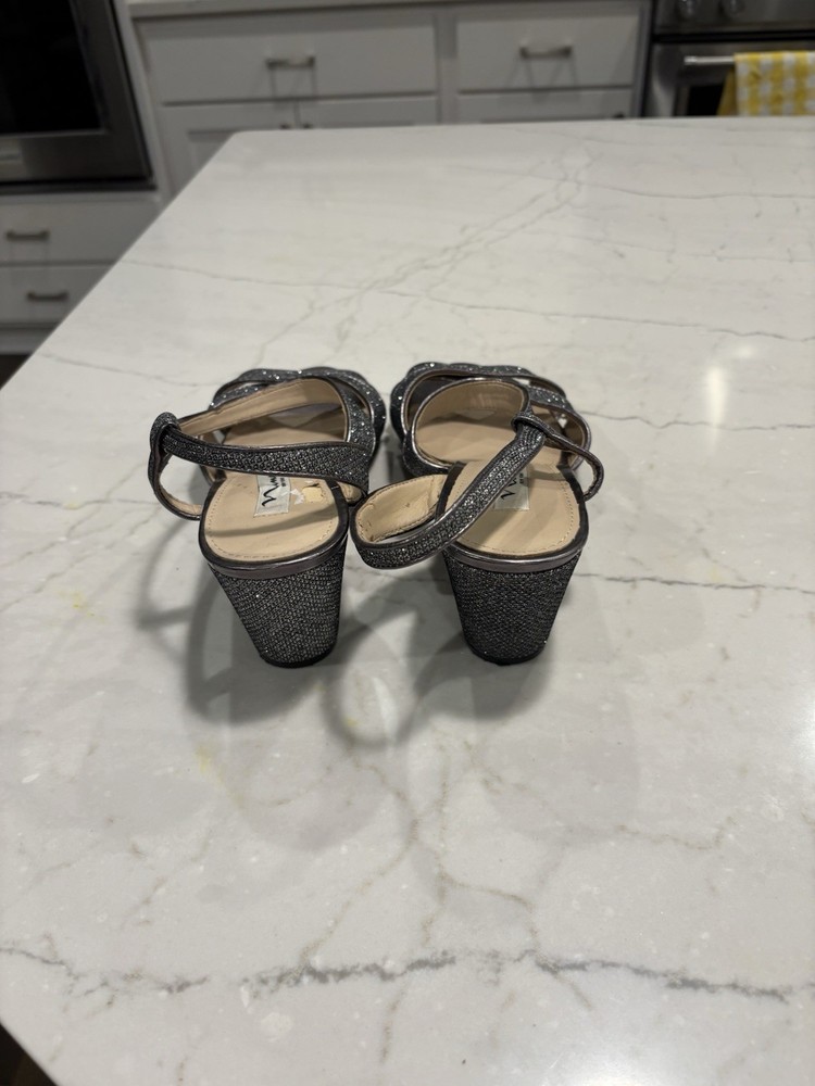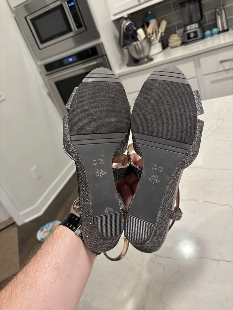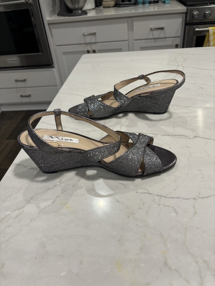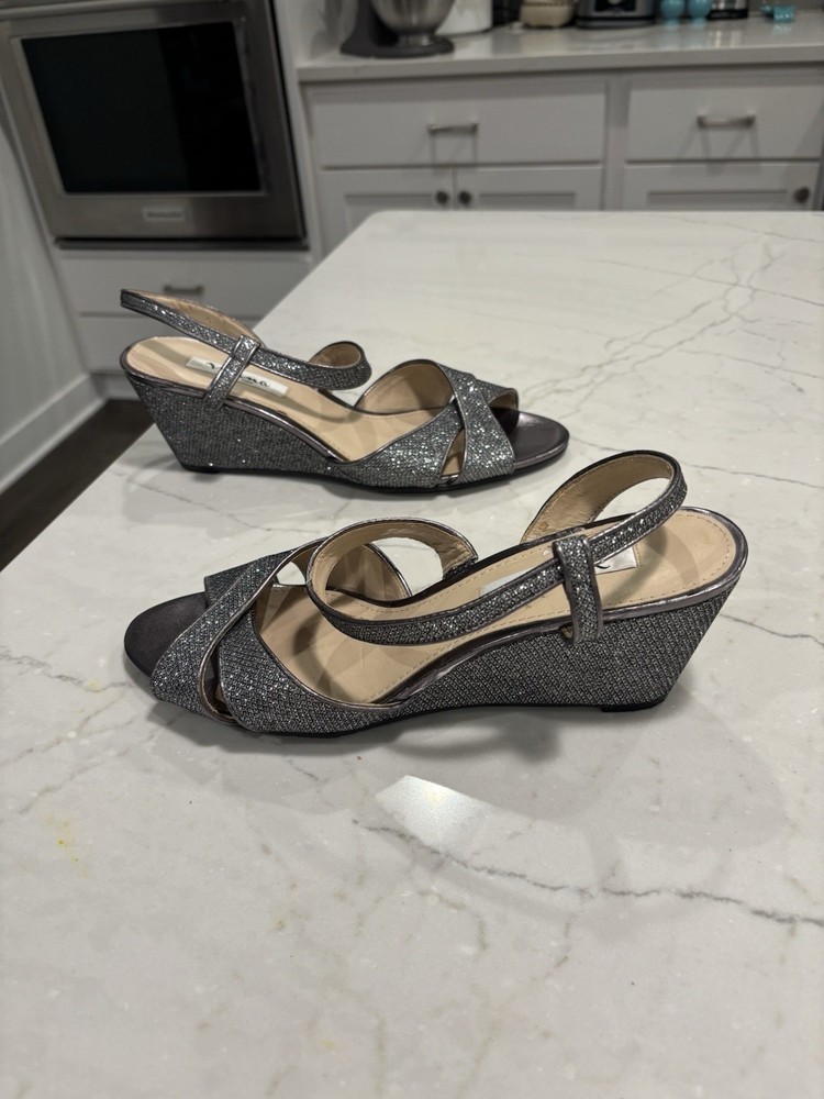 The Nina New York Sparkly Wedge Sandals in Silvery Gray, Size 9.5, are a stylish and trendy choice for women looking to add some sparkle to their footwear. These sandals feature a wedge heel, making them comfortable and easy to wear for extended periods of time. The synthetic upper material adds durability and a touch of elegance to the overall design, making these sandals a versatile and fashionable option for any outfit. Please note: there is an area on the heel bed of one shoe that has some of the top layer of material missing, please see photo.