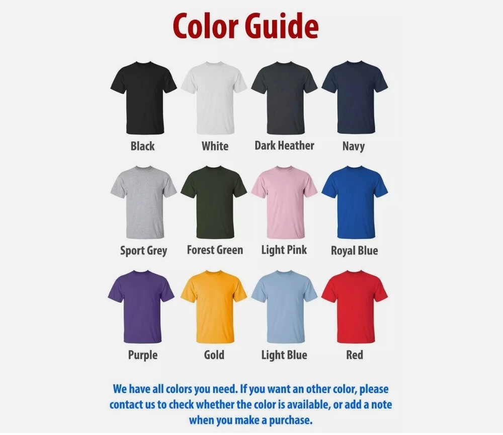 WELCOME TO OUR STORE --------- PRODUCT ---------- Cotton graphic T-shirt, custom t shirts, custom t shirt printing Lightweight, extremely comfortable and durable 100% Cotton High Quality Colors: Multicolore Size: S, M, L, XL, 2XL, 3XL,4XL, 5XL. We have a size chart in the picture, please refer to and choose the right product. ------SHIPPING-------- Every order that we receive is made at the time that we receive it which means it is custom made for you! Processing time: 2-3 business days Shipping time: 5-7 business days Thank you for choosing our products. Please feel free to message us if you have questions or concerns. ------CUSTOMER SATISFACTION-------- We try our very best to make sure every customer is completely satisfied. If there's a problem, message us! We're happy to help. If you like other colors and sizes please contact with us. We have color white, blue, green, ice grey, red, navy, charcoal, sport grey. Please explore our gallery dept t shirt to find the product you want. ------- Thank You!--------