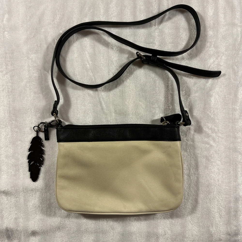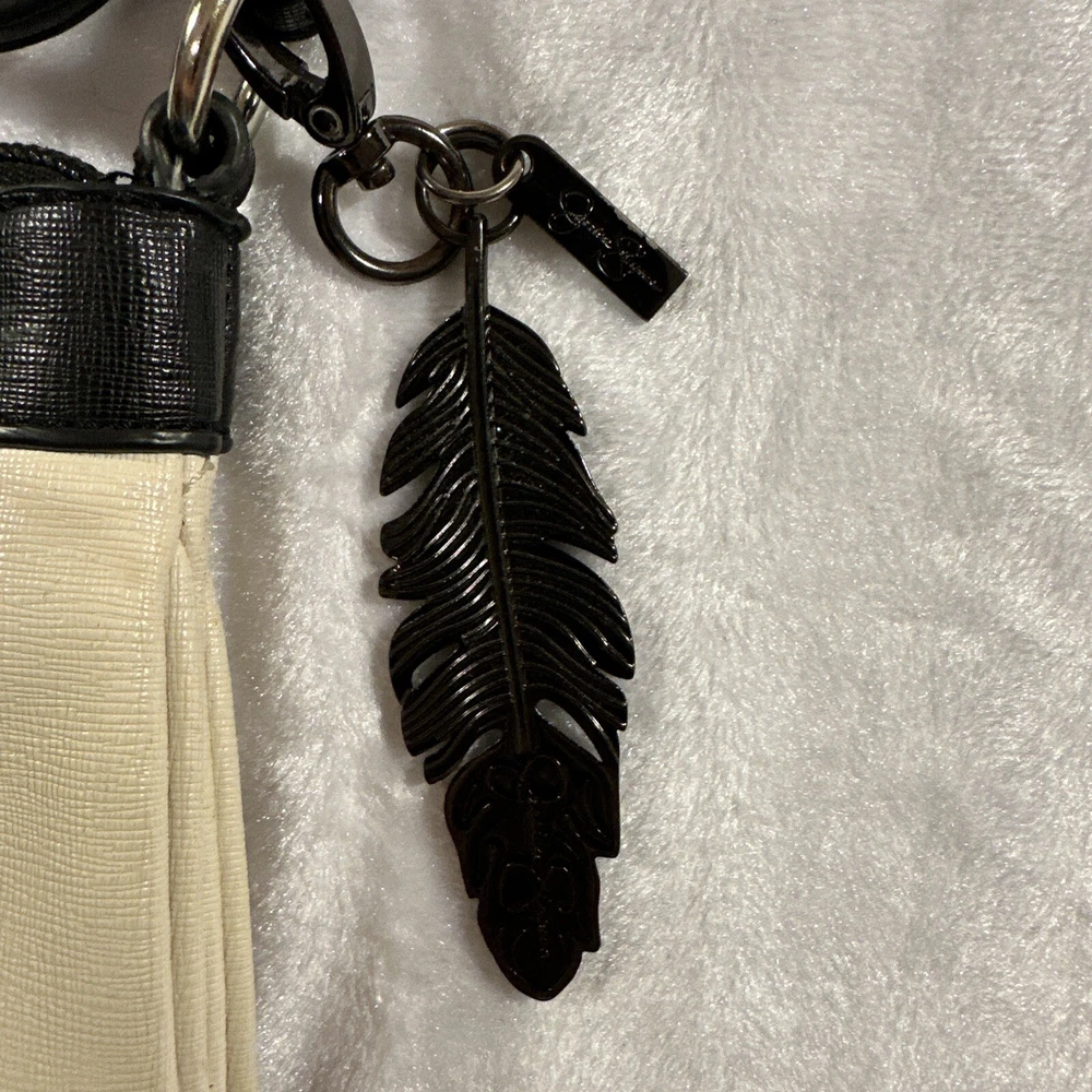 This is nice bag to go out with has a small mark on the front the keychain is awesome a metal feather with a name refer to photo This Nine West shoulder bag is the perfect accessory for any outfit. The exterior is made of faux leather in a multicolor design, featuring a white and black feather pattern. The bag comes with a strap for easy carrying and a keychain for added convenience. This small bag is ideal for women on-the-go, with a stylish design that can complement any outfit. Whether you're running errands or heading out for a night on the town, this Nine West bag is the perfect choice.