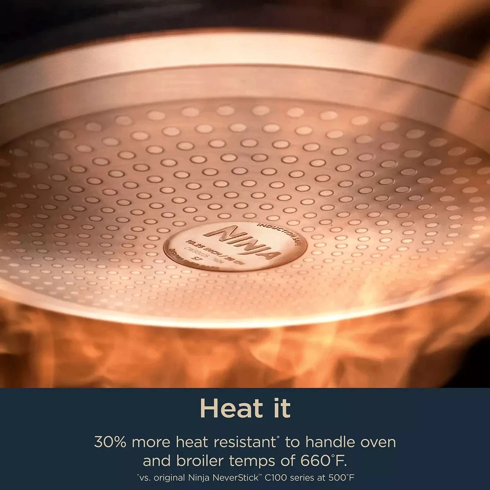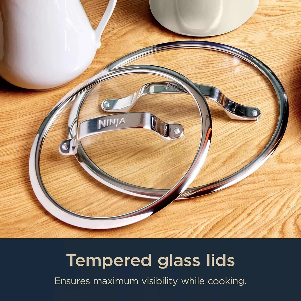 Ninja NeverStick Ceramic Pro 12-Piece Cookware Set, Stone Highlights What's Included: 9.5” Fry Pan with Glass Lid, 10.25” Fry Pan, 12” Fry Pan, 2qt Saucepan with Glass Lid, 3.5qt Saucepan with Glass Lid, 3qt Saute Pan with Glass Lid, 5qt Stock Pot with Glass Lid 4mm thick heavy gauge aluminum base for even heat distribution Pots and pans are oven and broil-capable to 600°F, dishwasher safe, and metal utensil safe. All Range Capable: Compatible with gas, electric, glass ceramic, and induction stovetops Cooking surface made with no PTFE and PFOA, no lead or cadmium Pan: Aluminum, Handle: Stainless Steel Introducing Ninja NeverStick™ Ceramic Pro Cookware Experience the Ninja NeverStick™ Ceramic Pro cookware, a game-changer in your kitchen. This isn't just nonstick, it's NeverStick™, crafted to be 100% PTFE free. The Ceramic Pro Promise ensures long-lasting use and a worry-free cooking experience without sacrificing the NeverStick™ performance. The cooking surface is free from PTFE, PFOA, lead, cadmium, and hard anodization, giving you peace of mind while cooking. Revolutionary Design and Construction Our exclusive construction delivers the 100% performance of NeverStick™ without the use of PTFE. This cookware is 5x more scratch-resistant compared to Caraway ceramic coated cookware, allowing you to use any utensil without worry. It's also 3x more scrub resistant, withstanding harsh brushes and sponges, and 20% more heat resistant, able to handle oven and broiler temperatures up to 600°F. Long-Lasting Performance and Durability The exclusive NeverStick™ cooking surface with deeper embedded NeverStick™ primer unlocks unmatched cooking capabilities. The 4mm thick heavy gauge aluminum base ensures even heat distribution, eliminating hot spots. The sleek flat, fitted tempered glass lids provide convenient storage and maximum visibility while cooking. Built for Versatility and Compatibility The pots and pans in this set are broil-capable to 600°F, dishwasher safe, and metal utensil safe, making them a versatile addition to any kitchen. They are also compatible with a variety of stovetops, including gas, electric, glass ceramic, and induction. 12.5" x 9" W x 7.5" H 22.7 lbs