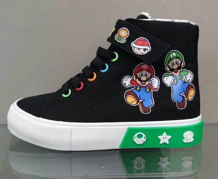 Step up your little one's shoe game with these stylish and comfortable Nintendo Super Mario sneakers. Featuring a high top shoe shaft style, lace-up closure, and round toe shape, these shoes are perfect for casual occasions and walking. The black canvas upper material is accented with a Luigi logo, making it a fun addition to any outfit. The moderately cushioned level and synthetic outsole material ensure durability and comfort for all-day wear. These shoes are available in size 13 and are suitable for boys. They are part of the Nintendo product line and are perfect for fans of the cartoon, TV, and movie characters. Get these trendy sneakers for your little one today!