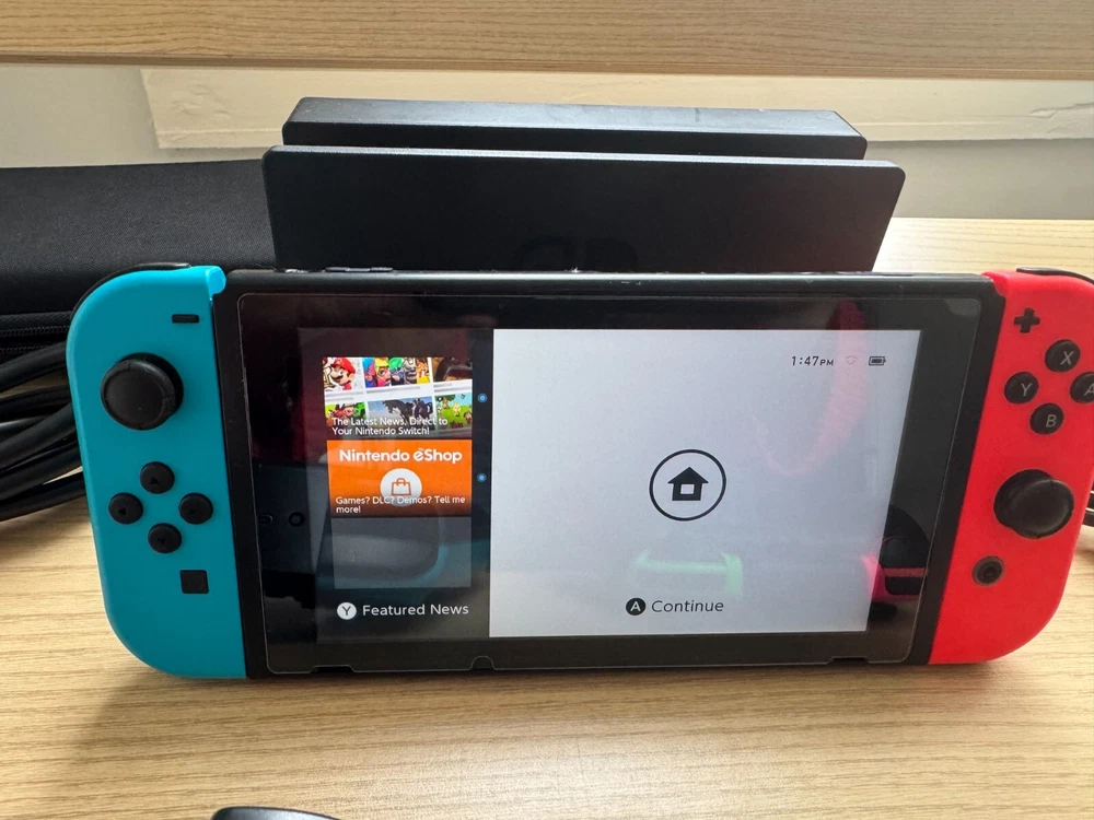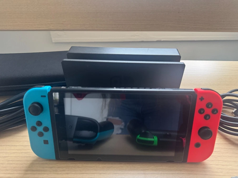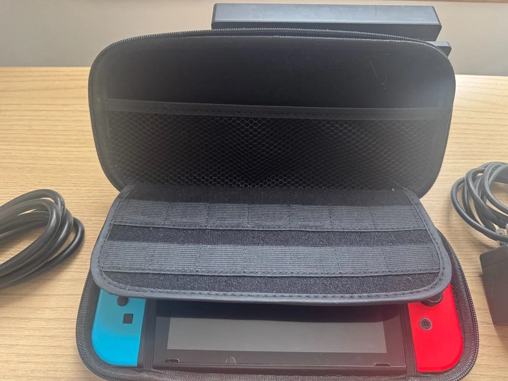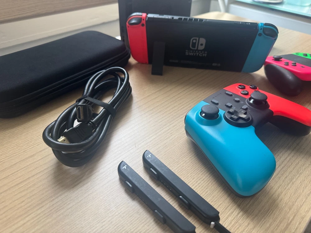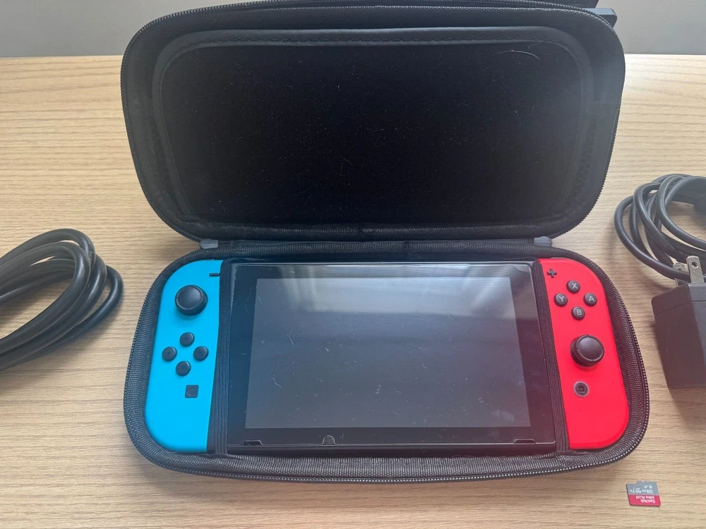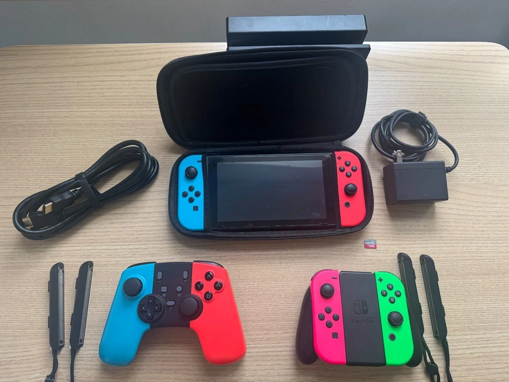Items: Nintendo Switch Console Original Nintendo Docking Station Original Nintendo Power Adapter Original Blue and Red Nintendo Joy Cons with side button holders Original Nintendo Joy Con Controller holder Nintendo Pink and Green Joy Con set with side button holders 3rd party controller with bluetooth connectivity and USB-C charging Carrying Case HDMI Cord 128GB SanDisc MicroSD card The console has been factory reset and is in perfect working condition. Please feel free to ask any questions or OBO. This Nintendo Switch is in great condition without scratches or marks. The console comes with the original TV docking station, original blue and red joy cons, original power adapter, original joy con controller holders, and an HDMI cord. Included in this purchase are an extra set of joy cons in green and pink/red coloring, a carrying case, a 128 GB SanDsic microSD card, and a 3rd party controller with bluetooth connectivity and USB-C charging.