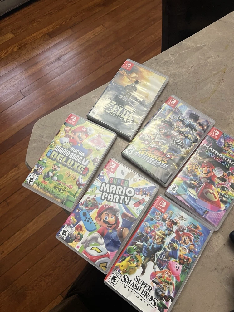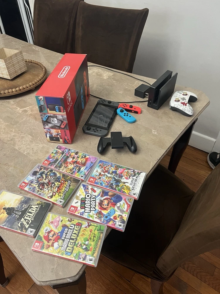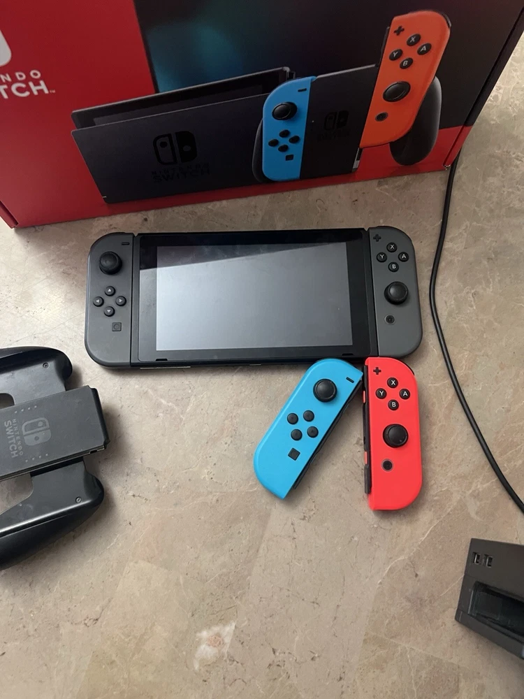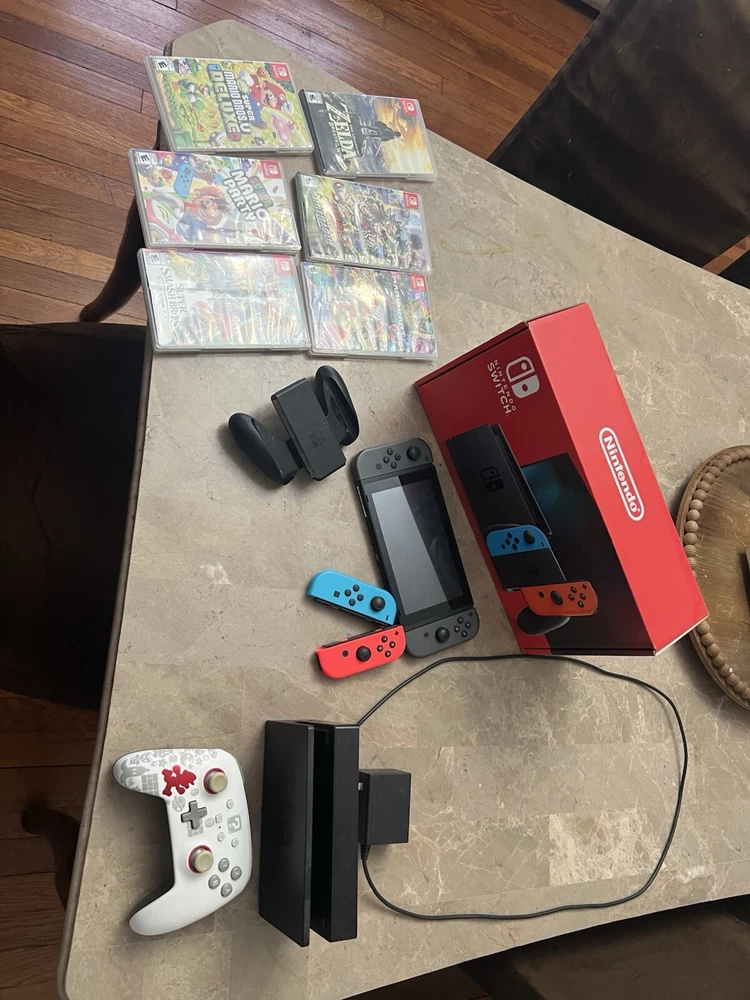 Nintendo Switch everything works fine comes with 6 games 64 GB sd card already inside extra pair of joycons and an extra controller everything is in good condition dock included and charger included