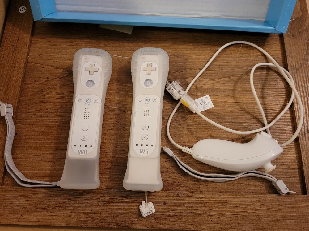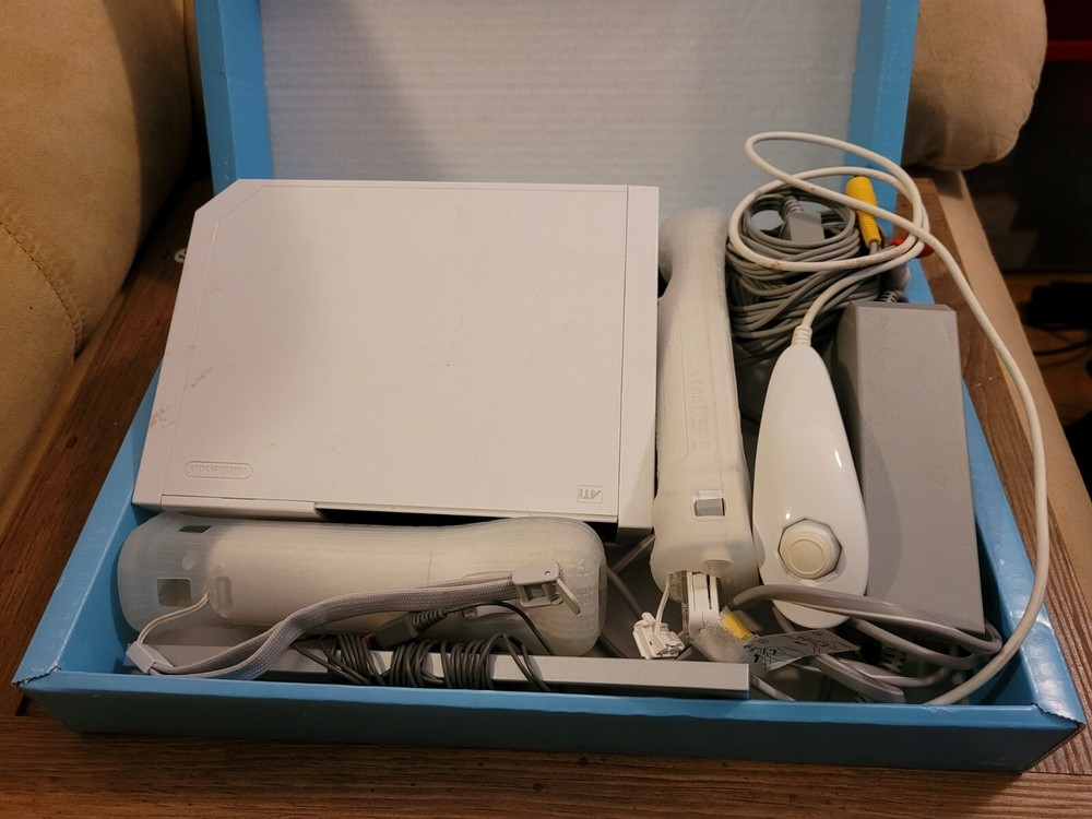 Nintendo Wii Console W/ 2 Games, Accessories, Box And Controllers Tested Working. Wii Sports console and 2 video games. In original box, box has some wear. Includes: Wii Console, console stand, 2 Wii remotes/ controllers with jackets, Nanchuck, Sensor bar, AC adapter and AC cable. Does not include sports disc. Includes Rayman Raving Ribbons 2 and Spore Hero Wii games, both complete with manuals. Pre-owned, tested and working.